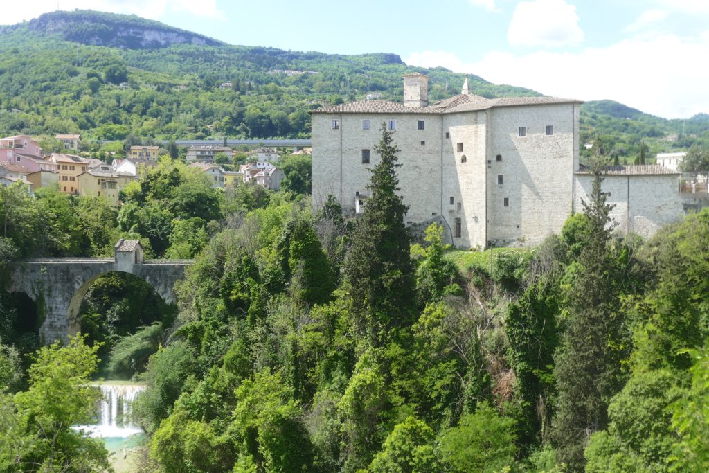 Nach so viel Kultur wollen wir heute wieder in die Natur. Von unserem Stellplatz in Foligno fahren wir in den Nationalpark der Monti Sibillini. Der Nationalpark umschließt das gleichnamige Gebirge, dessen höchster Gipfel des Gebirgsmassivs der Monte Vettore mit seinen 2476 Metern ist. Die Landschaft dieser Gegend ist daher die typische Hochgebirgslandschaft, in der sich sanfte Berghänge und steile Felsrücken abwechseln. Da das Wetter heute noch recht unbeständig ist, fahren wir erst einmal nur bis Serravalle die Chienti auf einen sehr schönen Stellplatz, wo wir mal wieder ganz allein sind. Da im Moment die Sonne lockt, wandern wir hinauf zum Montelago-Pass wozu wir ca. 400 Höhenmeter überwinden müssen. Da uns unterwegs mehrere kräftige Schauer erwischen, sind wir froh, dass wir auf einer Asphaltstraße laufen. Anschließend sehen wir uns den kleinen Ort an.
