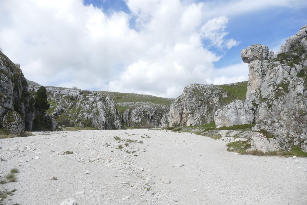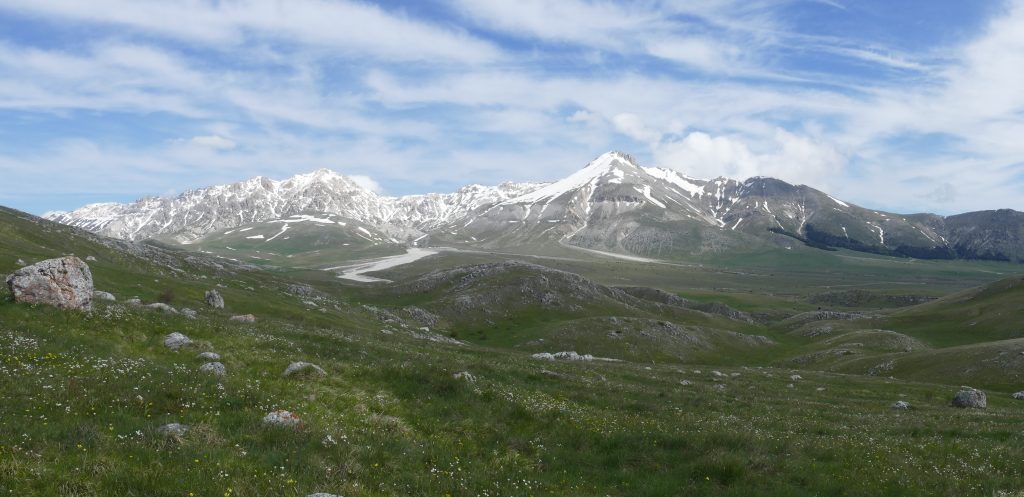 Das Wetter ist uns heute hold für unsere wunderschöne Panoramastrecke „Anello da Castel del Monte al Canyon Scoppaturo (Gran Sasso)“. Vom Dorf steigen wir in ca. 45 Min. über 300 Höhenmeter hinauf und befinden uns in einer traumhaften Landschaft, in der noch die Spuren früherer Bewirtschaftung zu erkennen sind. Ein schöner Wanderweg führt uns unterhalb des Monte Bolza immer weiter in Richtung Campo Imperatore. Wir haben fantastische Ausblicke auf die Berge der Gruppo del Gran Sasso: Monte Camicia und Tremoggia e Siella, Monti Infornace, Prena sowie auf die Majella Gruppe und den Canyon dello Scoppaturo. Dann müssen wir über eine bunt blühende Wiese zum Canyon dello Scoppaturo hinabsteigen. Die Unebenheiten sind anstrengend, doch der anschließende Weg durch den Canyon ist traumhaft schön. Auf unwegsamen Wiesen folgt ein Abschnitt, wo wir mehrmals auf und absteigen müssen, bis wir zu einem breiten Schotterweg stoßen, auf dem wir Castel del Monte erreichen. Nach einer Pause fahren wir weiter nach Rocca-Calascio, ein winziges Dorf mit einer gigantischen Aussicht. Calascio ist Teil des Gebiets der Berggemeinde Campo Imperatore – Piana di Navelli und gehört zum Nationalpark Gran Sasso e Monti della Laga.
