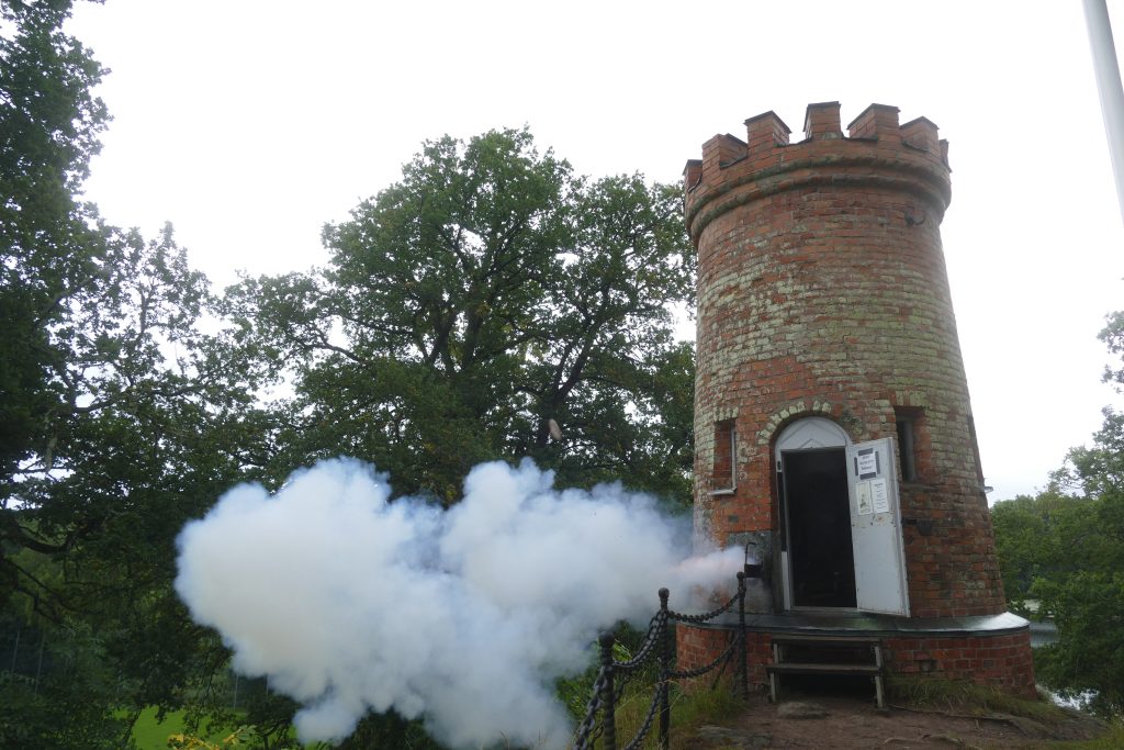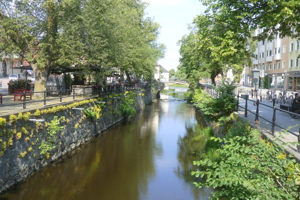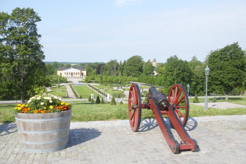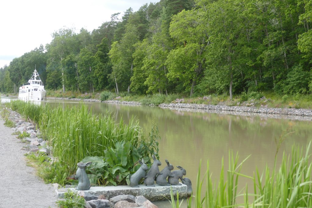 Der Morgen begleitet uns mit Nieselregen als wir weiter nach Åtvidaberg fahren. Hier befindet sich die einzige noch funktionierende Sonnenkanone weltweit. In einem kleinen Turm auf einem Hügel steht diese ungewöhnliche Kanonenuhr. Wenn die Sonne ihren höchsten Stand erreicht hat, bündelt eine Linse das Sonnenlicht auf eine kleine Ladung Schwarzpulver, die in eine 6-Pfund-Kanone geladen ist. Da heute keine Sonne scheint, wird sie per Hand gezündet. Ein lauter Knall und jeder in der Stadt weiß, dass es Mittag ist. Nach diesem einzigartigen Spektakel fahren wir weiter in die malerische und mittelalterliche Kleinstadt Söderköping am Göta Kanal. Wir parken auf einem Wanderparkplatz am Ramunderberg nicht weit von einem kleinen Aussichtspavillon, zu dem wir auch gleich gehen und die Aussicht genießen. Von hier führen 318 Stufen hinunter in die Stadt. Wir gehen ein Stück am Göta Kanal entlang bis zum Kunstwerk Rabbit Crossing. Die Flucht aus der ländlichen Umgebung hat die Wälder um den Berg Ramunderberget erreicht und nun sind die Kaninchen unterwegs in die Stadt. Die aus dem späten 13. Jahrhundert stammende Sankt Laurentii Kyrka mit einem mit Holzschindeln gedeckten Dach und dem Glockenturm, die uns gleich von oben aufgefallen ist. Nach dieser kleinen Stadtbesichtigung gehen wir zurück zum Parkplatz.