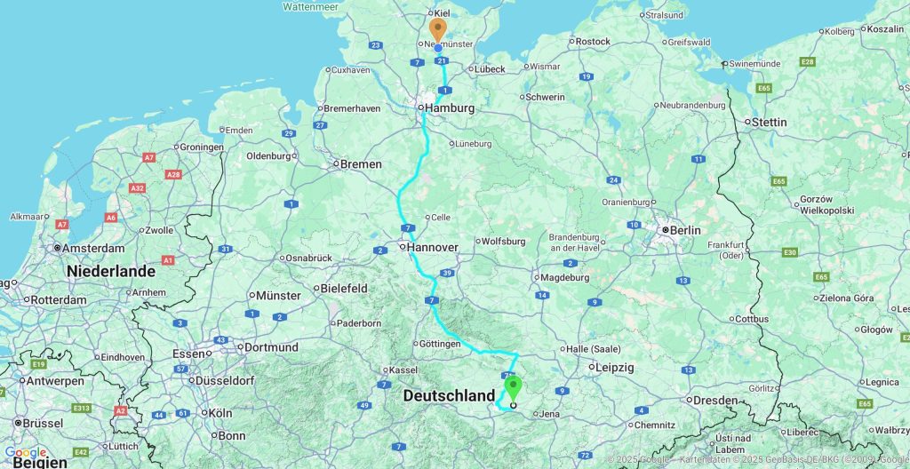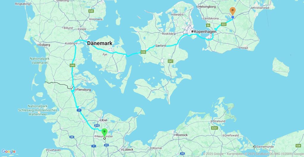 Nachdem uns unser Wohnmobil gestern noch ganz schön auf Trab gehalten hat, geht es nun doch heute los. Da unser Kühlschrank bei 30 °C am gestrigen Tag nicht angesprungen ist, fahren wir zuerst zu Fritz Berger nach Erfurt. Leider ist der Kühlschrankventilator, den wir uns ausgesucht haben, nicht verfügbar. So machen wir uns auf den Weg Richtung Hamburg und kommen auch gut voran. Wahrscheinlich hat die Hitzewarnung für den heutigen Tag viele Autofahrer abgeschreckt. Vor Hamburg ist es kurzzeitig etwas zähflüssig. Ein glücklicher Umstand ist, dass unser Stellplatz für die Nacht Richtung Lübeck ist und wir so östlich an Hamburg vorbeifahren, ohne durch die vielen Baustellen zu müssen. Am Nachmittag kommen wir in Trappenkamp an und vertreten uns noch etwas die Beine.