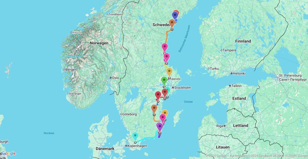 Das gestrige Gewitter am Abend hat eine Abkühlung von 39° C auf 15° C gebracht. Am Morgen ist der Himmel noch grau, doch das ändert sich schon bald. Wir fahren weiter Richtung Flensburg und müssen irgendwo noch tanken. Doch heute sind die Preise in den Himmel geschossen und wir müssen recht teuer tanken, um durch Dänemark zu kommen. Hinter Flensburg sind wir dann schon in Dänemark, dass wir auf der Vogelfluglinie über die Storebælt und die Øresundsbron Brücke durchqueren. Wir passieren Malmö und fahren nach Lund. Hier wollten wir eigentlich bleiben, doch die Parksituation ist schwierig und gefällt uns nicht. So fahren wir noch etwa 40 km weiter in Richtung Hörby, wo wir auf einem schönen Wanderparkplatz im Naturgebiet Fulltofta inmitten der Natur nach 555 km parken.