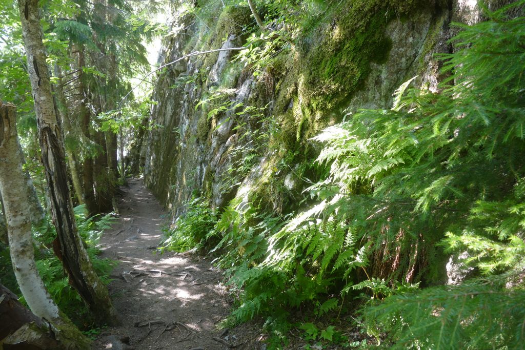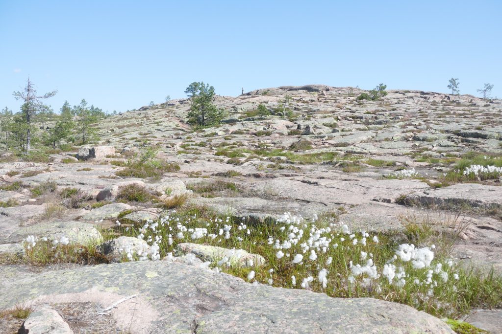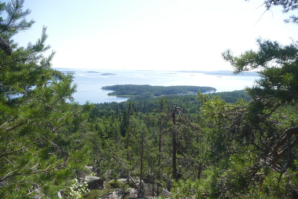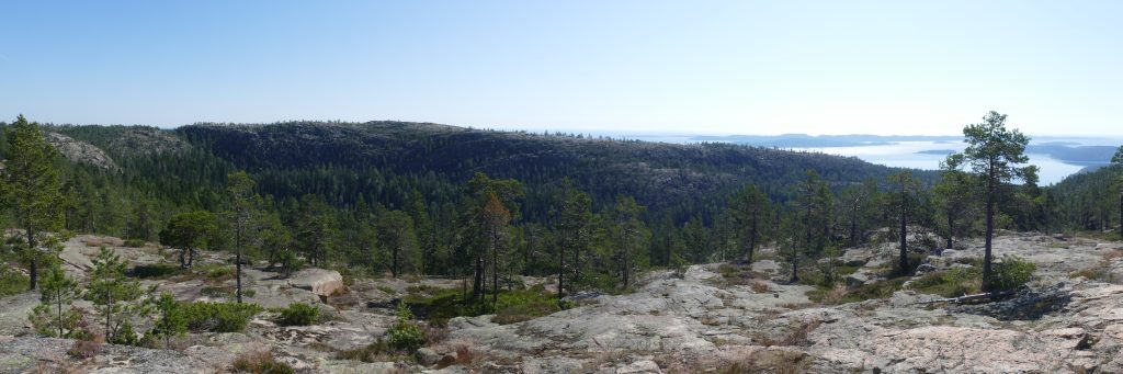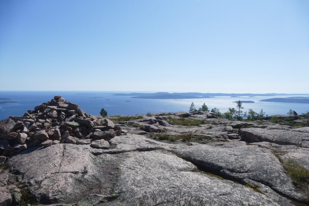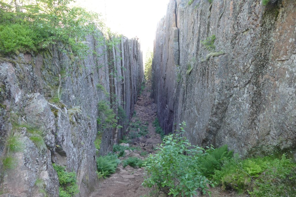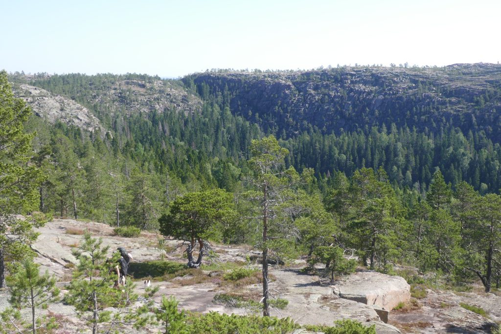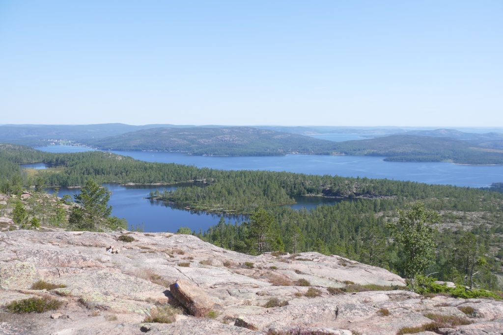 Heute haben wir uns das beliebteste Ziel in Nationalpark vorgenommen, die Slåttdalsberget mit Slåttdalsskrevan, eine 200 Meter lange, 30 Meter tiefe und 7 Meter breite Gletscherspalte, die den Slåttdalsberget in zwei Teile teilt. Vom Gipfel des Slåttdalsberget haben wir einen fantastischen Blick auf den Skuleskogen und die gesamte Höga Kusten Region. Wir wandern durch Wälder über Wurzeln und Granitplatten, an feuchten Stellen auch auf Holzbohlen mit zahlreichen Ausblicken. Nordwestlich der Felsspalte steigen wir auf einen Hügel mit toller Aussicht. Anschließend nehmen wir den Abstecher über Slåttdalsberget, wo wir ein steiles Stück mithilfe von Seilen bewältigen müssen. Hier ist der Blick auf die Höga Kusten fantastisch. Von hier nehmen wir ein Stück des Höga-Küsten-Wanderwegs in Richtung Süden zum bewachsenen Südhang des Moberget, der aus rötlichem Nordingrå-Granit besteht. Vom Südeingang des Nationalparks folgen wir dem Weg zum Skrattabborrtjären und wieder über den Längtjären zurück zu unserem Parkplatz. Insgesamt war der Weg doch recht anspruchsvoll mit fast 18 km und 576 Höhenmetern. Im Anschluss fahren wir zum Nordeingang des Nationalparks.