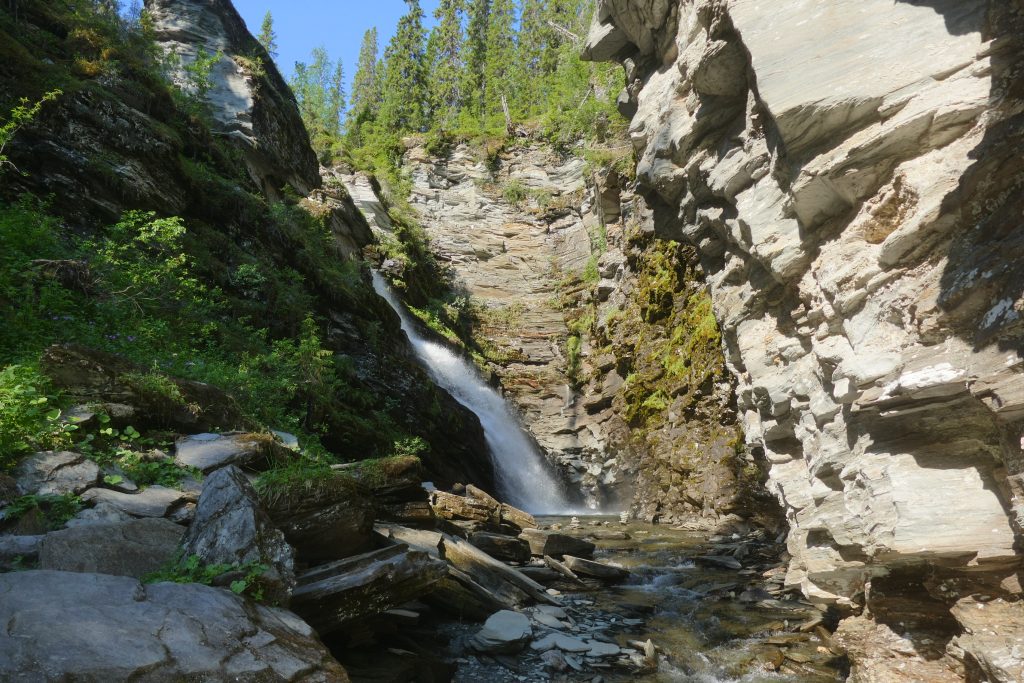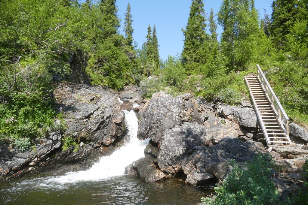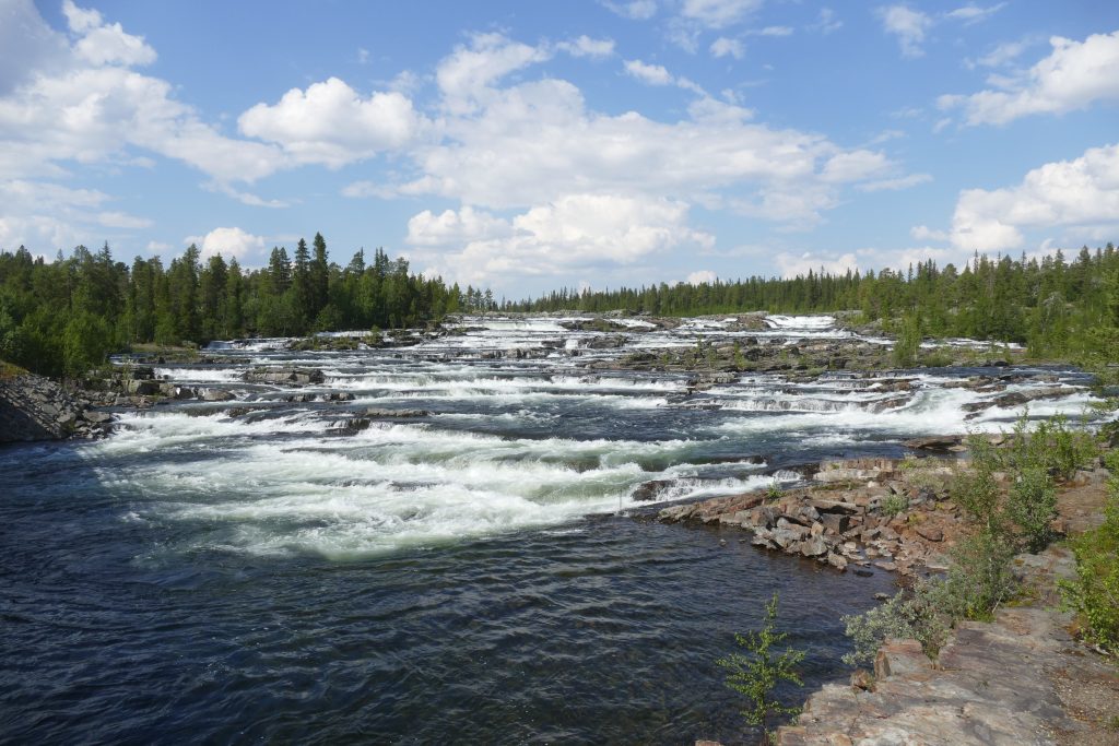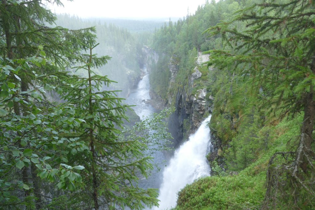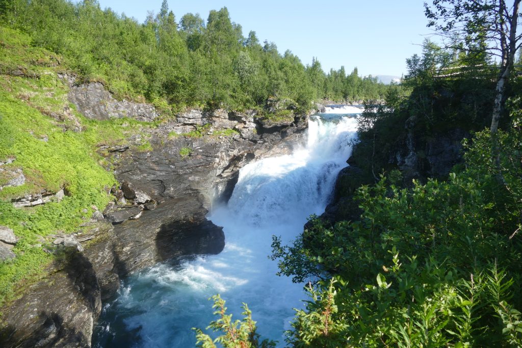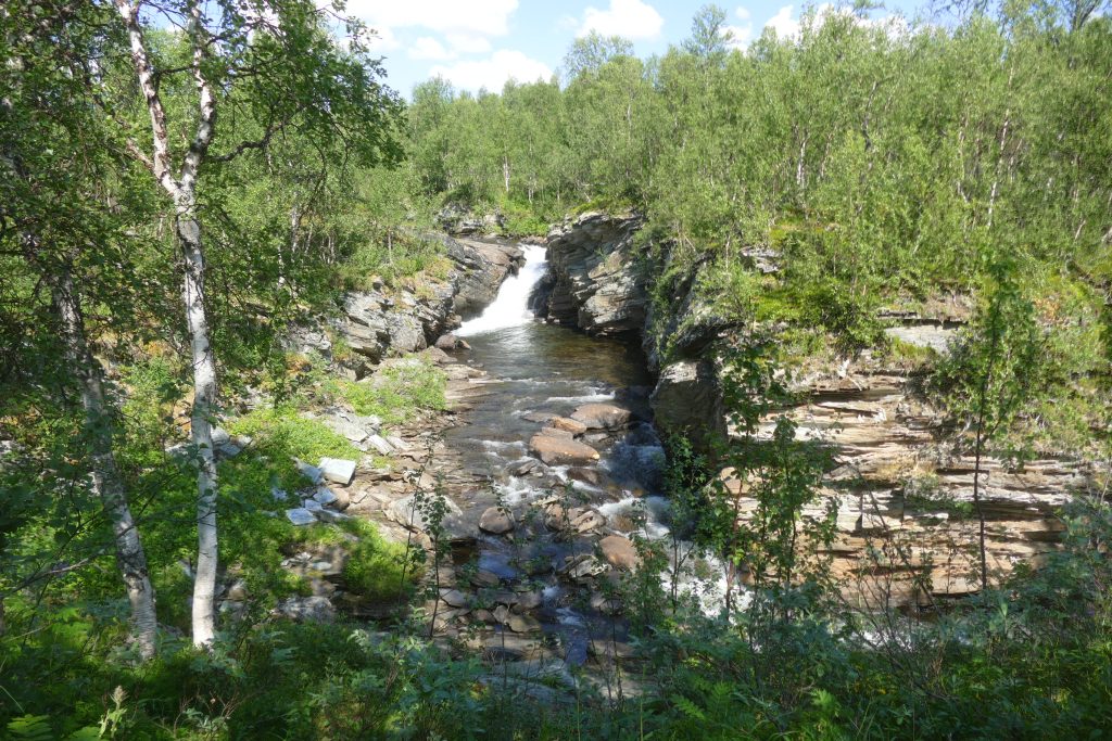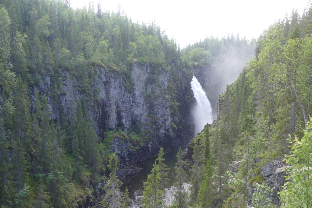 Heute fahren wir den Vildmarksvägen bis Stalon. Hier treffen wir auf den Sagavägen und biegen in nördliche Richtung ab. Wir kommen ein Stück durch das Naturreservat Marsfjäll bis Dikanäs und fahren noch weiter nach Kittelfäll. Hier wollen wir uns einer ersten Herausforderung stellen, indem wir auf den Kittelfjaellet auf 1.220 m hinauf wandern. Die 785 Höhenmeter sind bei fast 30° C eine echte Herausforderung. Zuerst geht ein schmaler Pfad durch Wald, der sich schon bald lichtet. Wir folgen den Steinmännchen stetig bergan. Kurz vor dem Gipfel kommt plötzlich eine Herde Rentiere auf uns zu. Alle Mühen sind vergessen. Am Gipfel wollen wir eine Rast einlegen, doch die beißenden Plagegeister vermiesen uns die Pause. Wir steigen ab, und schon steht die nächste Herausforderung vor uns. Kein Weg zu sehen, über Geröll und typische Hochgebirgsvegetation tasten wir uns langsam bergab. Als wir endlich die Skistation erreichen, ohne Schaden genommen zu haben, sind wir froh. Im Anschluss fahren wir weiter auf dem Sagavägen. Unterwegs kommen wir zum Fättjaur-See. Direkt an der Straße befindet sich ein kleiner Badeplatz, den wir für eine Abkühlung nutzen. Dann sind es noch ca. 30 km bis zu unserm Stellplatz in der Nähe von Skalmodal an einem schönen Wasserfall.