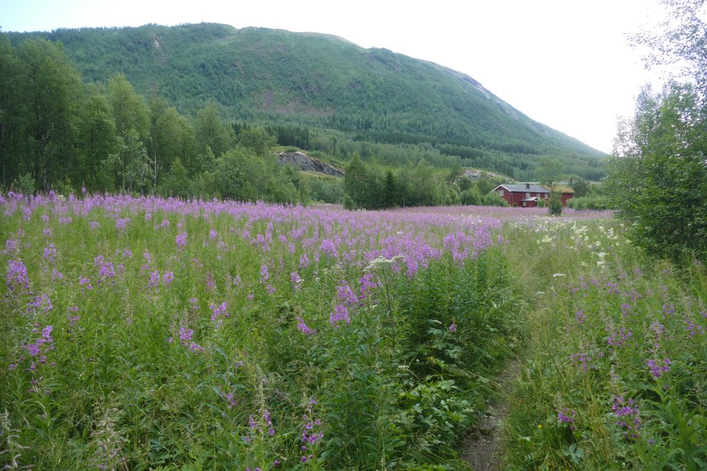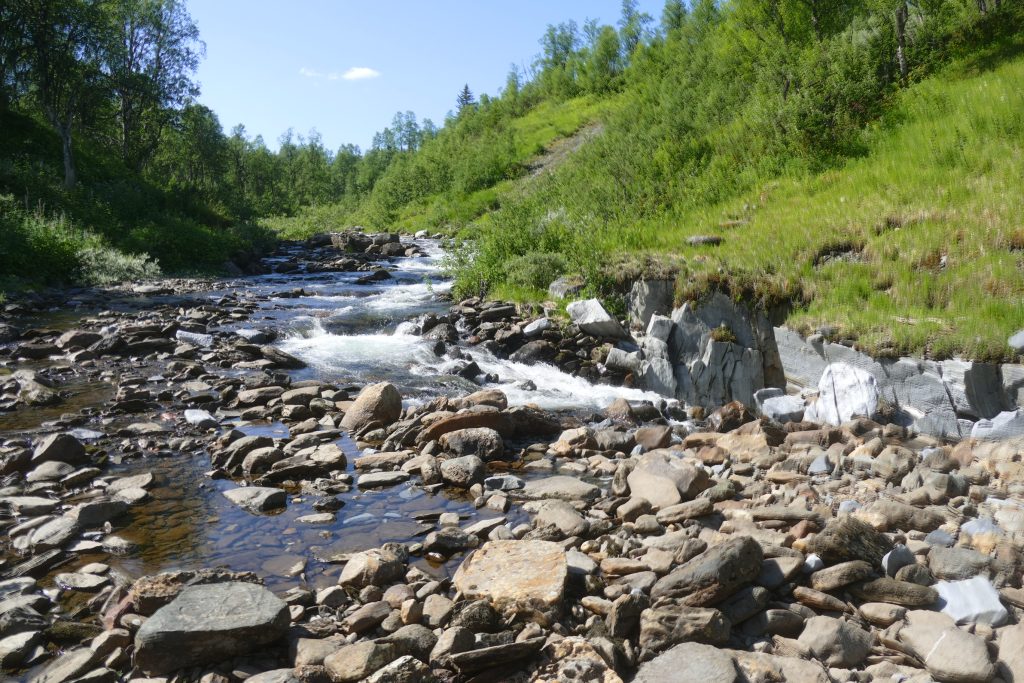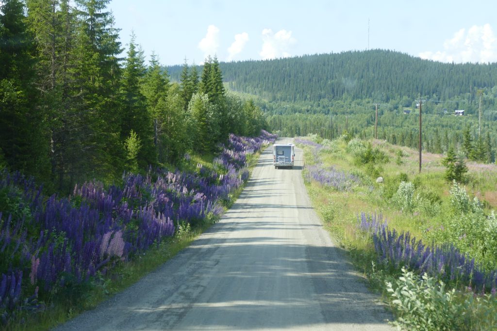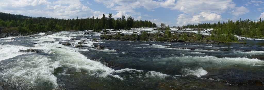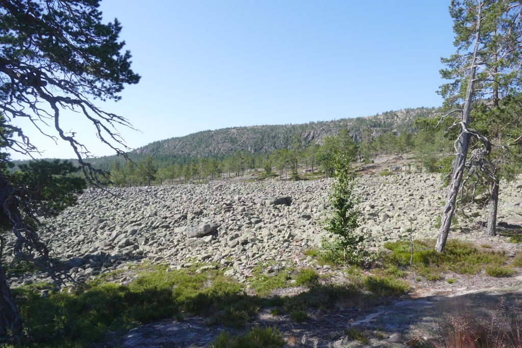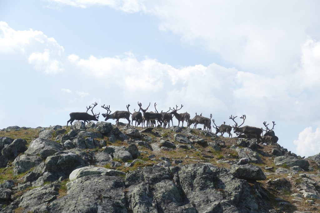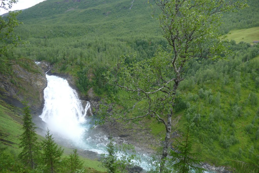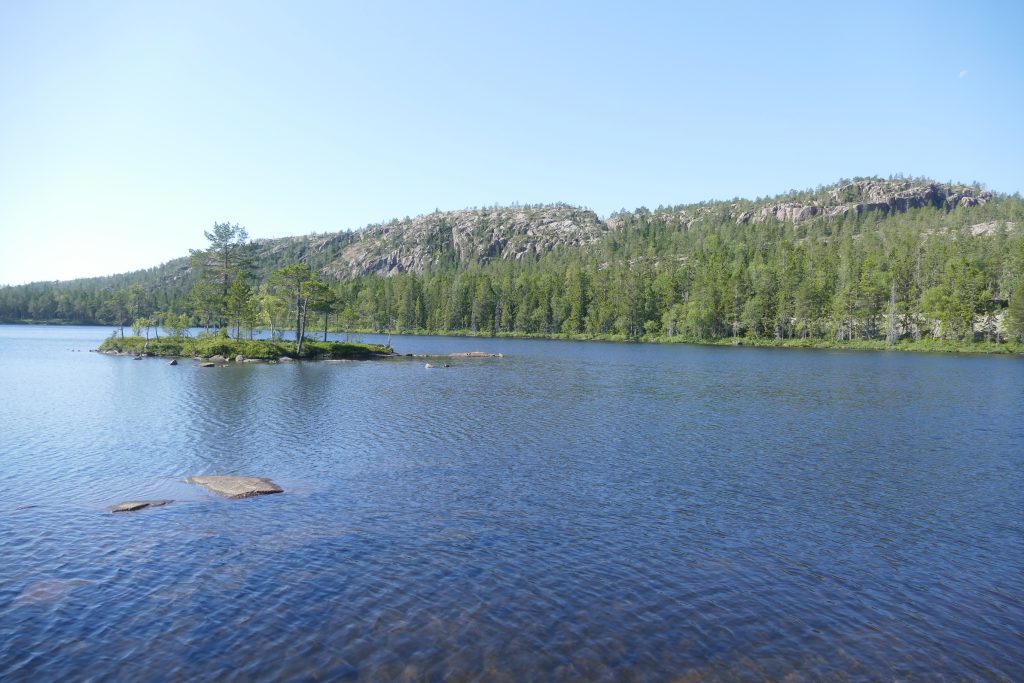 Heute fahren wir den Vildmarksvägen bis Stalon. Hier treffen wir auf den Sagavägen und biegen in nördliche Richtung ab. Wir kommen ein Stück durch das Naturreservat Marsfjäll bis Dikanäs und fahren noch weiter nach Kittelfäll. Hier wollen wir uns einer ersten Herausforderung stellen, indem wir auf den Kittelfjaellet auf 1.220 m hinauf wandern. Die 785 Höhenmeter sind bei fast 30° C eine echte Herausforderung. Zuerst geht ein schmaler Pfad durch Wald, der sich schon bald lichtet. Wir folgen den Steinmännchen stetig bergan. Kurz vor dem Gipfel kommt plötzlich eine Herde Rentiere auf uns zu. Alle Mühen sind vergessen. Am Gipfel wollen wir eine Rast einlegen, doch die beißenden Plagegeister vermiesen uns die Pause. Wir steigen ab, und schon steht die nächste Herausforderung vor uns. Kein Weg zu sehen, über Geröll und typische Hochgebirgsvegetation tasten wir uns langsam bergab. Als wir endlich die Skistation erreichen, ohne Schaden genommen zu haben, sind wir froh. Im Anschluss fahren wir weiter auf dem Sagavägen. Unterwegs kommen wir zum Fättjaur-See. Direkt an der Straße befindet sich ein kleiner Badeplatz, den wir für eine Abkühlung nutzen. Dann sind es noch ca. 30 km bis zu unserm Stellplatz in der Nähe von Skalmodal an einem schönen Wasserfall.