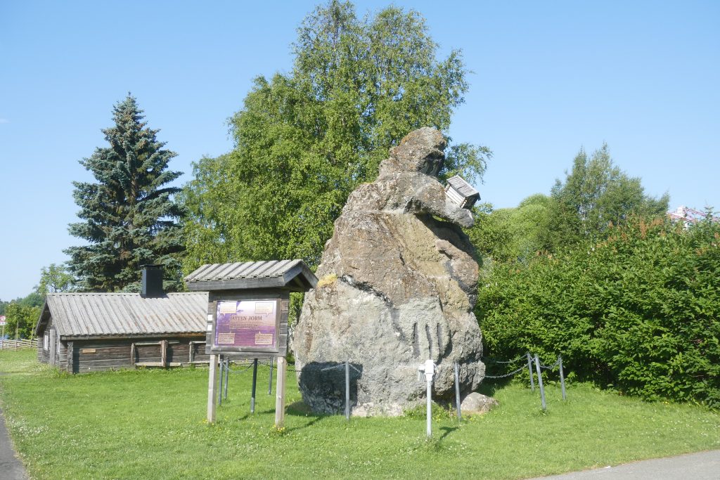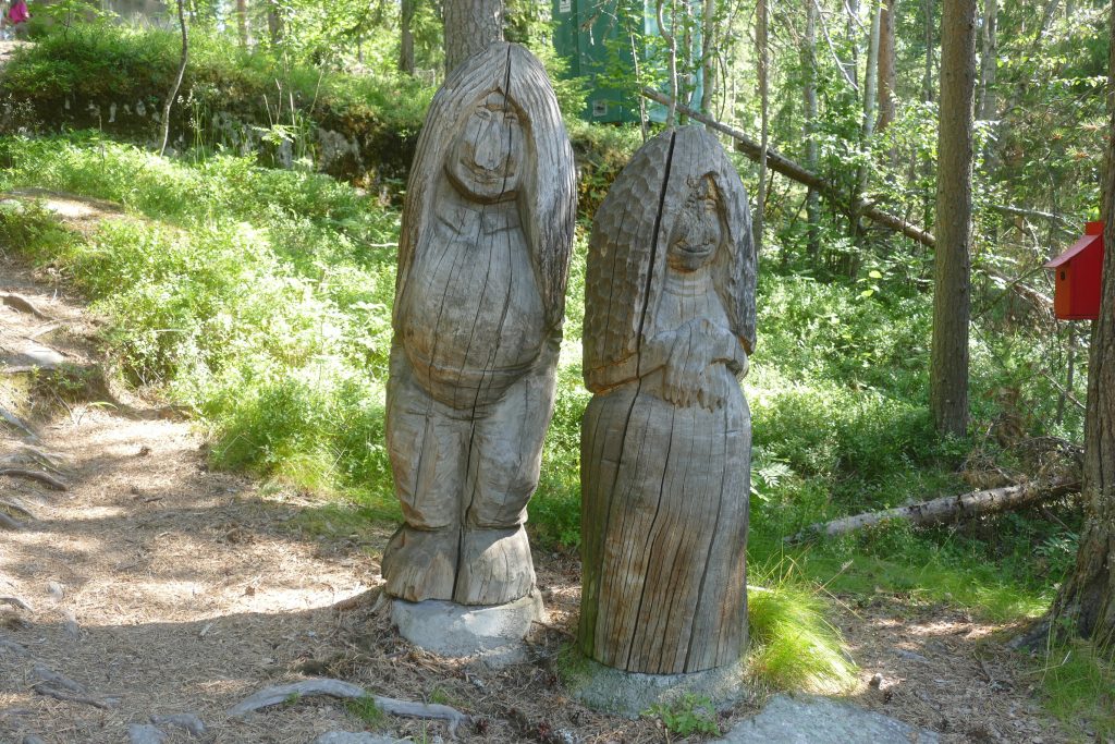Wir fahren nach Strömsund zum Freilichtmuseum Ströms Hembygdsgård direkt an der Brücke über den See Ströms Vattudal. Der sechs Meter große sprechende Riese Jorm, eine Märchenfigur aus dem Film Dunderklumpen, steht am Eingang des Freilichtmuseums mit verschiedenen historischen Gebäuden. Leider sind diese verschlossen. Wir fahren weiter auf dem Vildmarksvägen bis zu einem der höchsten Wasserfälle in Schweden, dem Hällingsåfallet. Er stürzt in eine über 40 Meter tiefe Schlucht und mündet dann in einen engen Canyon. Nach 800 Metern weitet sich der Spalt, und das Wasser verteilt sich in ein ruhiges Flussbett, das nach drei Kilometern in den Hetögeln-See fließt. Vom Parkplatz nehmen wir den ausgeschilderten Wanderweg, der durch wilden Wald bis zum Beginn des Canyons führt. Nach dem gestrigen Regen am Abend sind wir ein gefundenes Fressen für die Mücken. Dann stehen wir vor einer beeindruckenden Schlucht mit fast senkrechten Steilwänden. Wir wandern hinauf bis zum Wasserfall, den wir schon bald tosen hören. Eine Brücke führt über den Wasserfall, unter der der Hällingsåfallet tosend und donnernd 40 m in den Abgrund stürzt. Ein Nebelschleier liegt über der Schlucht. Und als wir uns gerade auf den Rückweg machen wollen, entlädt sich eine Wolke über uns. Pitschnass nehmen wir die Schotterstraße zurück zum Wohnmobil und fahren weiter nach Gäddede. Den ausgesuchten Parkplatz gibt es nicht mehr. So fahren wir weiter auf dem Vildmarksväge bis zu einem Parkplatz direkt an der Straße, jedoch mit schönem Blick auf den Kycklingvattnet.