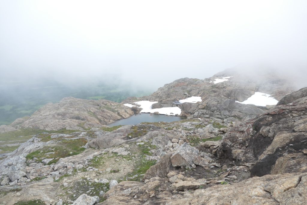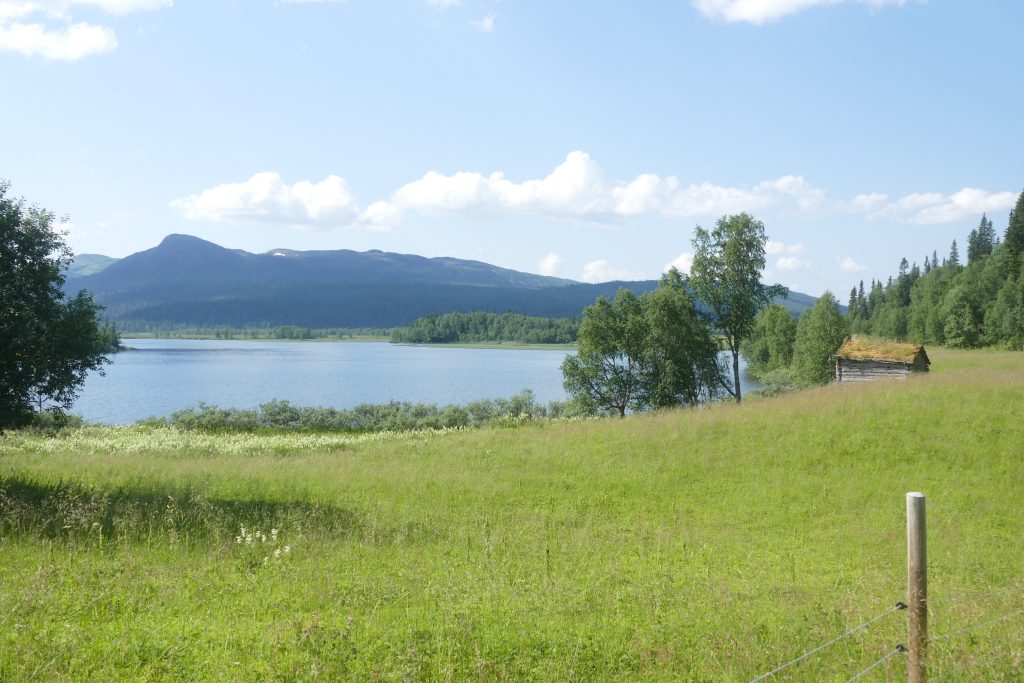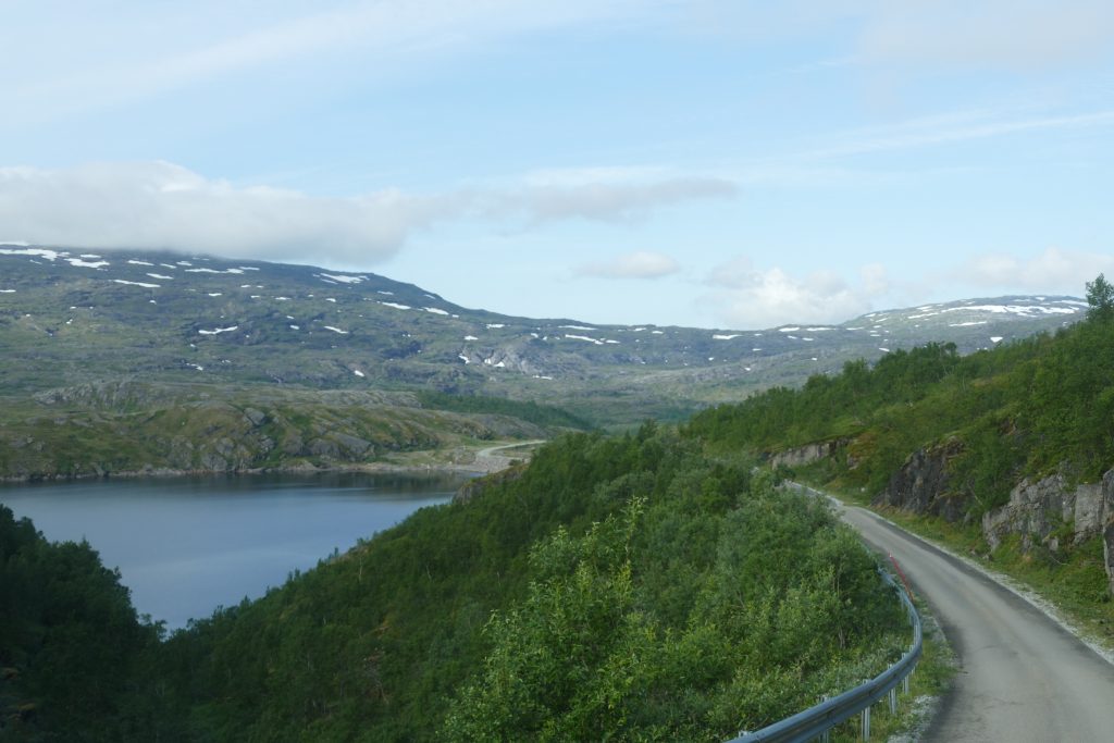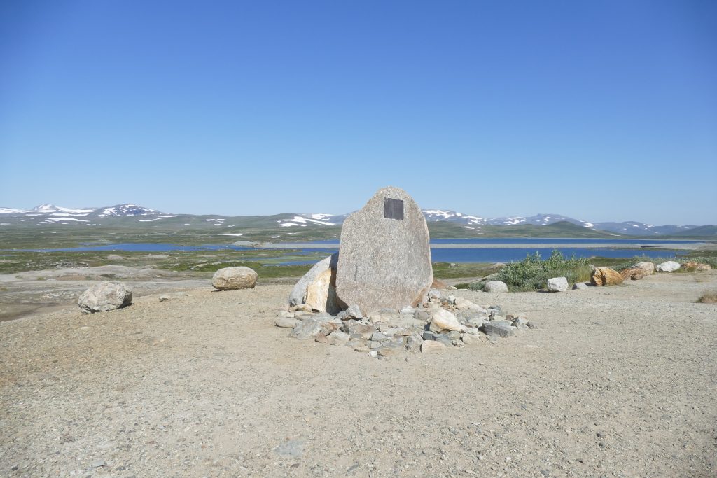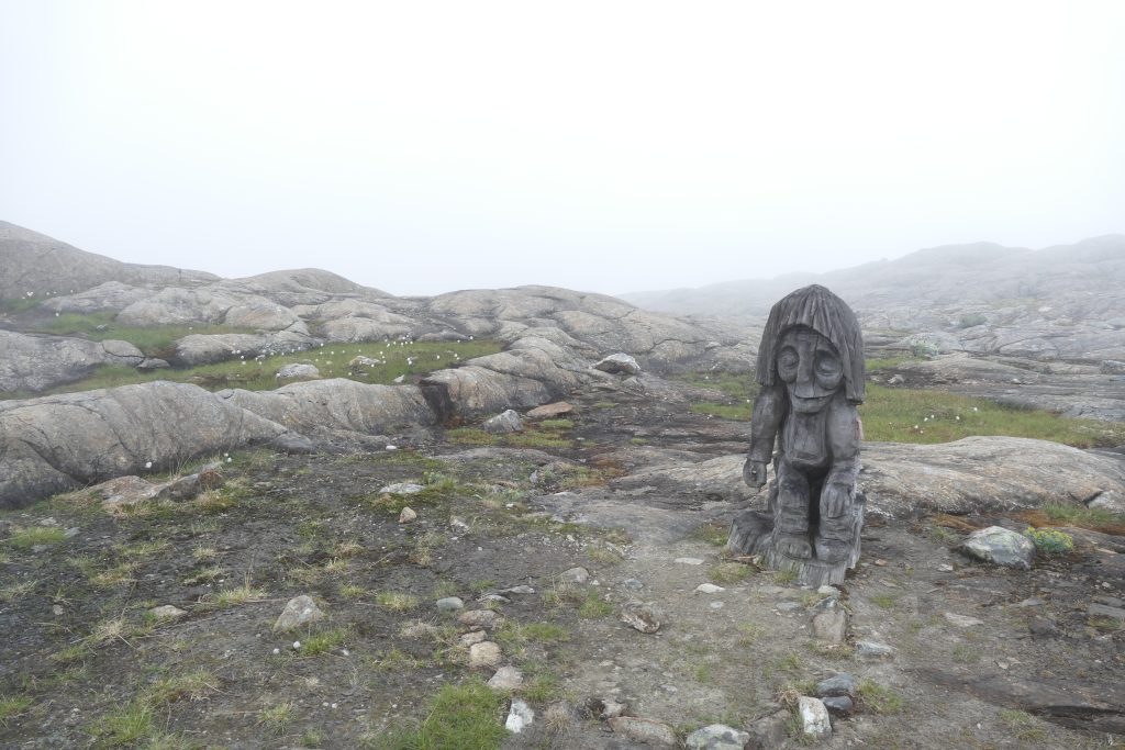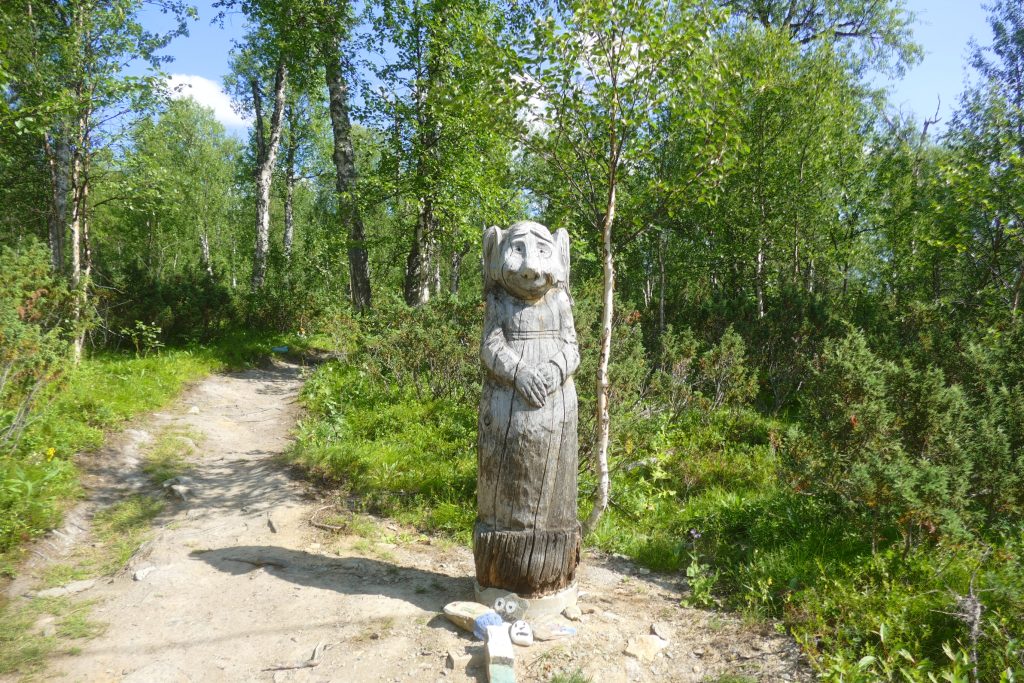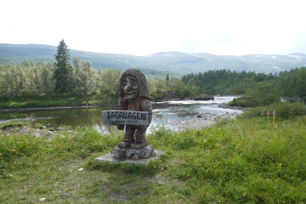 Wir passieren die Grenze zu Norwegen in Skalmodal. Hier heißt die Märchenstraße Sagaveien oder Sagavegen und führt über Hattfjelldal und Trofors nach Brønnøysund an die Küste von Helgeland. Der nächste Parkplatz ist nicht weit von Hattfjelldal entfernt. Hier wollen wir auf den 1123 m hohen Hatten wandern. Es ist heute bedeckt und die Temperaturen sind mit 19° C und einer leichten Brise ideal für eine Wanderung. Zuerst geht der Weg durch Birkenwald. Dann überqueren wir auf Stegen ein Moor. Der erste Blick auf unser Ziel wird sichtbar. Noch verhüllt sich der „Hut“ in Wolken. Es folgt der zum Teil recht steile Anstieg in der baumlosen Zone. Wir kommen an Schneefeldern vorbei und haben einen herrlichen Ausblick auf die gegenüberliegenden Berge mit letzten Schneeresten, sowie auf die Landschaft unter uns. Auf dem letzten Stück des Aufstieges müssen wir über Felsen klettern, doch der Weg ist gut markiert. Endlich ist der Steinhaufen, der den Gipfel markiert, erreicht und ein Kobold begrüßt uns. Leider sind wir von Wolken umgeben, sodass die Sicht gleich null ist. Wir halten uns nicht lange auf und beginnen auf dem gleichen Weg den Abstieg. Danach verlassen wir den Sagavegen und fahren ein Stück in Richtung Schweden, wo wir an der Straße einen schönen Parkplatz mit toller Aussicht auf den Røssvatnet, Norwegens zweitgrößten Binnensee finden.