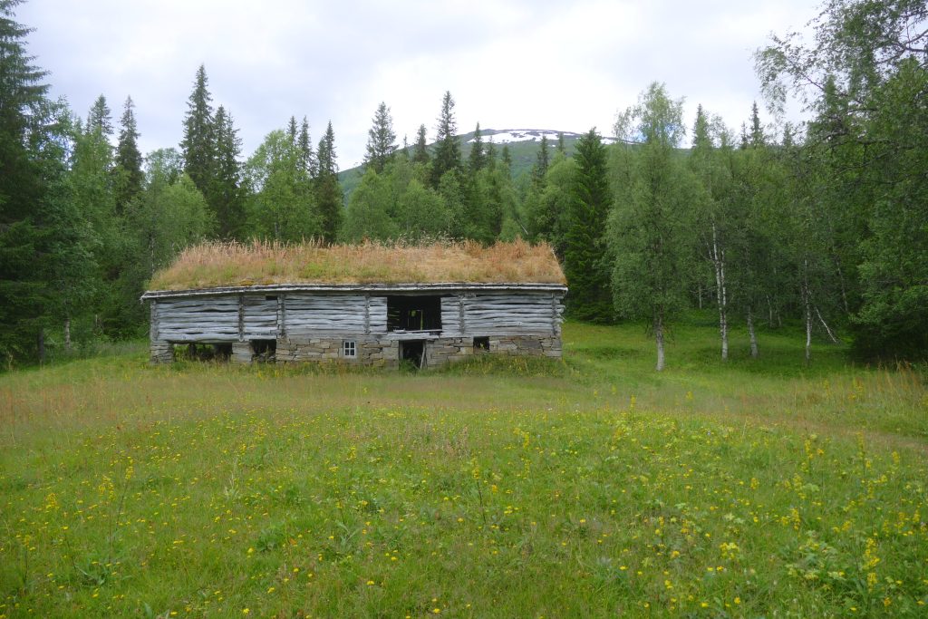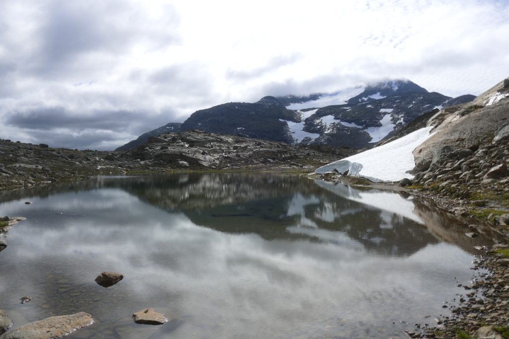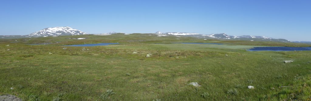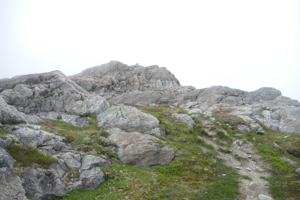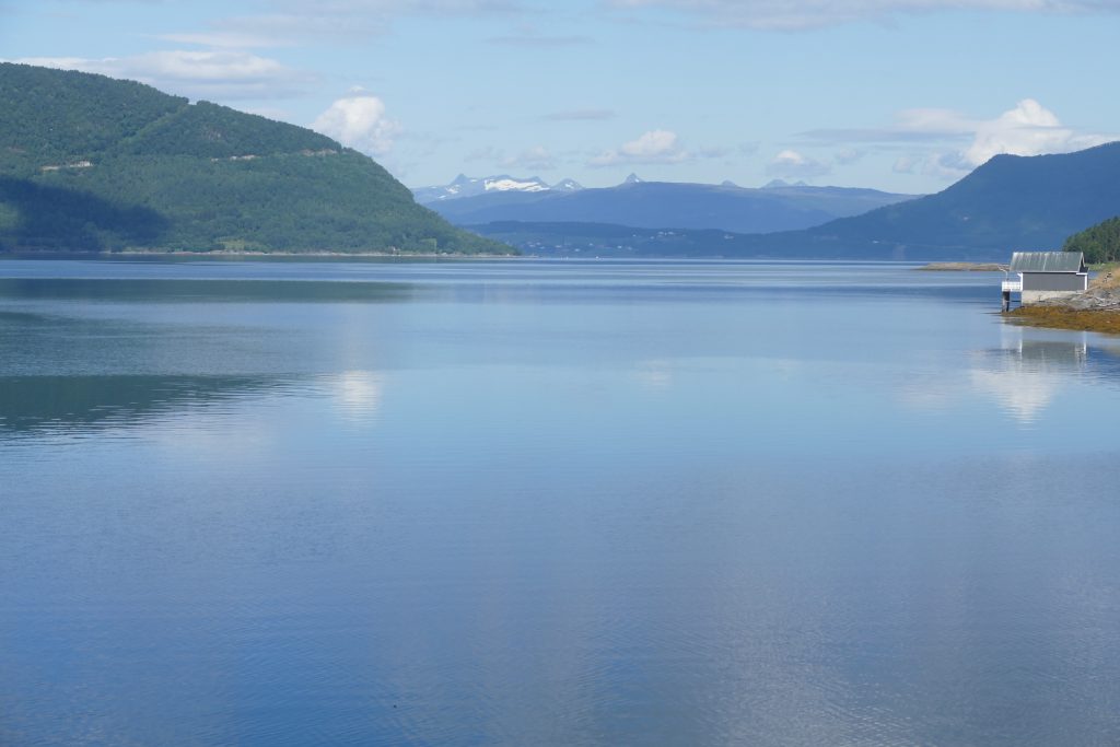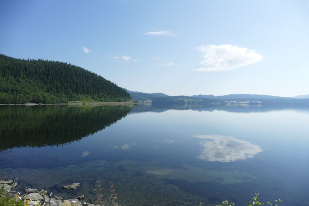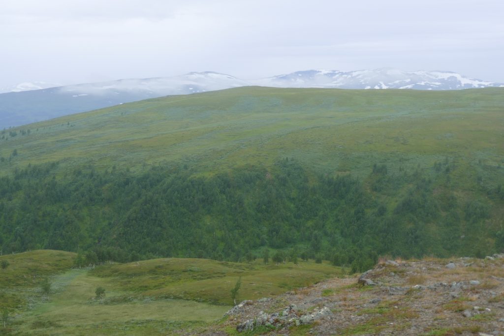 Wir passieren die Grenze zu Norwegen in Skalmodal. Hier heißt die Märchenstraße Sagaveien oder Sagavegen und führt über Hattfjelldal und Trofors nach Brønnøysund an die Küste von Helgeland. Der nächste Parkplatz ist nicht weit von Hattfjelldal entfernt. Hier wollen wir auf den 1123 m hohen Hatten wandern. Es ist heute bedeckt und die Temperaturen sind mit 19° C und einer leichten Brise ideal für eine Wanderung. Zuerst geht der Weg durch Birkenwald. Dann überqueren wir auf Stegen ein Moor. Der erste Blick auf unser Ziel wird sichtbar. Noch verhüllt sich der „Hut“ in Wolken. Es folgt der zum Teil recht steile Anstieg in der baumlosen Zone. Wir kommen an Schneefeldern vorbei und haben einen herrlichen Ausblick auf die gegenüberliegenden Berge mit letzten Schneeresten, sowie auf die Landschaft unter uns. Auf dem letzten Stück des Aufstieges müssen wir über Felsen klettern, doch der Weg ist gut markiert. Endlich ist der Steinhaufen, der den Gipfel markiert, erreicht und ein Kobold begrüßt uns. Leider sind wir von Wolken umgeben, sodass die Sicht gleich null ist. Wir halten uns nicht lange auf und beginnen auf dem gleichen Weg den Abstieg. Danach verlassen wir den Sagavegen und fahren ein Stück in Richtung Schweden, wo wir an der Straße einen schönen Parkplatz mit toller Aussicht auf den Røssvatnet, Norwegens zweitgrößten Binnensee finden.