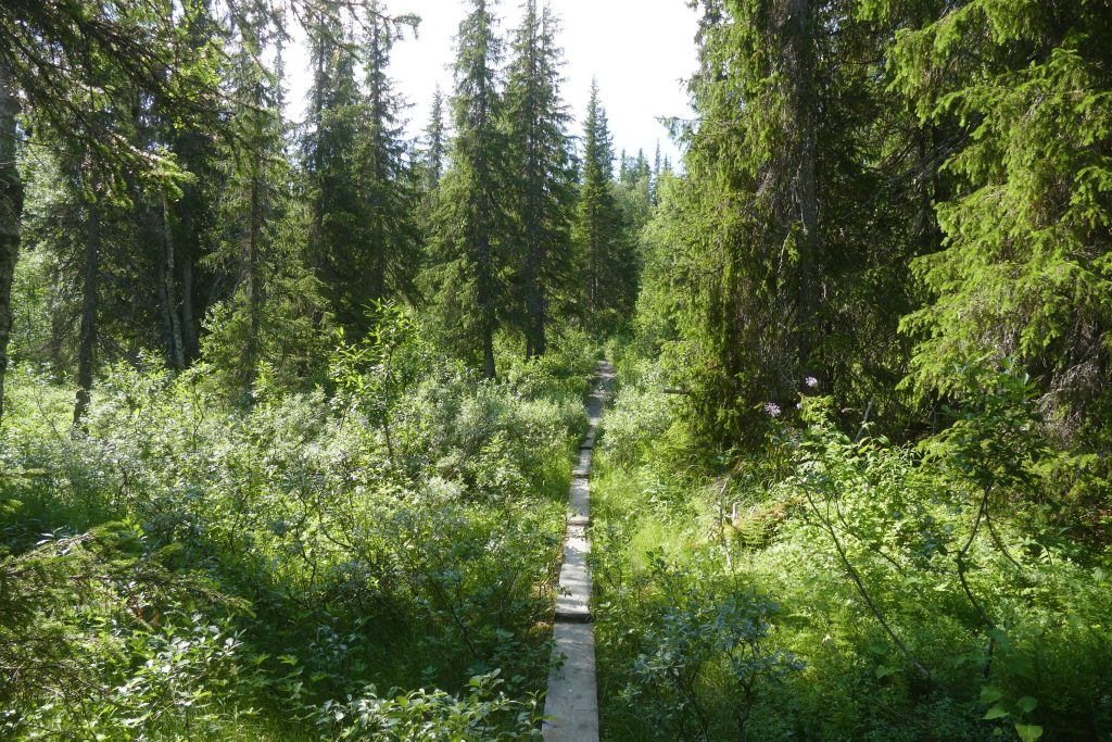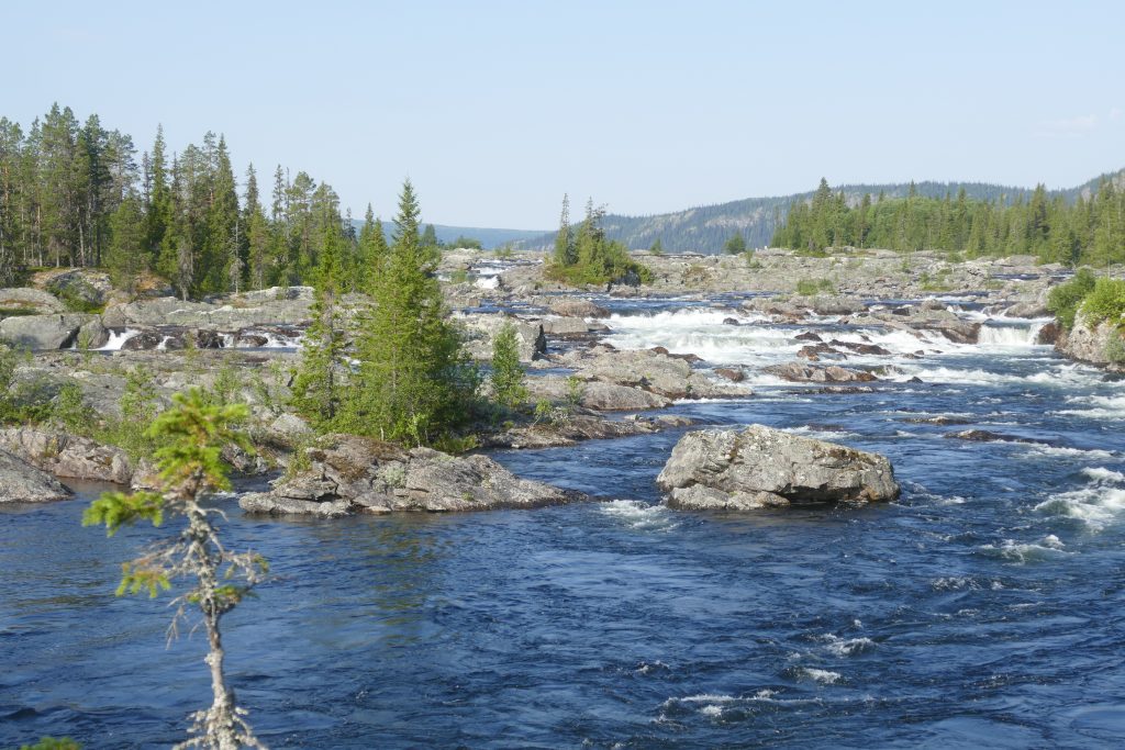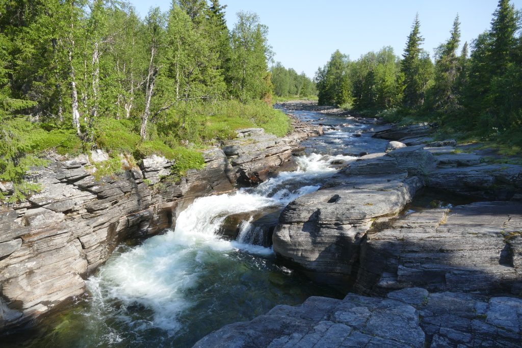Wir fahren zum Ausgangspunkt unserer Wanderung in das Marsfjällens Naturreservat bei Fatmomakke. Das Naturreservat ist ein weitläufiges Gebiet, das sich vom Kahlfjäll im Westen bis zu den Moorhochebenen und Urwäldern im Osten erstreckt. Der mächtige und höchste Gipfel ist der Marsfjäll (1.587 m.ü.M). Ein großes Moorgebiet befindet sich auf der östlich des Marsfjällen gelegenen Hochebene, das in Wald mit urtümlichen Fichten übergeht. Vom Parkplatz wandern wir durch Bergfichtenwald in leichtem auf und ab über Wurzeln und Stege über das Moor bis wir eine Brücke über den Svartbäcken erreichen. Die Stromschnellen unter der Brücke sind gewaltig. Wir folgen dem Rodinsbäcken, der in den Svartbäcken mündet und hier in Bergbirkenwald übergeht. Dann kommen wir zu einer Hängebrücke über den Rodinsbäcken. Entlang des Baches erreichen wir bald die Marsfjällskåtan, von wo sich ein herrlicher Blick auf das Marsfjälls-Massiv eröffnet. Auf gleichem Weg gehen wir zurück zum Parkplatz. Im Anschluss fahren wir weiter nach Saxnäs, wo wir einkaufen und Wasser tanken können. Das nächste Highlight direkt an der Straße ist der Trappstegforsen, ein breiter Wasserfall bei dem das Wasser über viele Stufen nach unten fließt. Da hier viel Trubel herrscht, fahren wir noch ein Stück weiter zu einem Picknickplatz an den Stromschnellen Litsjöforsen. Von den Klippen am Flussufer mit Blick auf den gegenüberliegenden kleinen Wasserfall nehmen wir eine Abkühlung im Wasser.