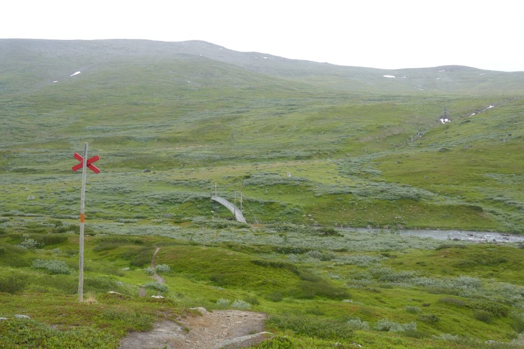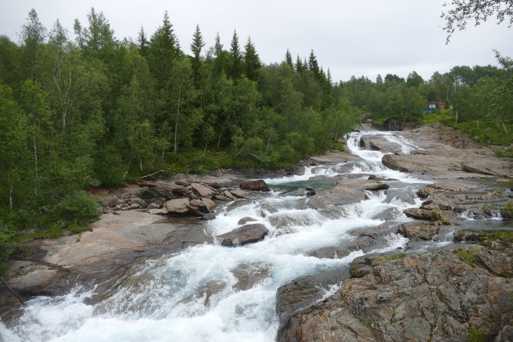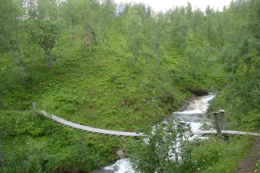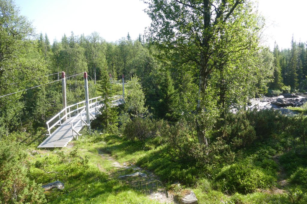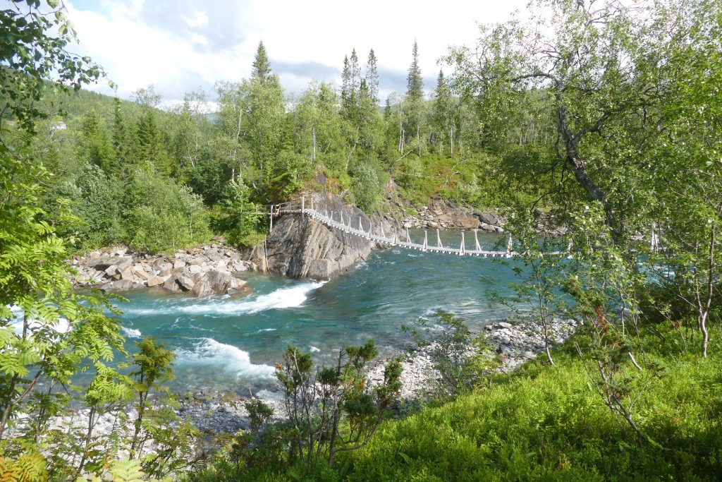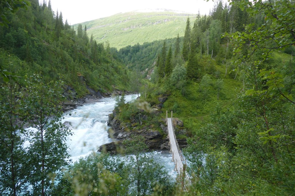 Am Morgen scheint noch die Sonne, doch schon bald ziehen dichte Wolken auf. Wir fahren nur wenige Kilometer zum Startpunkt der Wanderung entlang des Syterbäcken mit Blick auf den Viterskalet. Wir folgen dem Weg entlang des Baches Syterbäcken bis hinauf oberhalb der Baumgrenze. Mittlerweile hat es leicht angefangen zu regnen. Hier gehen wir hinunter zum Fluss, den wir über die Hängebrücke queren. Danach biegen wir auf den Kungsleden in Richtung Hemavan ab und erreichen unseren höchsten Punkt der Wanderung. Tief hängen die Wolken über dem Tal und geben nur wenig Sicht frei. Hier biegen wir ab und folgen dem Weg entlang der Schlucht, durch die der Bach verläuft, zurück zur E12 bei Syterbäcken. Wir fahren weiter auf der E12 bis zum Parkplatz an der Grenze nach Norwegen. Hier gefällt es uns nicht. Der Abzweig zu unserer geplanten Wanderung für morgen ist nur ein paar Kilometer entfernt. Doch da auch für morgen noch Regen angesagt ist, beschließen wir nach Mo i Rana zu fahren.