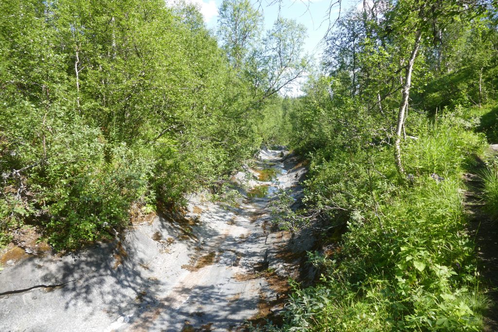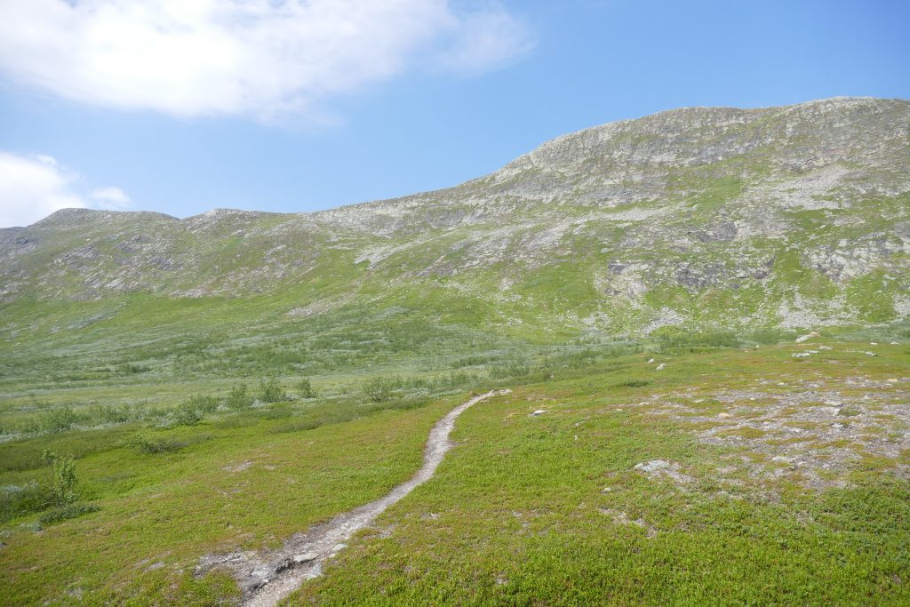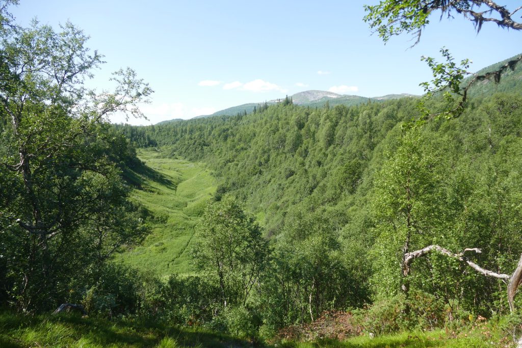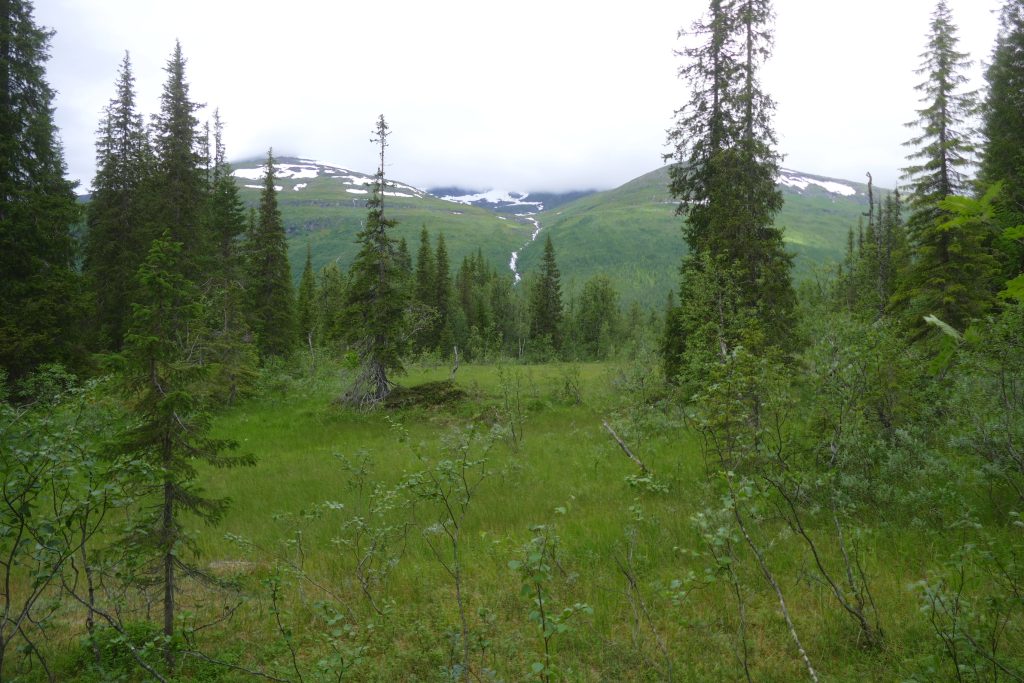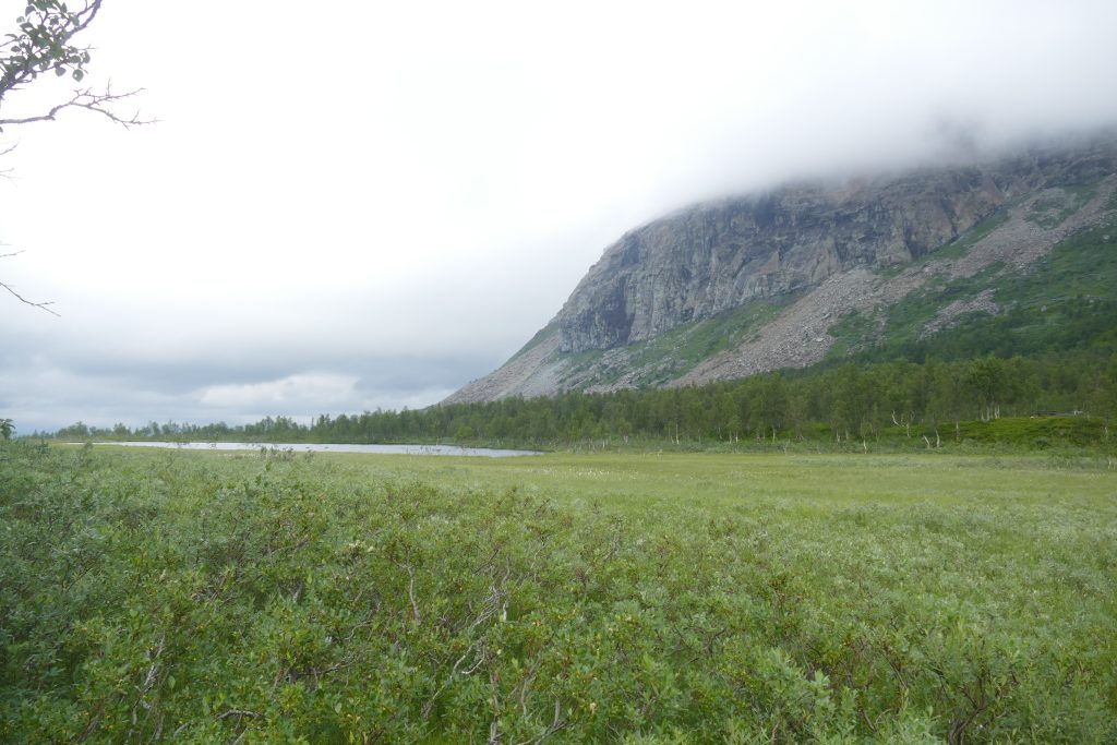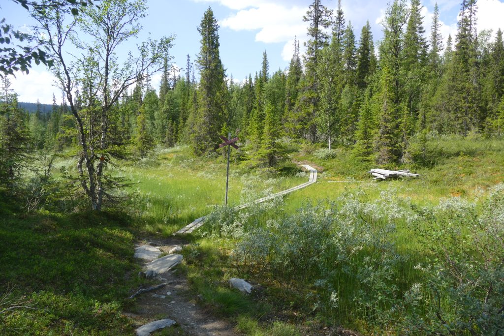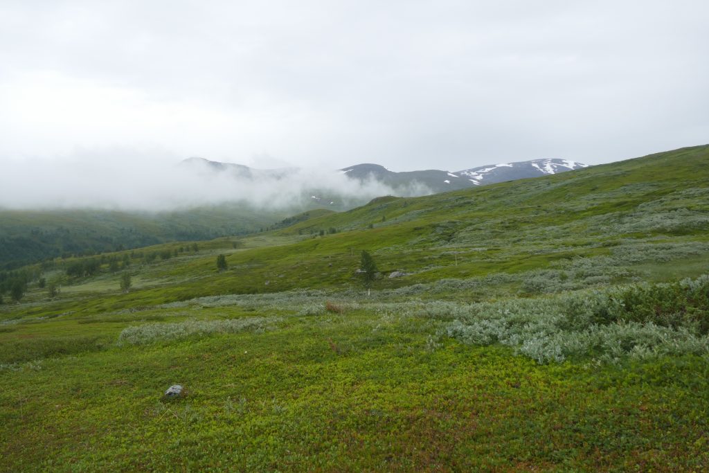 Am Morgen scheint noch die Sonne, doch schon bald ziehen dichte Wolken auf. Wir fahren nur wenige Kilometer zum Startpunkt der Wanderung entlang des Syterbäcken mit Blick auf den Viterskalet. Wir folgen dem Weg entlang des Baches Syterbäcken bis hinauf oberhalb der Baumgrenze. Mittlerweile hat es leicht angefangen zu regnen. Hier gehen wir hinunter zum Fluss, den wir über die Hängebrücke queren. Danach biegen wir auf den Kungsleden in Richtung Hemavan ab und erreichen unseren höchsten Punkt der Wanderung. Tief hängen die Wolken über dem Tal und geben nur wenig Sicht frei. Hier biegen wir ab und folgen dem Weg entlang der Schlucht, durch die der Bach verläuft, zurück zur E12 bei Syterbäcken. Wir fahren weiter auf der E12 bis zum Parkplatz an der Grenze nach Norwegen. Hier gefällt es uns nicht. Der Abzweig zu unserer geplanten Wanderung für morgen ist nur ein paar Kilometer entfernt. Doch da auch für morgen noch Regen angesagt ist, beschließen wir nach Mo i Rana zu fahren.