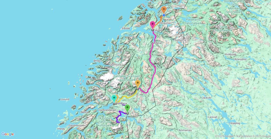 Heute geht die Fahrt weiter in Richtung Norden. Wir haben gestern bereits mehrmals den Polarkreis überschritten. An der E6, 66′ 33’ N, befindet sich der nördliche Breitengrad in Norwegen, den wir heute überschreiten. Wir halten am Polarkreiszentrum an, das am 13. Juli 1990 eröffnet wurde und sich etwa 680 m über dem Meer in der Nähe des Saltfjellet-Svartisen Nationalparks befindet. Weiter auf der E6 erreichen wir nach ca. 140 km Fauske. Wir machen eine kleine Pause, bevor wir weiter auf der E6 bis zum Wegweiser in den Rago Nationalpark fahren. Wir biegen auf den Laksholveien ab und suchen uns einen kleinen Parkplatz direkt zwischen Straße und dem Fluss Nordfjordelva.