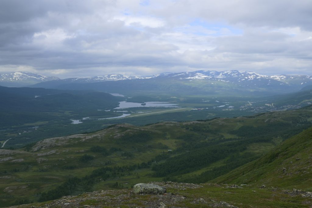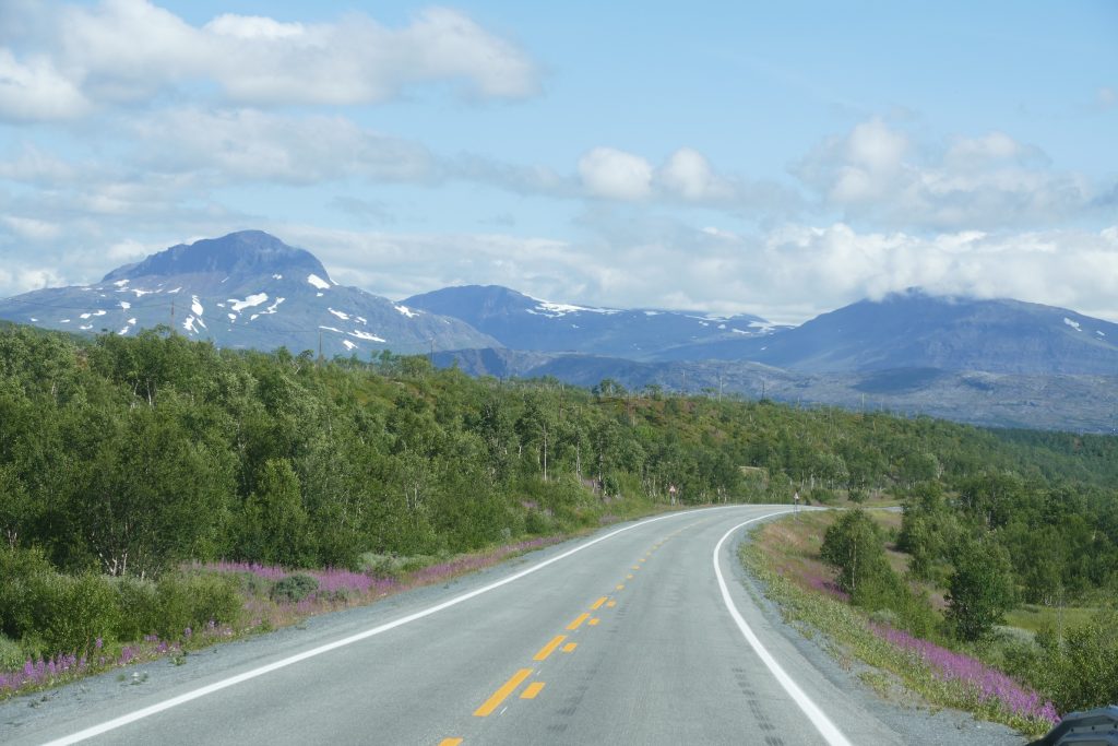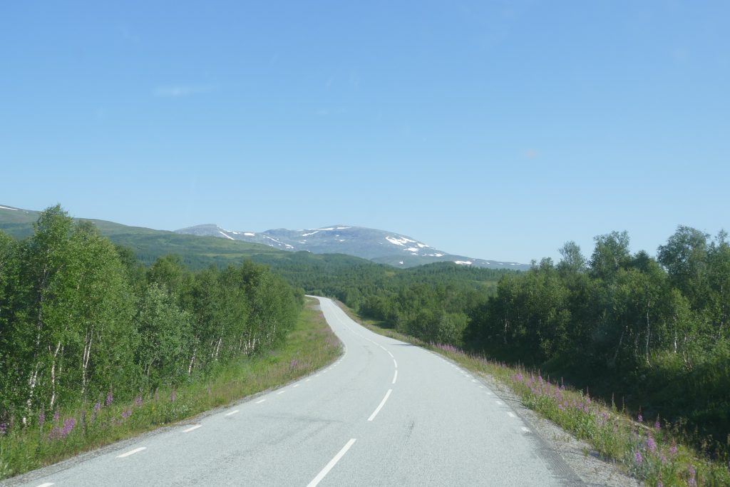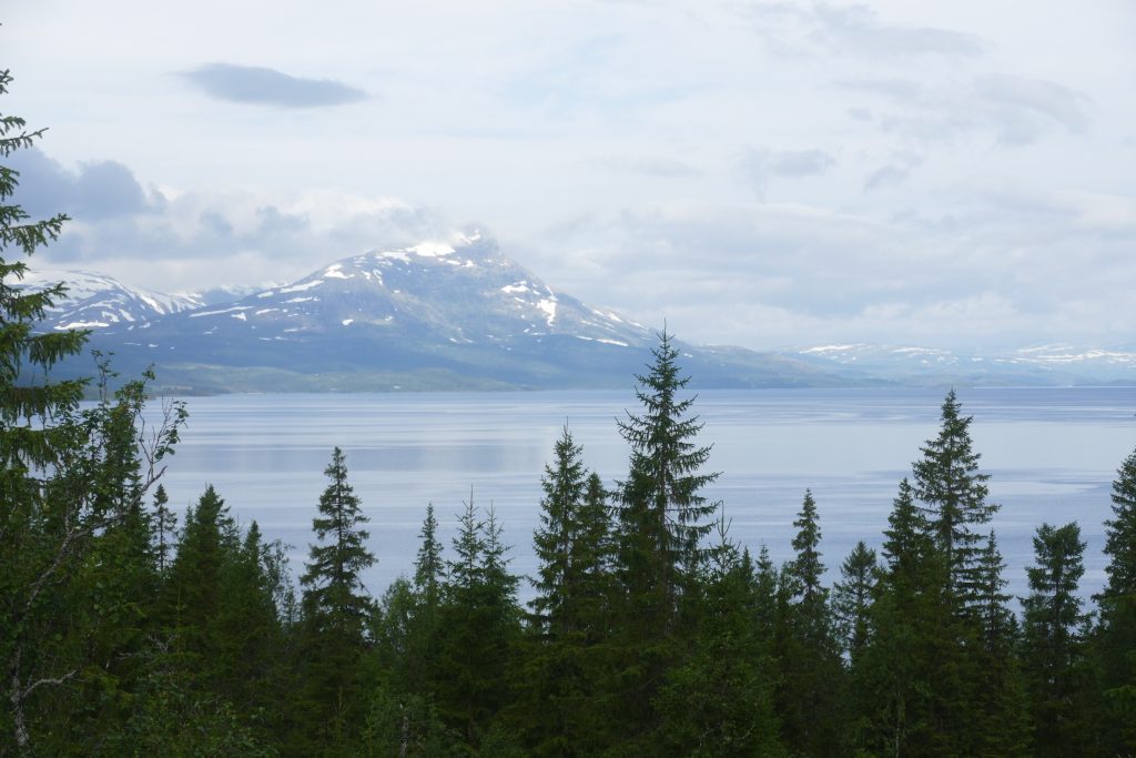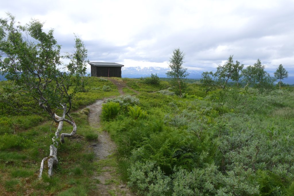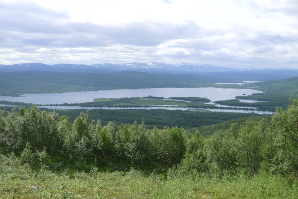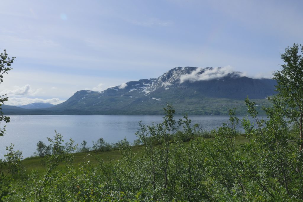 Wir verlassen unseren Stellplatz und fahren weiter Richtung Schweden, bis wir auf die E12 kommen. Hier biegen wir nach Hemavan ab. Die E12 ist hier der Blå Vägen, eine der beliebtesten Roadtrip-Routen. Die Route schlängelt sich von Norwegen durch Schweden und Finnland und ist rund 1.800 Kilometer lang, wobei 460 Kilometer durch Schweden führen. Von der norwegischen Grenze bei Högstaby bis Hemavan und weiter bis nach Holmsund ist der spektakulärste Abschnitt. Der Name der Straße leitet sich von dem langen Fluss Blaue Ume ab, der entlang der Straße fließt. In Hemavan machen wir einen Einkaufsbummel. Dabei finden wir eine Karte der Umgebung mit Wandervorschlägen. Nach kurzer Überlegung beschließen wir doch noch eine kleine Wanderung zu unternehmen, zumal das Wetter gut aussieht. Wir fahren ein Stück zurück auf den Wanderparkplatz in Laisaliden. Hier starten wir zur Wanderung auf den Gielestjåhke, der sich auf dem kahlen Berg oberhalb von Laisaliden befindet. Zuerst steigt der Weg stetig bergan und wird zunehmend steiler, bis wir auf einen Kammweg stoßen, immer mit herrlicher Aussicht auf die Berge von Norwegen. Wir folgen dem Sommerwanderweg in Richtung Gielestjåhke und kommen an zwei Seen vorbei. Mittlerweile haben wir ca. 900 Höhenmeter erreicht und der Himmel hat sich zugezogen. Zudem bläst ein eiskalter Wind. Noch weiter auf den Gipfel des 1195 m hohen Gielestjåhke zu wandern macht keinen Sinn, da wir dazu auch zu spät gestartet sind. So kehren wir um und nehmen einen Parkplatz in Hemavan am naturum Visitor Centre.