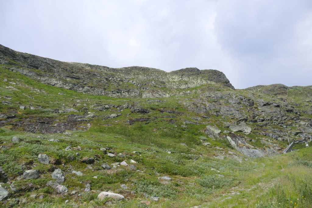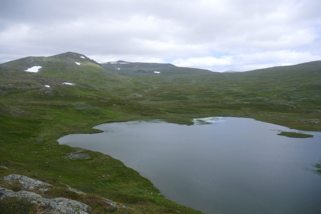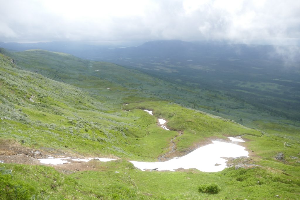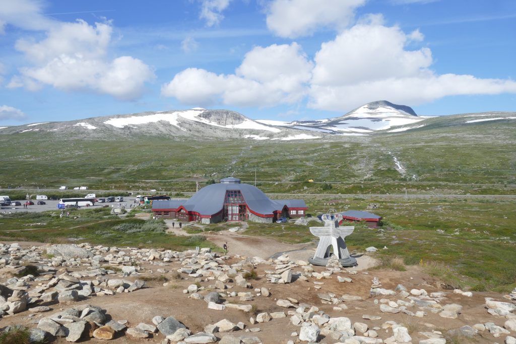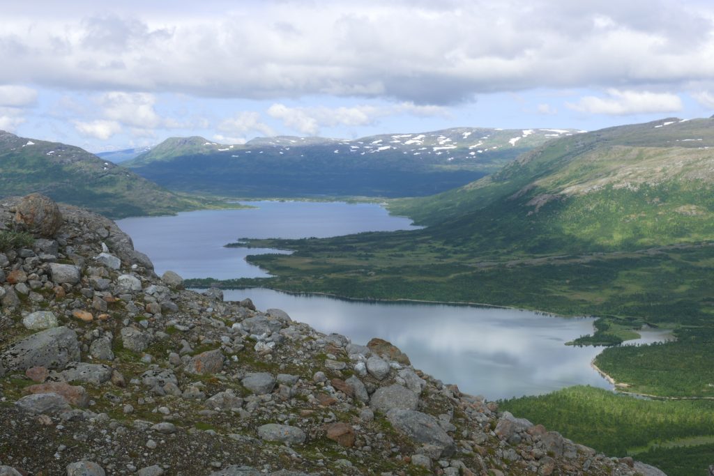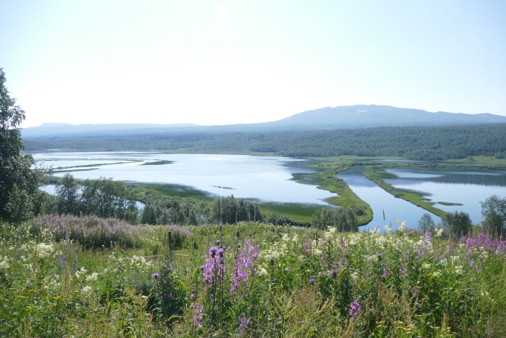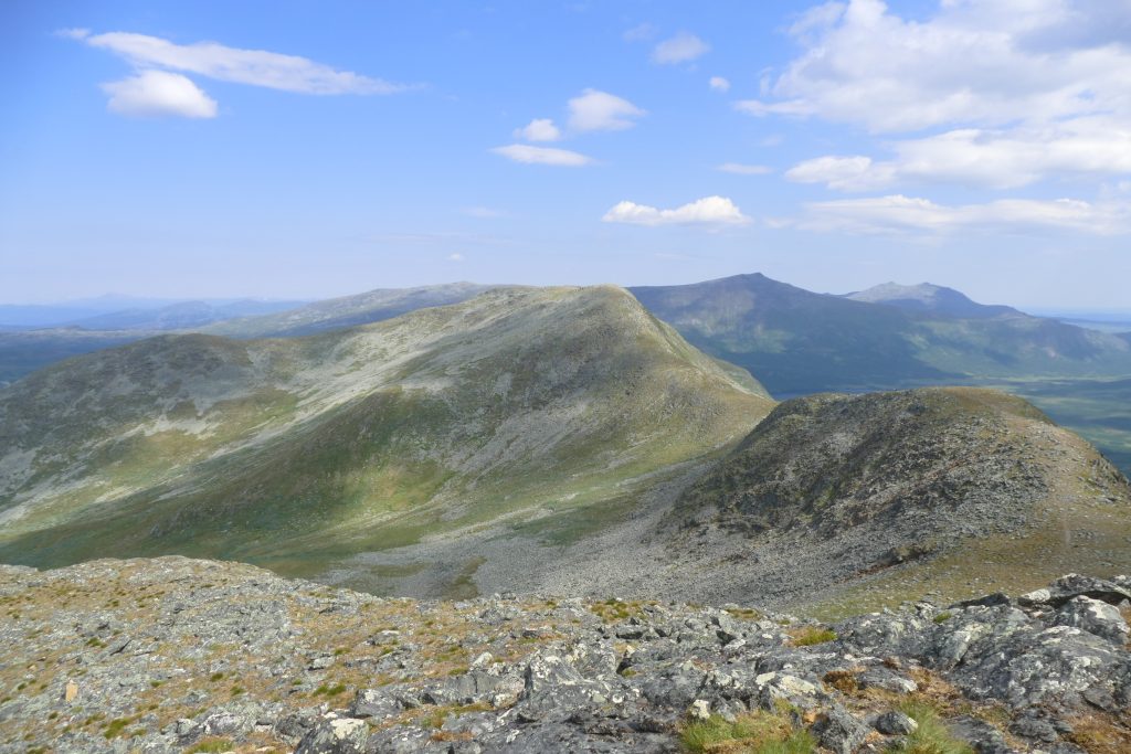 Wir verlassen unseren Stellplatz und fahren weiter Richtung Schweden, bis wir auf die E12 kommen. Hier biegen wir nach Hemavan ab. Die E12 ist hier der Blå Vägen, eine der beliebtesten Roadtrip-Routen. Die Route schlängelt sich von Norwegen durch Schweden und Finnland und ist rund 1.800 Kilometer lang, wobei 460 Kilometer durch Schweden führen. Von der norwegischen Grenze bei Högstaby bis Hemavan und weiter bis nach Holmsund ist der spektakulärste Abschnitt. Der Name der Straße leitet sich von dem langen Fluss Blaue Ume ab, der entlang der Straße fließt. In Hemavan machen wir einen Einkaufsbummel. Dabei finden wir eine Karte der Umgebung mit Wandervorschlägen. Nach kurzer Überlegung beschließen wir doch noch eine kleine Wanderung zu unternehmen, zumal das Wetter gut aussieht. Wir fahren ein Stück zurück auf den Wanderparkplatz in Laisaliden. Hier starten wir zur Wanderung auf den Gielestjåhke, der sich auf dem kahlen Berg oberhalb von Laisaliden befindet. Zuerst steigt der Weg stetig bergan und wird zunehmend steiler, bis wir auf einen Kammweg stoßen, immer mit herrlicher Aussicht auf die Berge von Norwegen. Wir folgen dem Sommerwanderweg in Richtung Gielestjåhke und kommen an zwei Seen vorbei. Mittlerweile haben wir ca. 900 Höhenmeter erreicht und der Himmel hat sich zugezogen. Zudem bläst ein eiskalter Wind. Noch weiter auf den Gipfel des 1195 m hohen Gielestjåhke zu wandern macht keinen Sinn, da wir dazu auch zu spät gestartet sind. So kehren wir um und nehmen einen Parkplatz in Hemavan am naturum Visitor Centre.