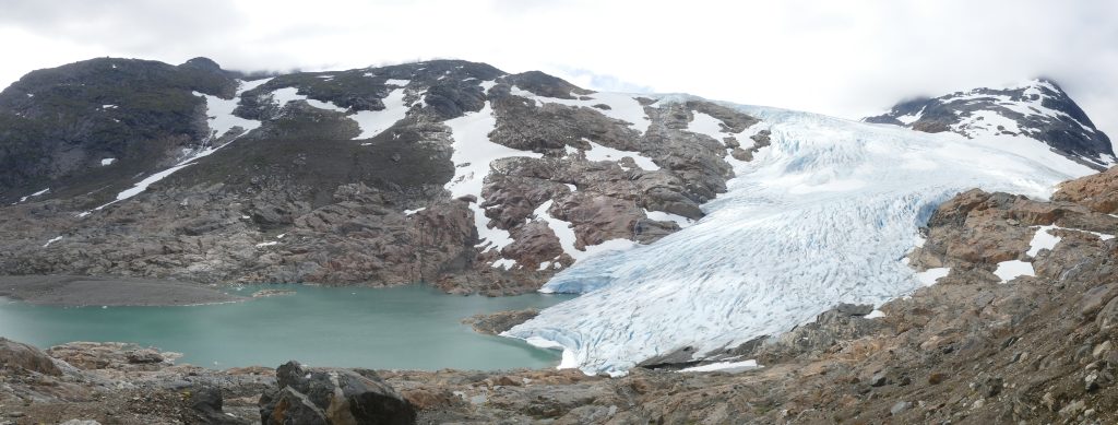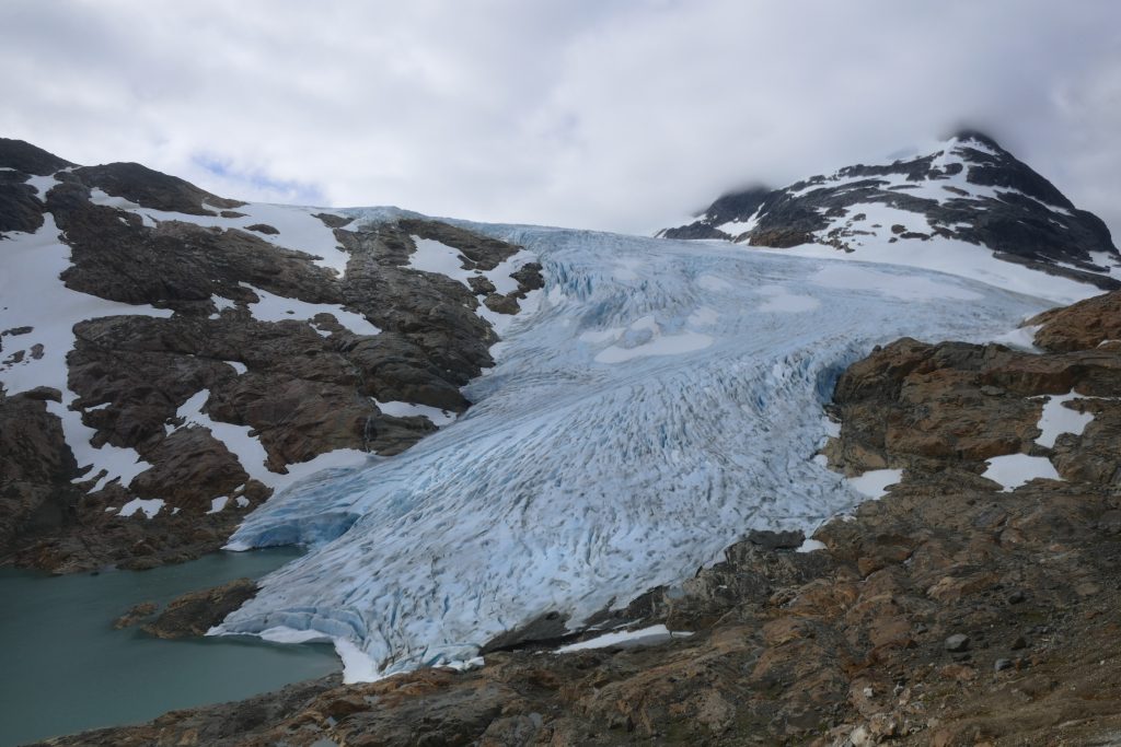 11° C und die Berge hüllen sich noch in Wolken, doch der Himmel sieht vielversprechend aus. Wir machen uns auf die beschwerlichen 45 km bis zum Ausgangspunkt unserer Wanderung zum Gletscher Okstindbreen zwischen den Gipfeln des Okstindan-Massivs, welches auch wegen seiner Höhe als das Dach Nordnorwegens gilt. Die ersten 15 km sind noch auf einer kleinen Asphaltstraße, doch dann wird es hart. Die Piste ist voller Schlaglöcher und dann folgt ein langes Stück mit groben Schotter. Wir brauchen ca. 1,5 h bis zum Parkplatz unweit der Kjensvasshytta-Hütte. Mit einer Fläche von rund 46 Quadratkilometern ist der Okstinbreen der achtgrößte Gletscher Norwegens und einer der beiden Hauptgletscher soll der älteste Gletscher Norwegens sein. Vom Parkplatz geht ein einfacher doch anstrengender, ca. 2,3 km langer Aufstieg zum Teil durch nasses Gelände aufwärts bis über die Baumgrenze. Hier beginnt ein älteres Gletscherflussbett und es wird steiniger. Wir erreichen einen Regenwasser-See und blicken über den See Kjennsvatnet und ein traumhaftes Panorama. Ein Pfad führt auf einer kurzen Distanz direkt zu einem Abhang, von dessen Rand wir auf ein spektakuläres Motiv blicken. Das blau strahlende Eis der Gletscherzunge Austre Okstindbreen mit ihrem grünlich schimmernden Abflusssee und dem darüber thronenden Gipfel des Oksskolten Gipfel. Nur an wenigen Orten in Norwegen hat man die Gelegenheit, dem Eis so nah zu kommen. Die beschwerliche Anfahrt hat sich gelohnt. Wir nehmen den gleichen Weg zurück und fahren im Anschluss zurück nach Mo i Rana.