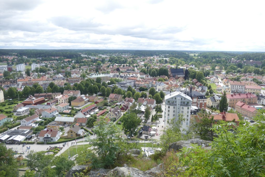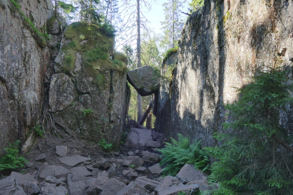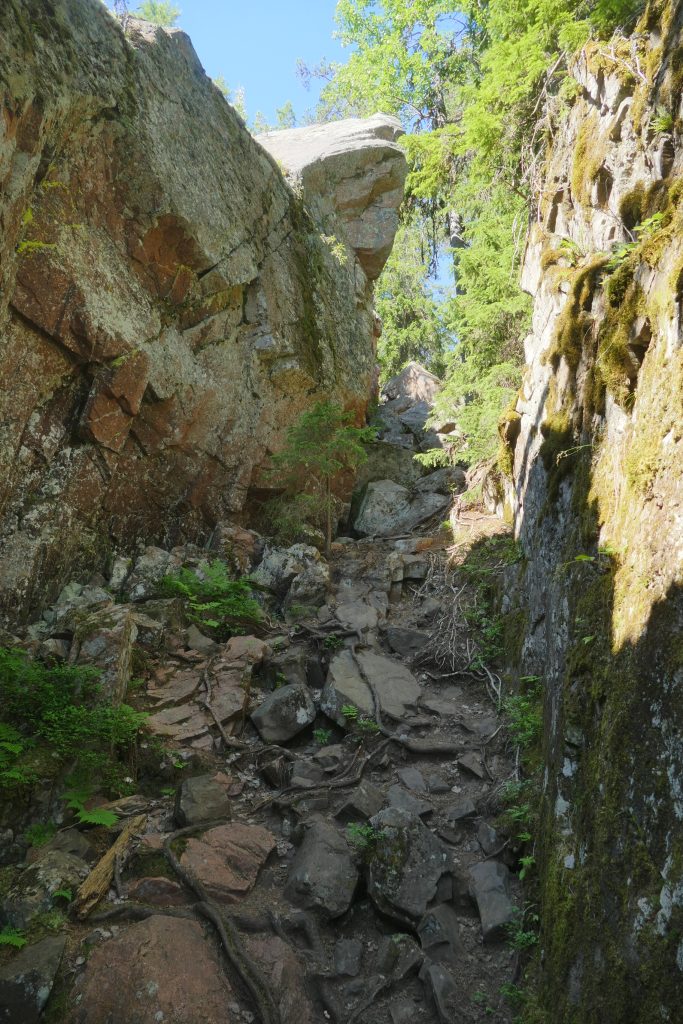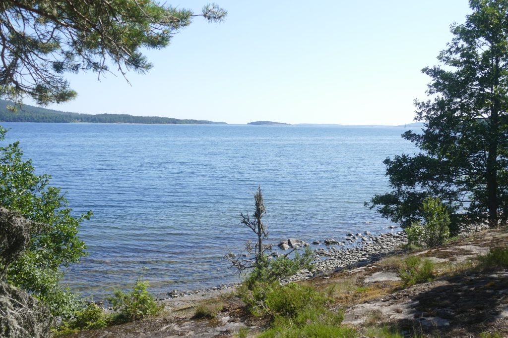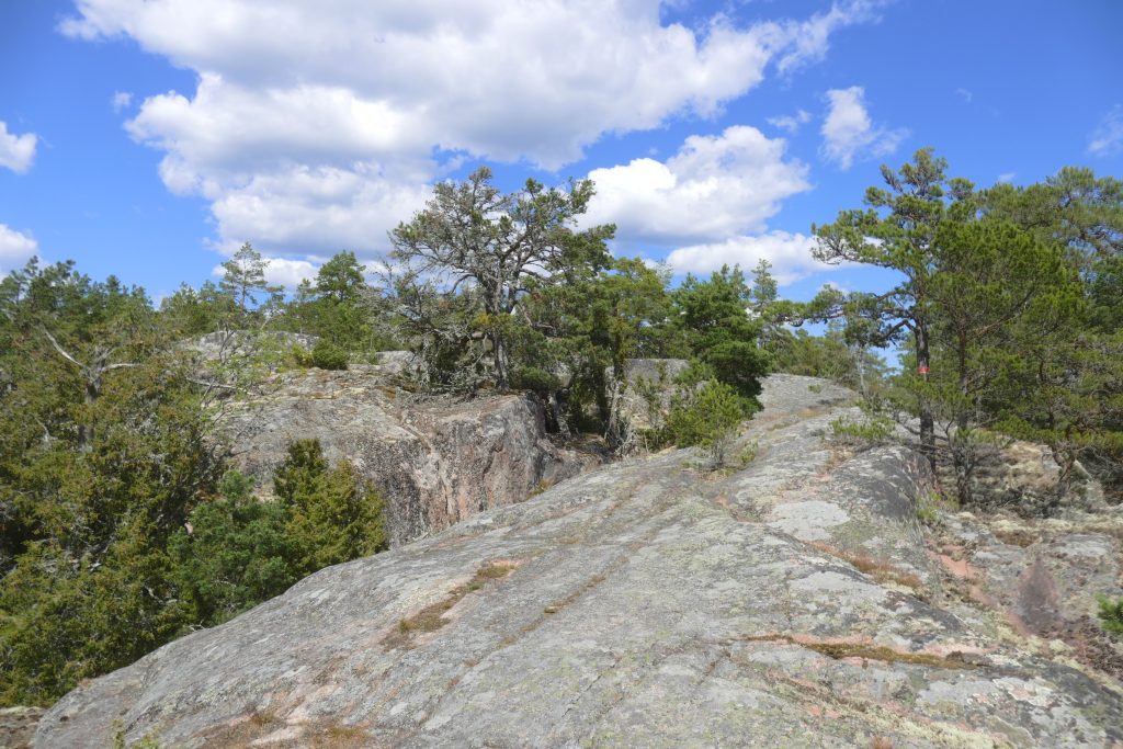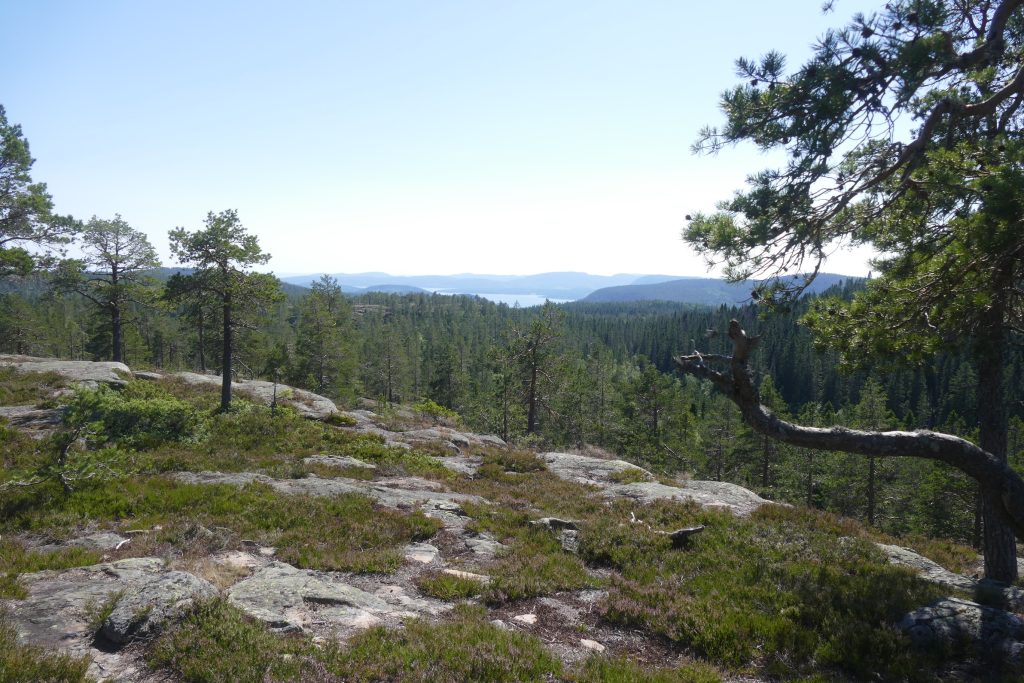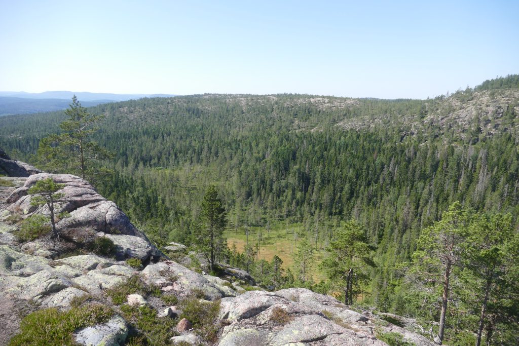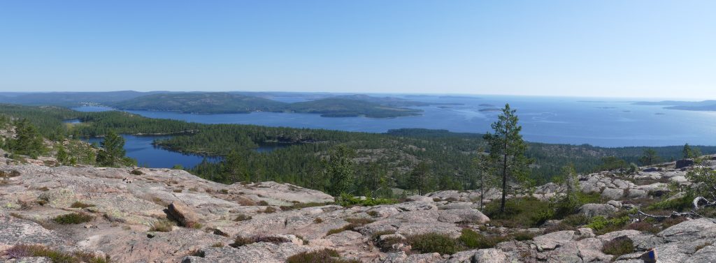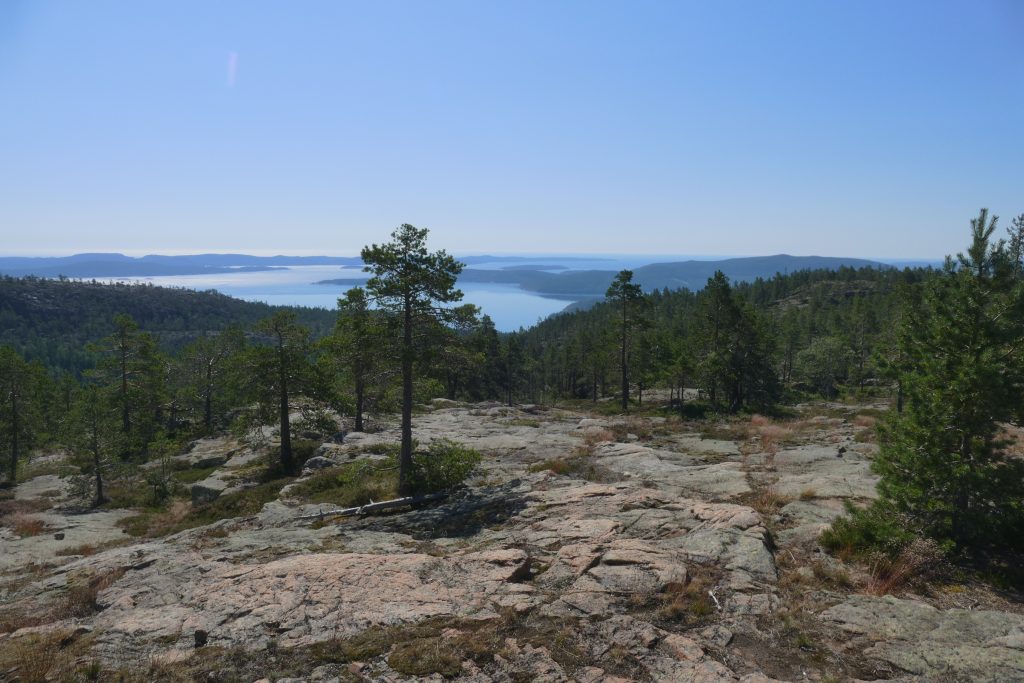 Heute haben wir uns das beliebteste Ziel in Nationalpark vorgenommen, die Slåttdalsberget mit Slåttdalsskrevan, eine 200 Meter lange, 30 Meter tiefe und 7 Meter breite Gletscherspalte, die den Slåttdalsberget in zwei Teile teilt. Vom Gipfel des Slåttdalsberget haben wir einen fantastischen Blick auf den Skuleskogen und die gesamte Höga Kusten Region. Wir wandern durch Wälder über Wurzeln und Granitplatten, an feuchten Stellen auch auf Holzbohlen mit zahlreichen Ausblicken. Nordwestlich der Felsspalte steigen wir auf einen Hügel mit toller Aussicht. Anschließend nehmen wir den Abstecher über Slåttdalsberget, wo wir ein steiles Stück mithilfe von Seilen bewältigen müssen. Hier ist der Blick auf die Höga Kusten fantastisch. Von hier nehmen wir ein Stück des Höga-Küsten-Wanderwegs in Richtung Süden zum bewachsenen Südhang des Moberget, der aus rötlichem Nordingrå-Granit besteht. Vom Südeingang des Nationalparks folgen wir dem Weg zum Skrattabborrtjären und wieder über den Längtjären zurück zu unserem Parkplatz. Insgesamt war der Weg doch recht anspruchsvoll mit fast 18 km und 576 Höhenmetern. Im Anschluss fahren wir zum Nordeingang des Nationalparks.