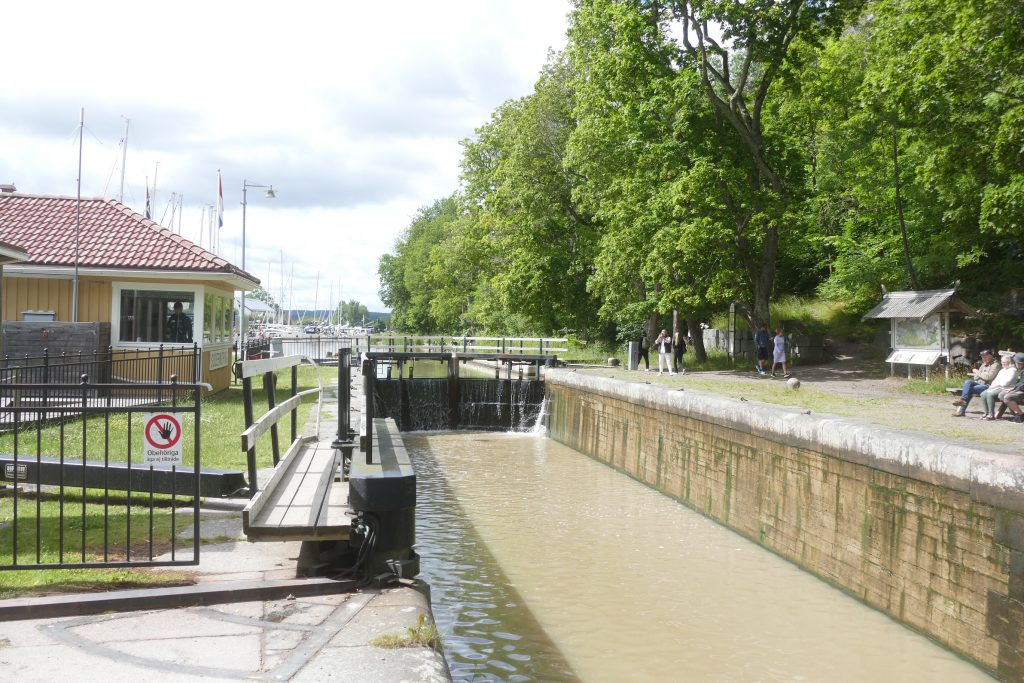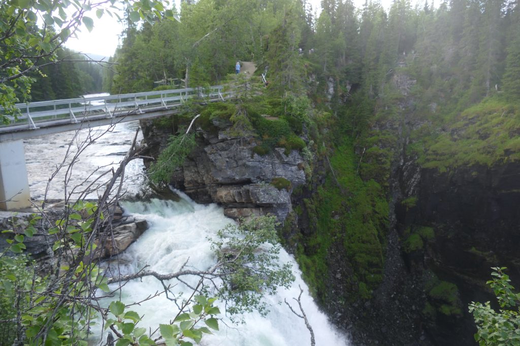 Wir fahren nach Strömsund zum Freilichtmuseum Ströms Hembygdsgård direkt an der Brücke über den See Ströms Vattudal. Der sechs Meter große sprechende Riese Jorm, eine Märchenfigur aus dem Film Dunderklumpen, steht am Eingang des Freilichtmuseums mit verschiedenen historischen Gebäuden. Leider sind diese verschlossen. Wir fahren weiter auf dem Vildmarksvägen bis zu einem der höchsten Wasserfälle in Schweden, dem Hällingsåfallet. Er stürzt in eine über 40 Meter tiefe Schlucht und mündet dann in einen engen Canyon. Nach 800 Metern weitet sich der Spalt, und das Wasser verteilt sich in ein ruhiges Flussbett, das nach drei Kilometern in den Hetögeln-See fließt. Vom Parkplatz nehmen wir den ausgeschilderten Wanderweg, der durch wilden Wald bis zum Beginn des Canyons führt. Nach dem gestrigen Regen am Abend sind wir ein gefundenes Fressen für die Mücken. Dann stehen wir vor einer beeindruckenden Schlucht mit fast senkrechten Steilwänden. Wir wandern hinauf bis zum Wasserfall, den wir schon bald tosen hören. Eine Brücke führt über den Wasserfall, unter der der Hällingsåfallet tosend und donnernd 40 m in den Abgrund stürzt. Ein Nebelschleier liegt über der Schlucht. Und als wir uns gerade auf den Rückweg machen wollen, entlädt sich eine Wolke über uns. Pitschnass nehmen wir die Schotterstraße zurück zum Wohnmobil und fahren weiter nach Gäddede. Den ausgesuchten Parkplatz gibt es nicht mehr. So fahren wir weiter auf dem Vildmarksväge bis zu einem Parkplatz direkt an der Straße, jedoch mit schönem Blick auf den Kycklingvattnet.