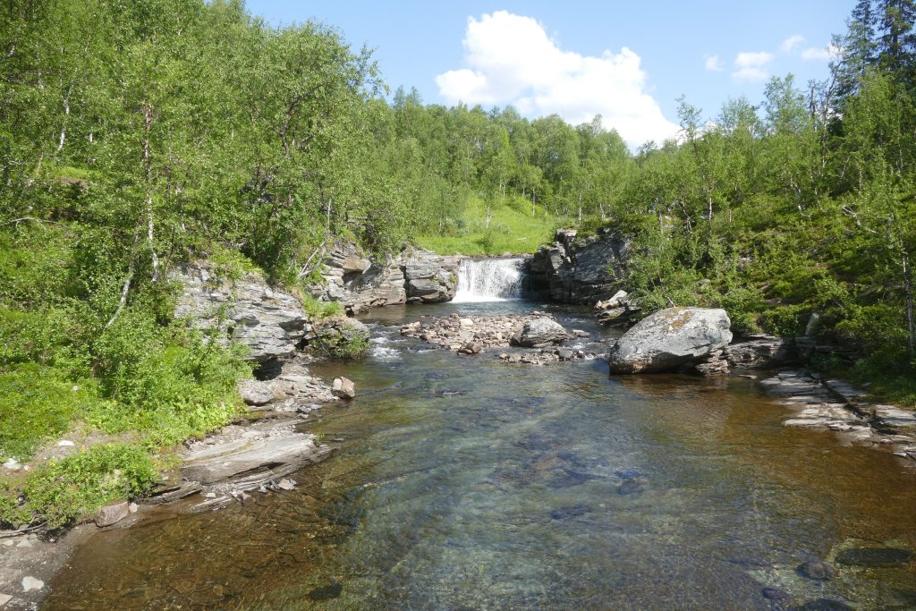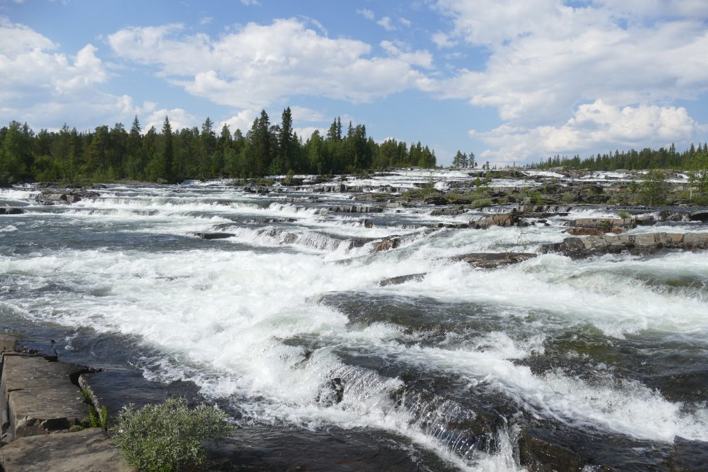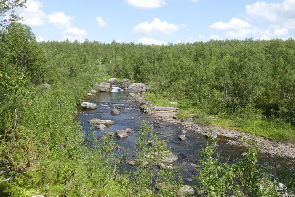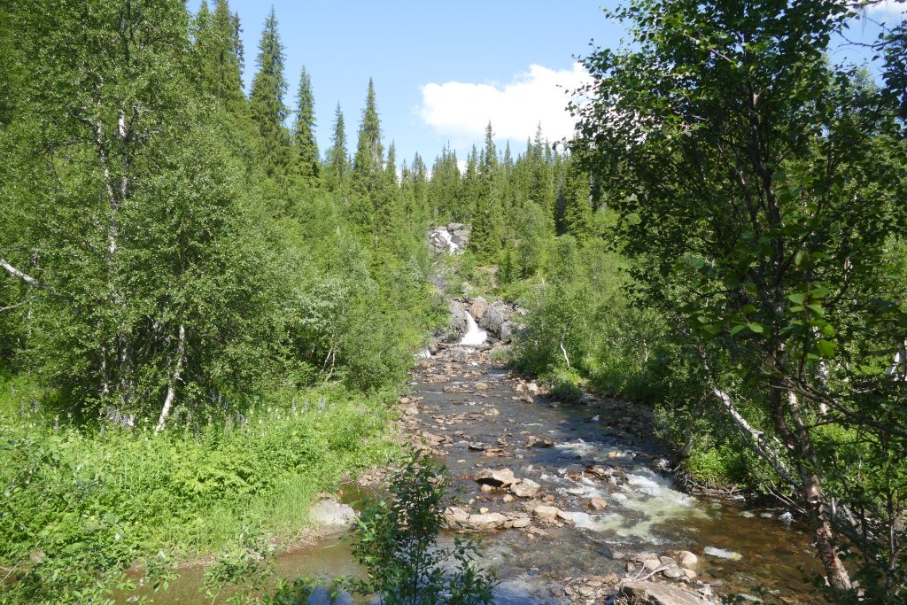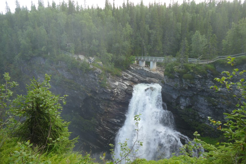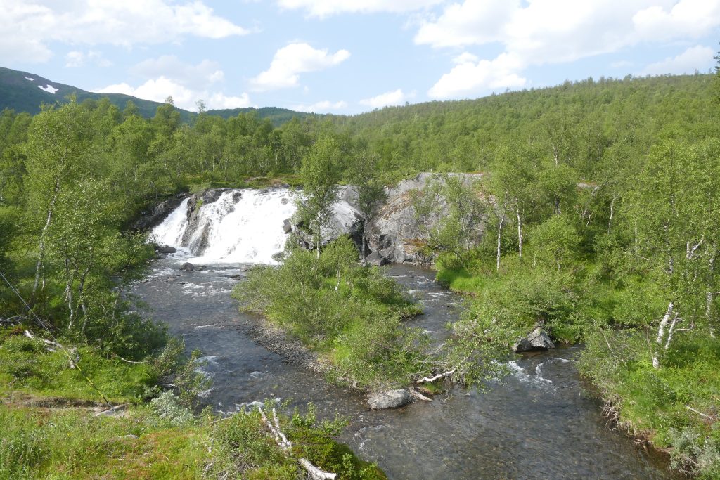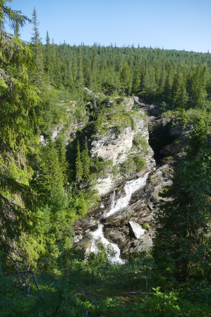 Heute fahren wir den Vildmarksvägen bis Stalon. Hier treffen wir auf den Sagavägen und biegen in nördliche Richtung ab. Wir kommen ein Stück durch das Naturreservat Marsfjäll bis Dikanäs und fahren noch weiter nach Kittelfäll. Hier wollen wir uns einer ersten Herausforderung stellen, indem wir auf den Kittelfjaellet auf 1.220 m hinauf wandern. Die 785 Höhenmeter sind bei fast 30° C eine echte Herausforderung. Zuerst geht ein schmaler Pfad durch Wald, der sich schon bald lichtet. Wir folgen den Steinmännchen stetig bergan. Kurz vor dem Gipfel kommt plötzlich eine Herde Rentiere auf uns zu. Alle Mühen sind vergessen. Am Gipfel wollen wir eine Rast einlegen, doch die beißenden Plagegeister vermiesen uns die Pause. Wir steigen ab, und schon steht die nächste Herausforderung vor uns. Kein Weg zu sehen, über Geröll und typische Hochgebirgsvegetation tasten wir uns langsam bergab. Als wir endlich die Skistation erreichen, ohne Schaden genommen zu haben, sind wir froh. Im Anschluss fahren wir weiter auf dem Sagavägen. Unterwegs kommen wir zum Fättjaur-See. Direkt an der Straße befindet sich ein kleiner Badeplatz, den wir für eine Abkühlung nutzen. Dann sind es noch ca. 30 km bis zu unserm Stellplatz in der Nähe von Skalmodal an einem schönen Wasserfall.