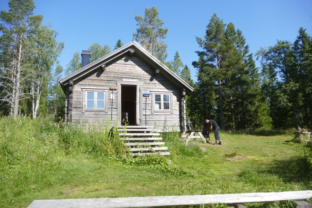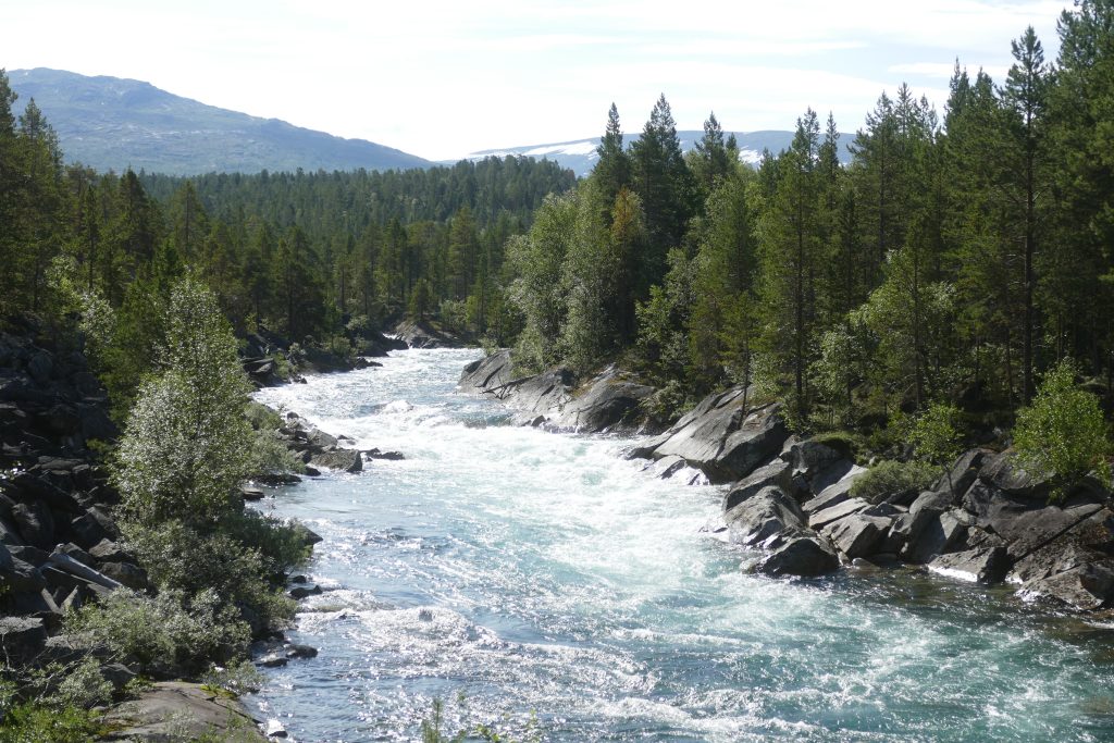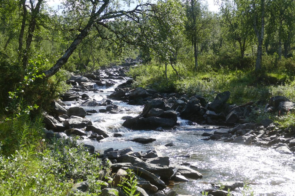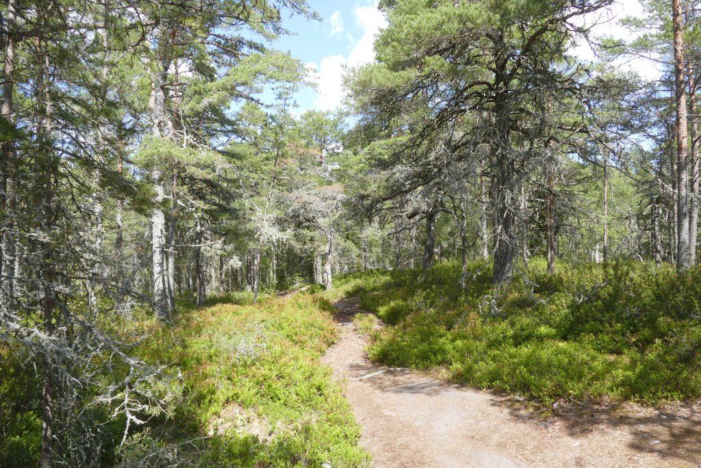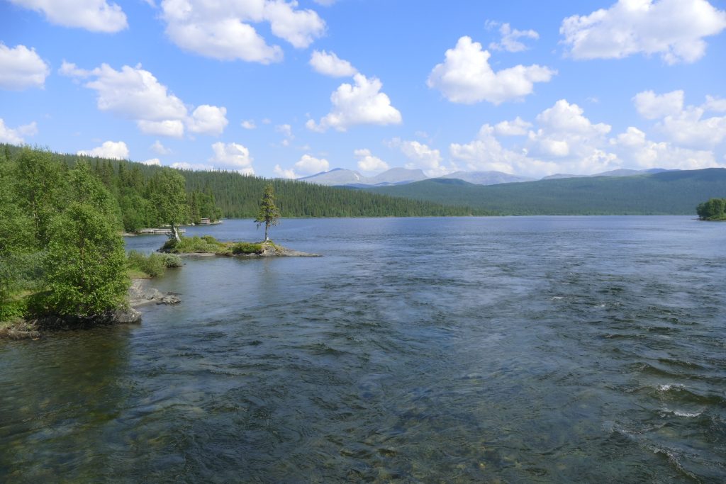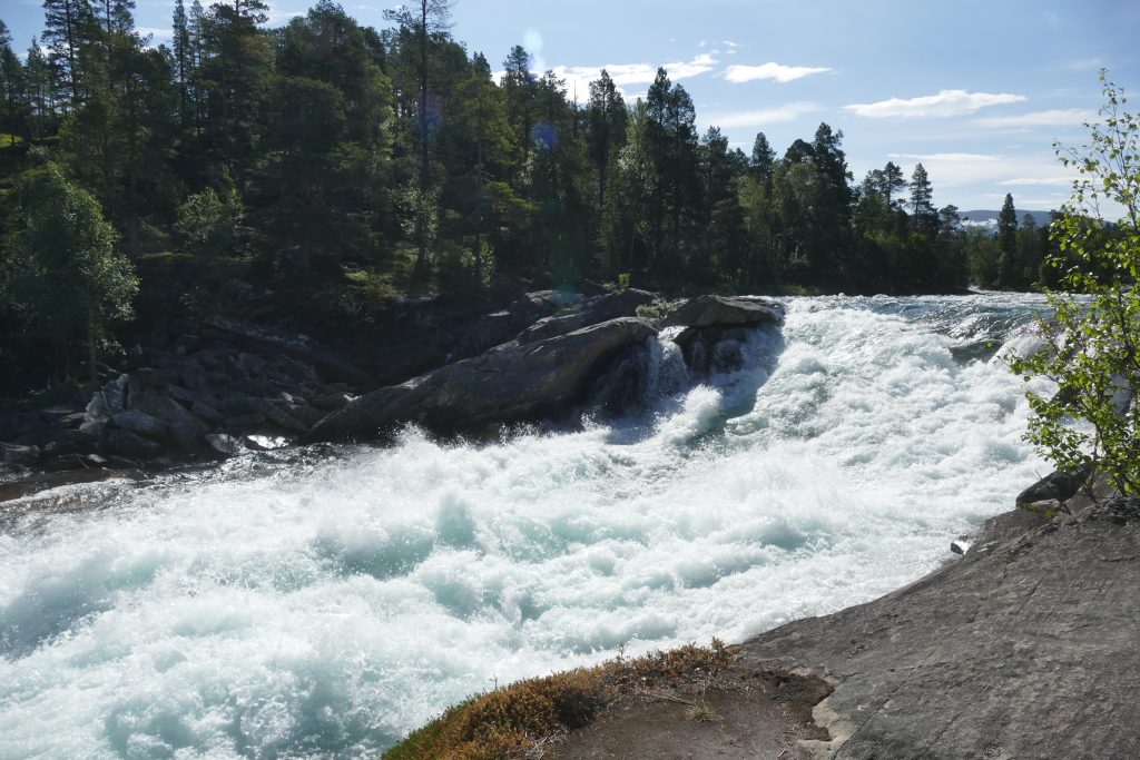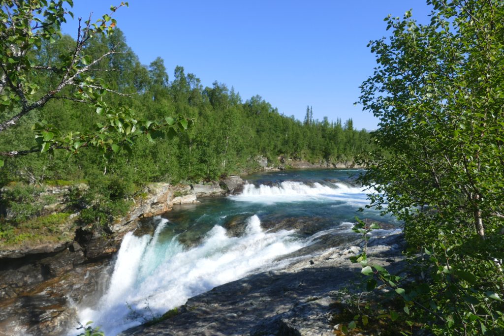 Heute fahren wir den Vildmarksvägen bis Stalon. Hier treffen wir auf den Sagavägen und biegen in nördliche Richtung ab. Wir kommen ein Stück durch das Naturreservat Marsfjäll bis Dikanäs und fahren noch weiter nach Kittelfäll. Hier wollen wir uns einer ersten Herausforderung stellen, indem wir auf den Kittelfjaellet auf 1.220 m hinauf wandern. Die 785 Höhenmeter sind bei fast 30° C eine echte Herausforderung. Zuerst geht ein schmaler Pfad durch Wald, der sich schon bald lichtet. Wir folgen den Steinmännchen stetig bergan. Kurz vor dem Gipfel kommt plötzlich eine Herde Rentiere auf uns zu. Alle Mühen sind vergessen. Am Gipfel wollen wir eine Rast einlegen, doch die beißenden Plagegeister vermiesen uns die Pause. Wir steigen ab, und schon steht die nächste Herausforderung vor uns. Kein Weg zu sehen, über Geröll und typische Hochgebirgsvegetation tasten wir uns langsam bergab. Als wir endlich die Skistation erreichen, ohne Schaden genommen zu haben, sind wir froh. Im Anschluss fahren wir weiter auf dem Sagavägen. Unterwegs kommen wir zum Fättjaur-See. Direkt an der Straße befindet sich ein kleiner Badeplatz, den wir für eine Abkühlung nutzen. Dann sind es noch ca. 30 km bis zu unserm Stellplatz in der Nähe von Skalmodal an einem schönen Wasserfall.