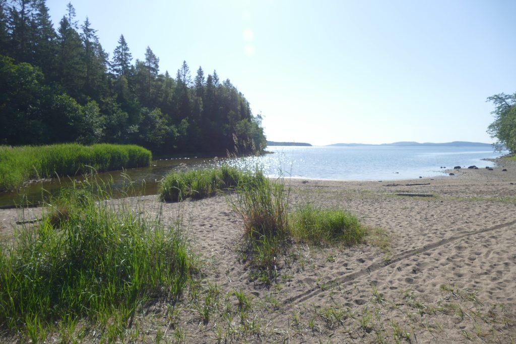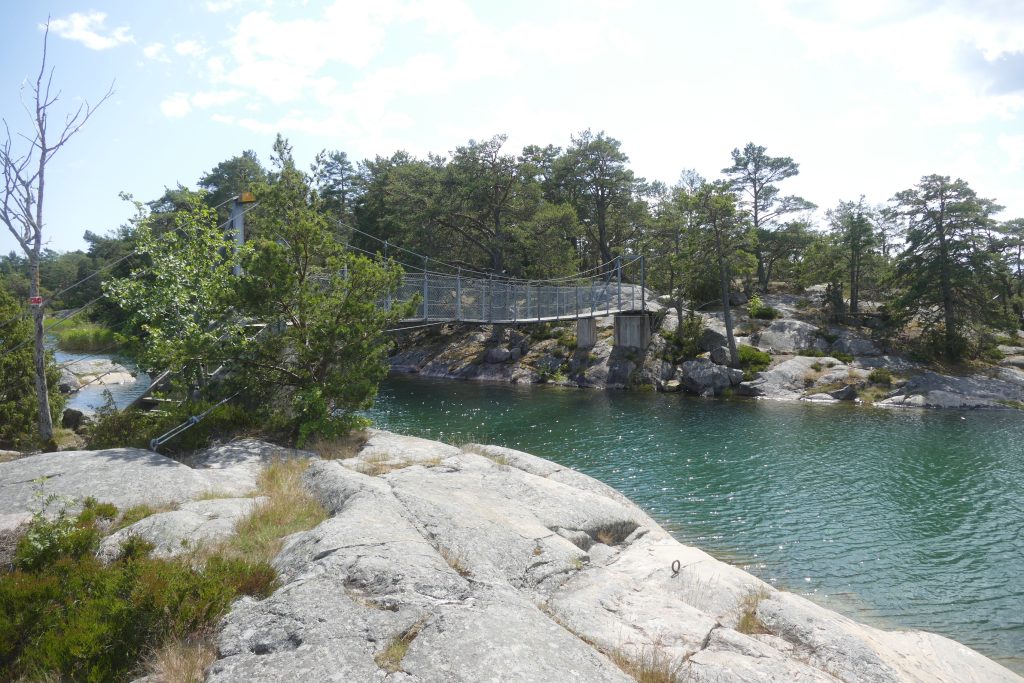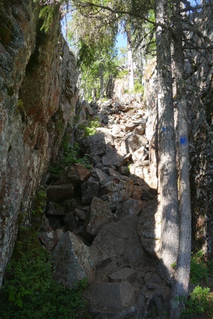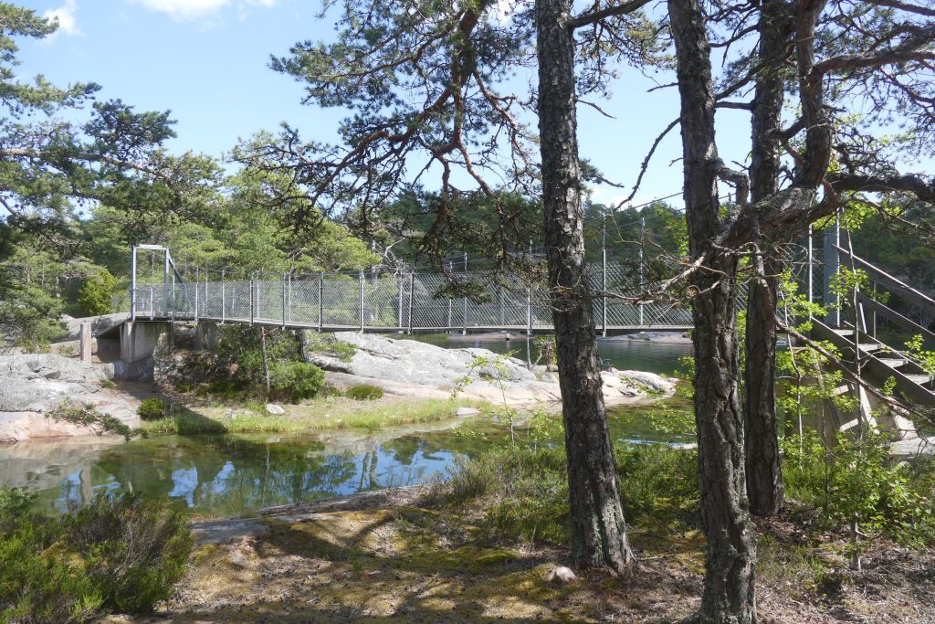 Vom Parkplatz führt eine 70 m lang Holzrampe zum Eingangsbereich am Steilufer des Salsviksbäcken. Wir nehmen den Höga Kusten-Wanderweg und passieren einen Sandstrand in Salsviken am Fuß des Krypenberget. Dann geht es steil bergan und durch eine enge Schlucht klettern wir hinauf zum Tärnättvattnen. Am See haben viele junge Leute ihre Zelte aufgebaut. Über Felsplatten steigen wir in südliche Richtung wieder hinab zum Meer und kommen an einer Geröllhalde der letzten Eiszeit vorbei. Danach folgen wir der Küstenlinie durch wilden Wald und kommen an Näskebordana vorbei zum Parkplatz zurück. Anschließend fahren wir in das Outdoorcenter Naturkampianet und weiter nach Örnsköldsvik wo wir am CK Örnen Downhill Park mit schöner Aussicht auf die Stadt parken.