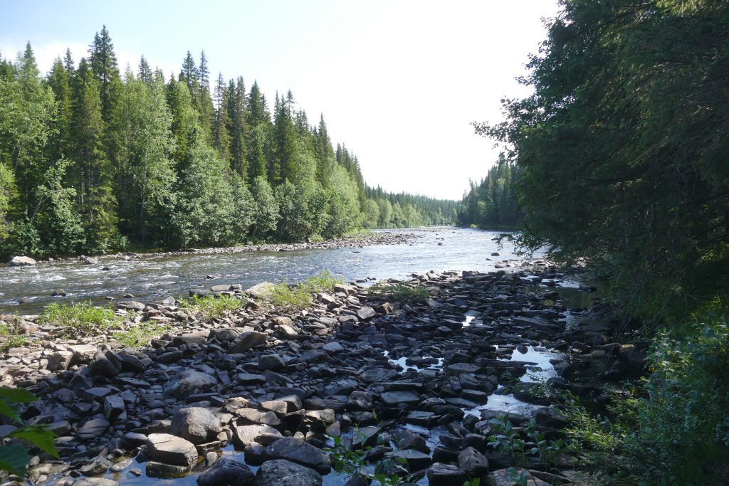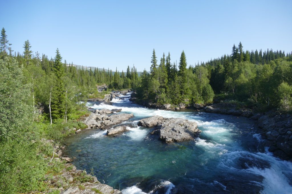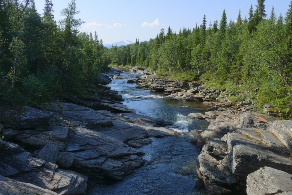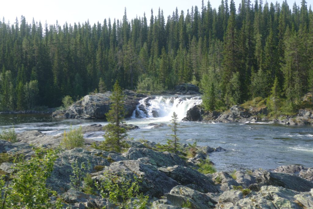 Wir fahren zum Ausgangspunkt unserer Wanderung in das Marsfjällens Naturreservat bei Fatmomakke. Das Naturreservat ist ein weitläufiges Gebiet, das sich vom Kahlfjäll im Westen bis zu den Moorhochebenen und Urwäldern im Osten erstreckt. Der mächtige und höchste Gipfel ist der Marsfjäll (1.587 m.ü.M). Ein großes Moorgebiet befindet sich auf der östlich des Marsfjällen gelegenen Hochebene, das in Wald mit urtümlichen Fichten übergeht. Vom Parkplatz wandern wir durch Bergfichtenwald in leichtem auf und ab über Wurzeln und Stege über das Moor bis wir eine Brücke über den Svartbäcken erreichen. Die Stromschnellen unter der Brücke sind gewaltig. Wir folgen dem Rodinsbäcken, der in den Svartbäcken mündet und hier in Bergbirkenwald übergeht. Dann kommen wir zu einer Hängebrücke über den Rodinsbäcken. Entlang des Baches erreichen wir bald die Marsfjällskåtan, von wo sich ein herrlicher Blick auf das Marsfjälls-Massiv eröffnet. Auf gleichem Weg gehen wir zurück zum Parkplatz. Im Anschluss fahren wir weiter nach Saxnäs, wo wir einkaufen und Wasser tanken können. Das nächste Highlight direkt an der Straße ist der Trappstegforsen, ein breiter Wasserfall bei dem das Wasser über viele Stufen nach unten fließt. Da hier viel Trubel herrscht, fahren wir noch ein Stück weiter zu einem Picknickplatz an den Stromschnellen Litsjöforsen. Von den Klippen am Flussufer mit Blick auf den gegenüberliegenden kleinen Wasserfall nehmen wir eine Abkühlung im Wasser.