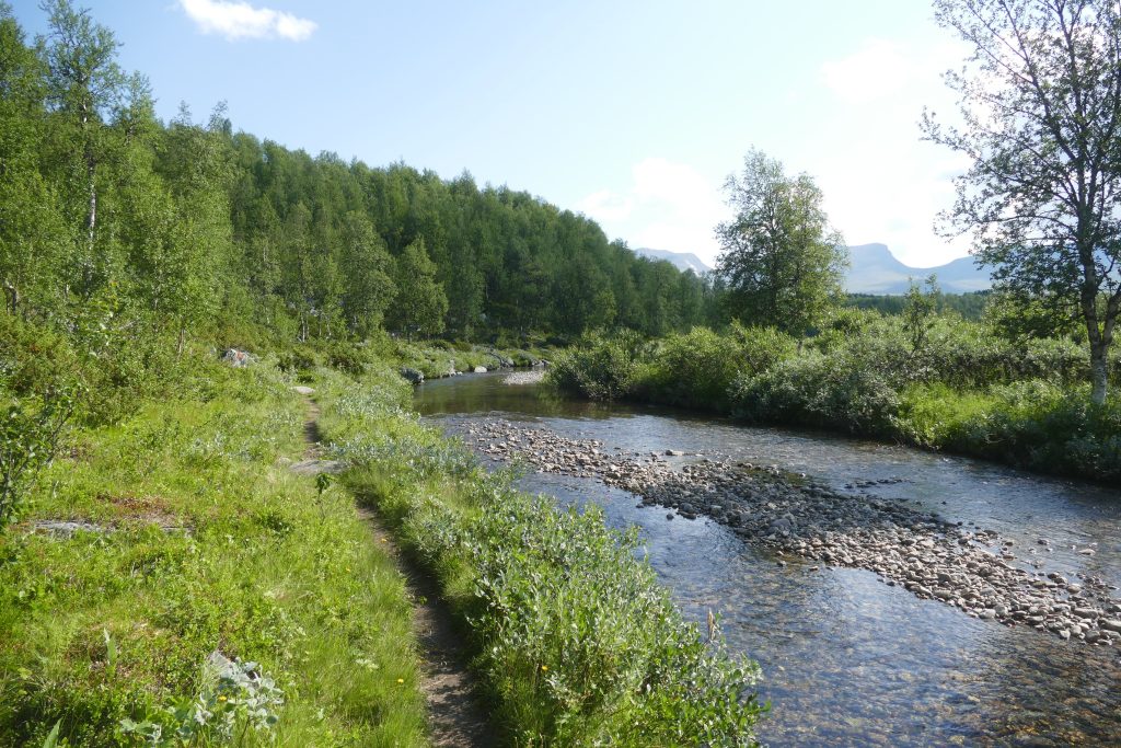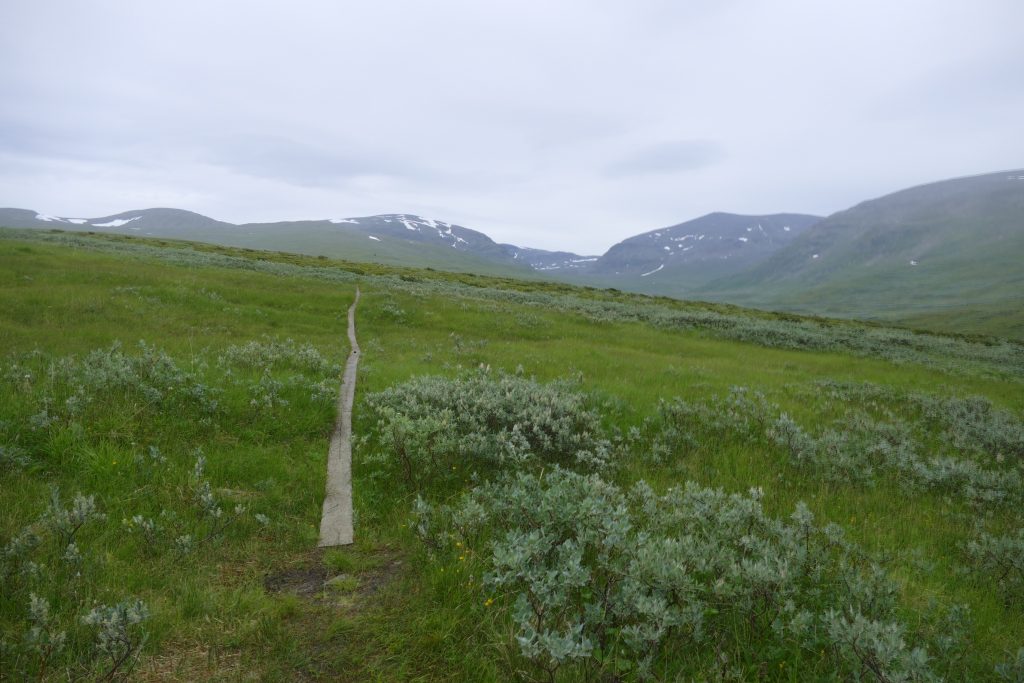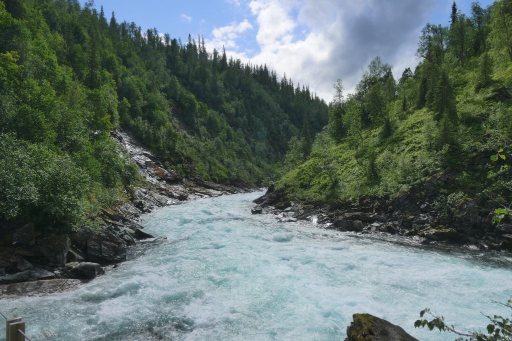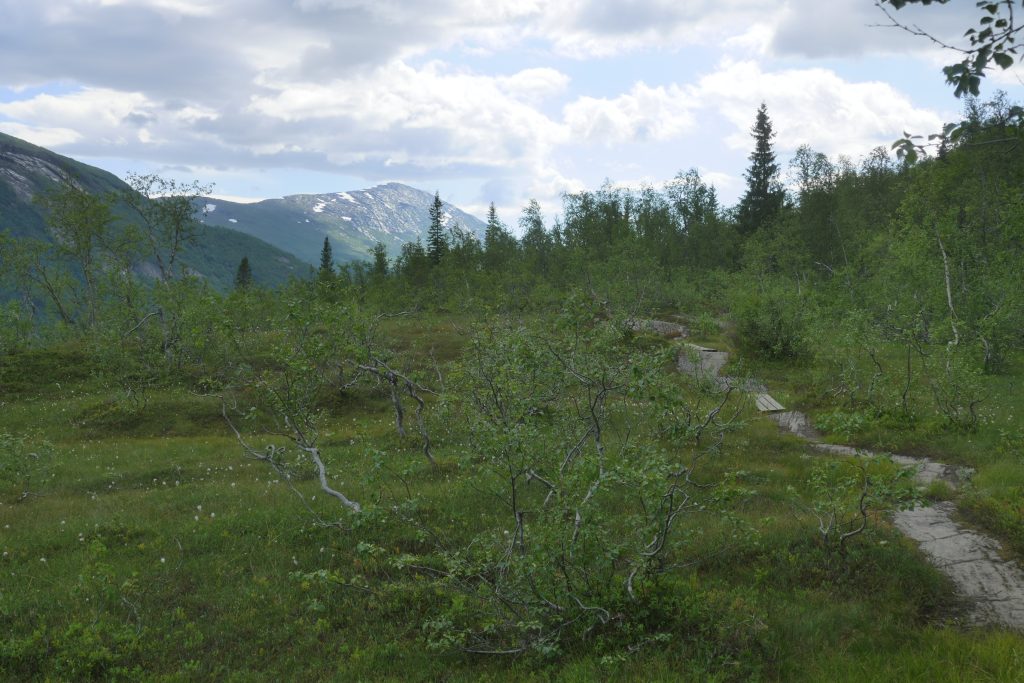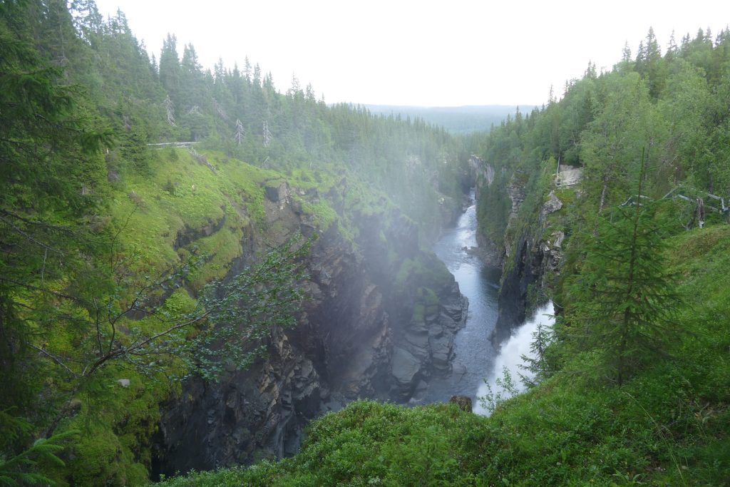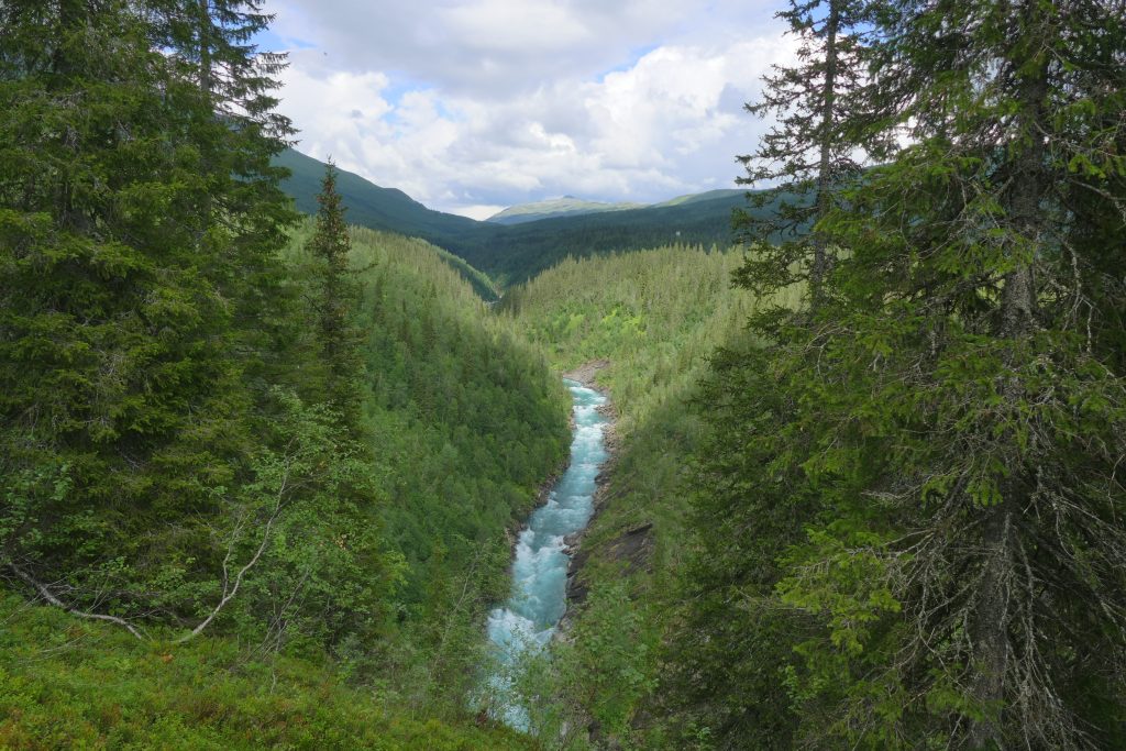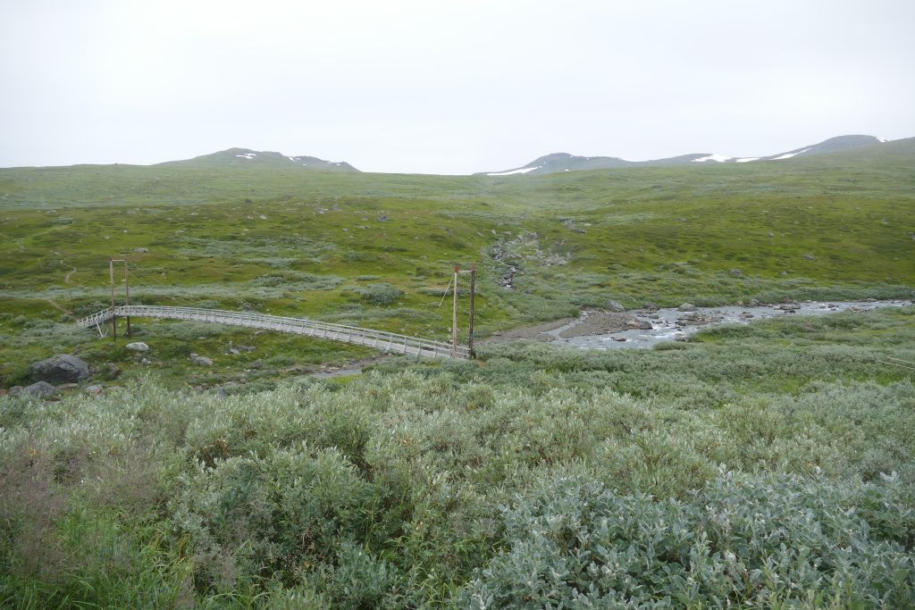 Am Morgen scheint noch die Sonne, doch schon bald ziehen dichte Wolken auf. Wir fahren nur wenige Kilometer zum Startpunkt der Wanderung entlang des Syterbäcken mit Blick auf den Viterskalet. Wir folgen dem Weg entlang des Baches Syterbäcken bis hinauf oberhalb der Baumgrenze. Mittlerweile hat es leicht angefangen zu regnen. Hier gehen wir hinunter zum Fluss, den wir über die Hängebrücke queren. Danach biegen wir auf den Kungsleden in Richtung Hemavan ab und erreichen unseren höchsten Punkt der Wanderung. Tief hängen die Wolken über dem Tal und geben nur wenig Sicht frei. Hier biegen wir ab und folgen dem Weg entlang der Schlucht, durch die der Bach verläuft, zurück zur E12 bei Syterbäcken. Wir fahren weiter auf der E12 bis zum Parkplatz an der Grenze nach Norwegen. Hier gefällt es uns nicht. Der Abzweig zu unserer geplanten Wanderung für morgen ist nur ein paar Kilometer entfernt. Doch da auch für morgen noch Regen angesagt ist, beschließen wir nach Mo i Rana zu fahren.