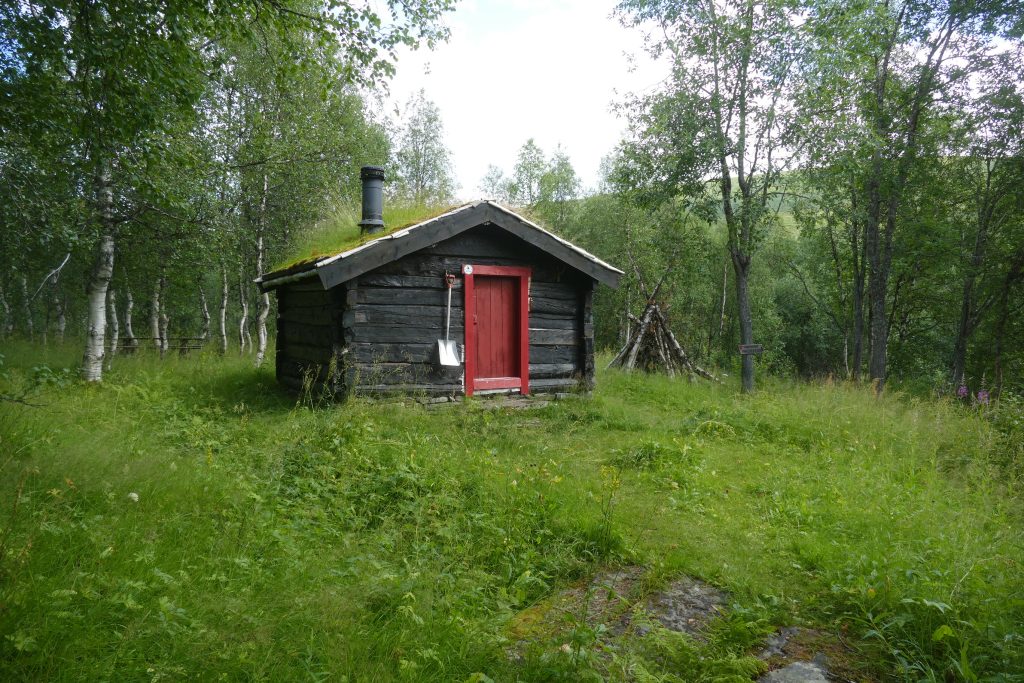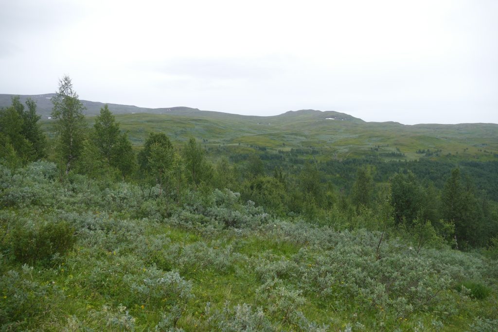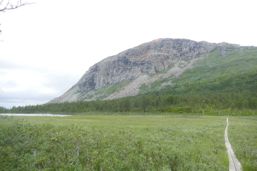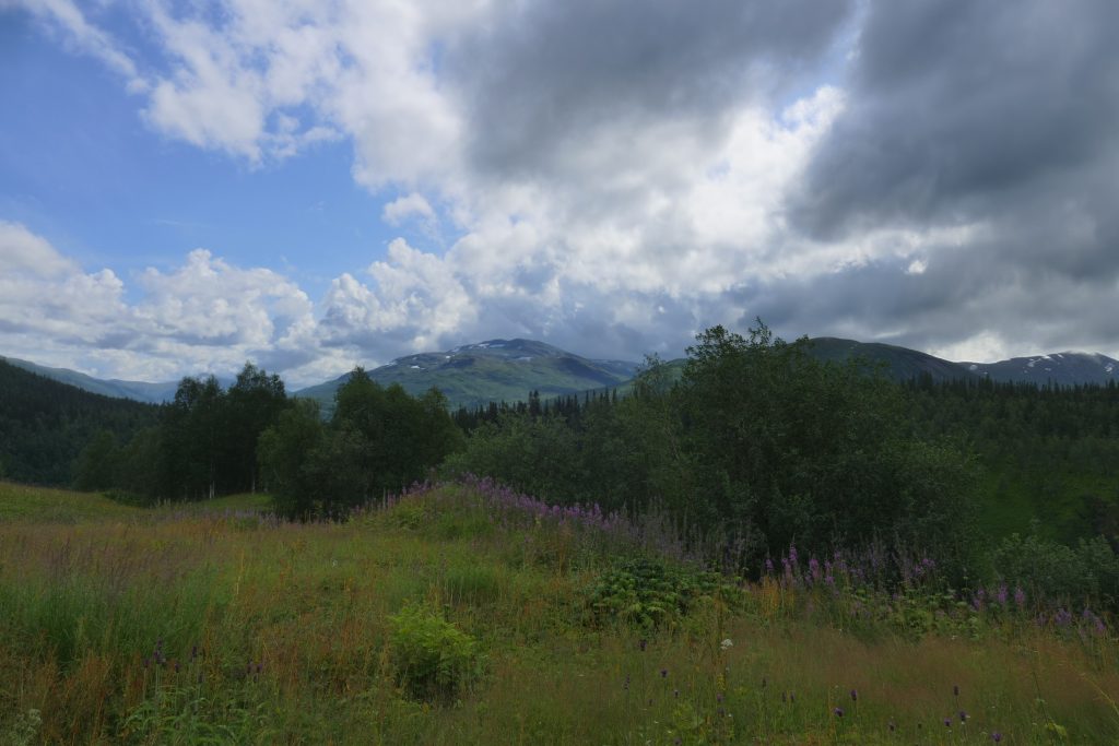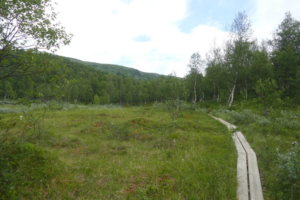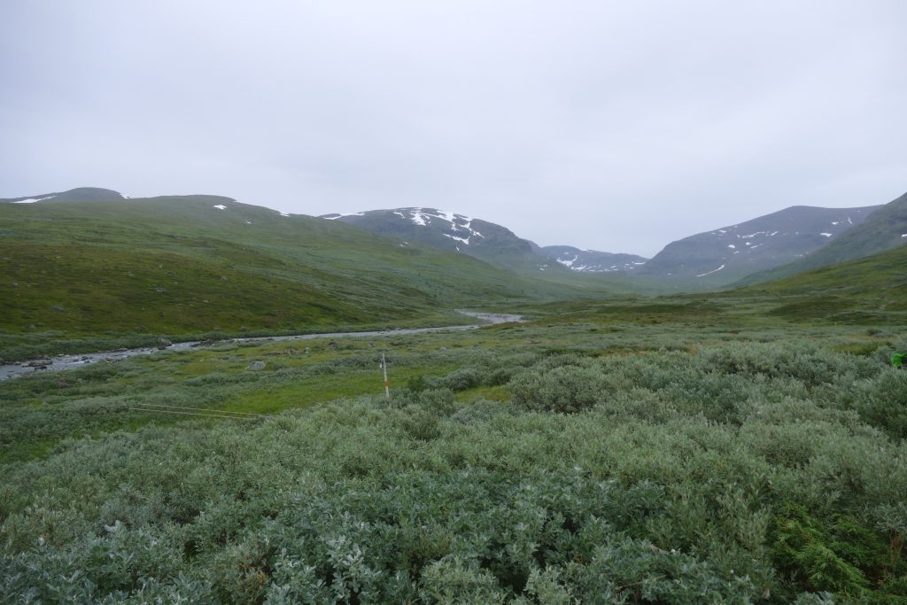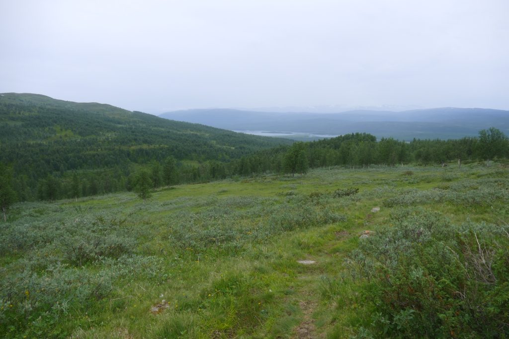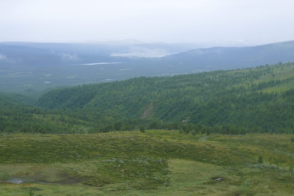 Am Morgen scheint noch die Sonne, doch schon bald ziehen dichte Wolken auf. Wir fahren nur wenige Kilometer zum Startpunkt der Wanderung entlang des Syterbäcken mit Blick auf den Viterskalet. Wir folgen dem Weg entlang des Baches Syterbäcken bis hinauf oberhalb der Baumgrenze. Mittlerweile hat es leicht angefangen zu regnen. Hier gehen wir hinunter zum Fluss, den wir über die Hängebrücke queren. Danach biegen wir auf den Kungsleden in Richtung Hemavan ab und erreichen unseren höchsten Punkt der Wanderung. Tief hängen die Wolken über dem Tal und geben nur wenig Sicht frei. Hier biegen wir ab und folgen dem Weg entlang der Schlucht, durch die der Bach verläuft, zurück zur E12 bei Syterbäcken. Wir fahren weiter auf der E12 bis zum Parkplatz an der Grenze nach Norwegen. Hier gefällt es uns nicht. Der Abzweig zu unserer geplanten Wanderung für morgen ist nur ein paar Kilometer entfernt. Doch da auch für morgen noch Regen angesagt ist, beschließen wir nach Mo i Rana zu fahren.