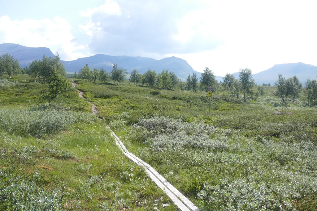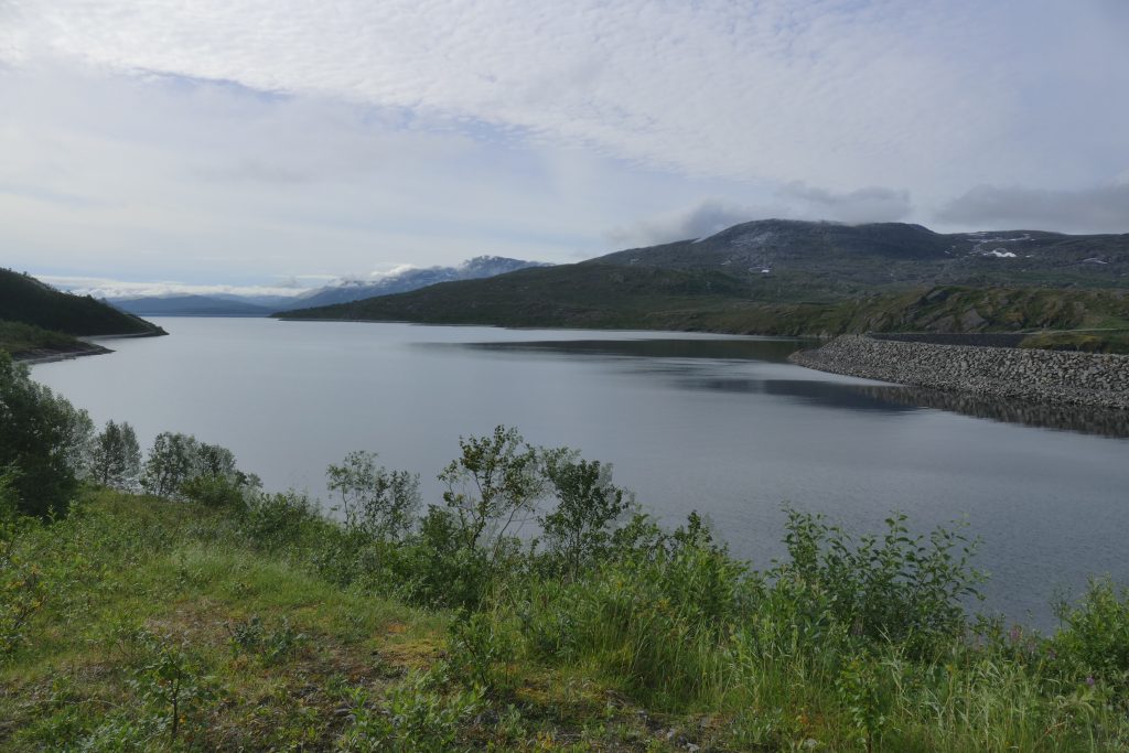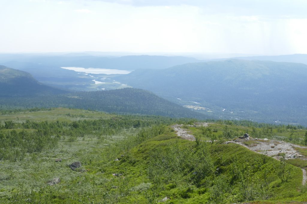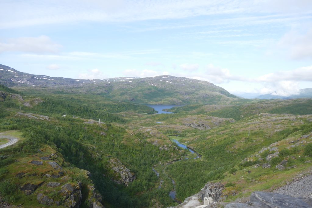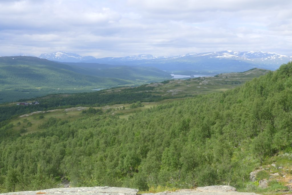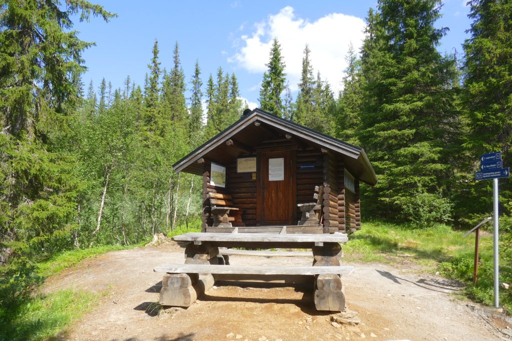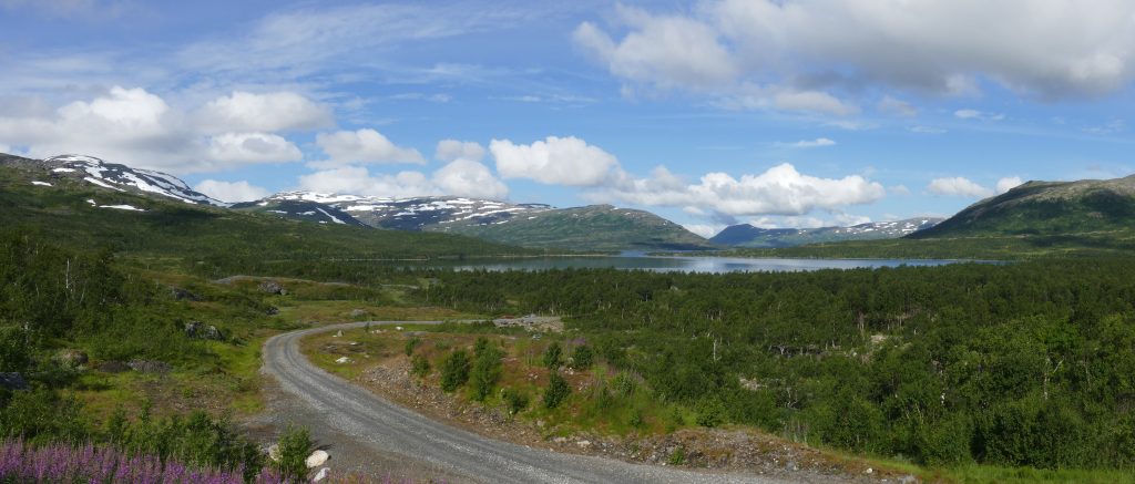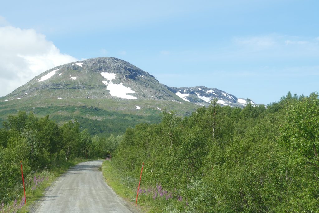 Wir verlassen unseren Stellplatz und fahren weiter Richtung Schweden, bis wir auf die E12 kommen. Hier biegen wir nach Hemavan ab. Die E12 ist hier der Blå Vägen, eine der beliebtesten Roadtrip-Routen. Die Route schlängelt sich von Norwegen durch Schweden und Finnland und ist rund 1.800 Kilometer lang, wobei 460 Kilometer durch Schweden führen. Von der norwegischen Grenze bei Högstaby bis Hemavan und weiter bis nach Holmsund ist der spektakulärste Abschnitt. Der Name der Straße leitet sich von dem langen Fluss Blaue Ume ab, der entlang der Straße fließt. In Hemavan machen wir einen Einkaufsbummel. Dabei finden wir eine Karte der Umgebung mit Wandervorschlägen. Nach kurzer Überlegung beschließen wir doch noch eine kleine Wanderung zu unternehmen, zumal das Wetter gut aussieht. Wir fahren ein Stück zurück auf den Wanderparkplatz in Laisaliden. Hier starten wir zur Wanderung auf den Gielestjåhke, der sich auf dem kahlen Berg oberhalb von Laisaliden befindet. Zuerst steigt der Weg stetig bergan und wird zunehmend steiler, bis wir auf einen Kammweg stoßen, immer mit herrlicher Aussicht auf die Berge von Norwegen. Wir folgen dem Sommerwanderweg in Richtung Gielestjåhke und kommen an zwei Seen vorbei. Mittlerweile haben wir ca. 900 Höhenmeter erreicht und der Himmel hat sich zugezogen. Zudem bläst ein eiskalter Wind. Noch weiter auf den Gipfel des 1195 m hohen Gielestjåhke zu wandern macht keinen Sinn, da wir dazu auch zu spät gestartet sind. So kehren wir um und nehmen einen Parkplatz in Hemavan am naturum Visitor Centre.
