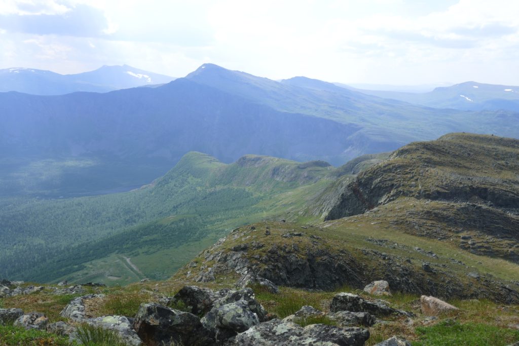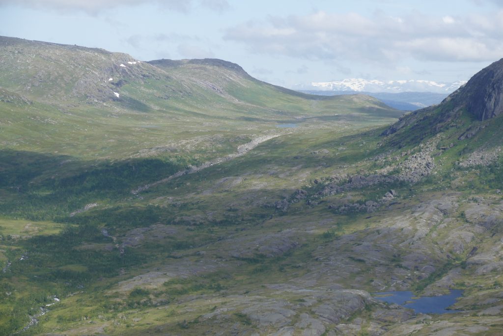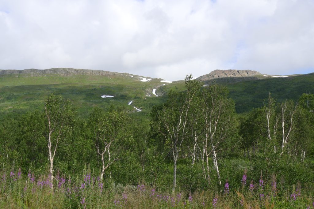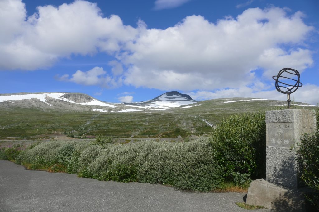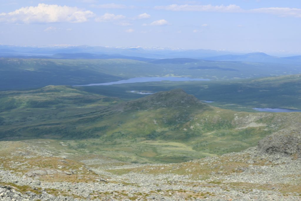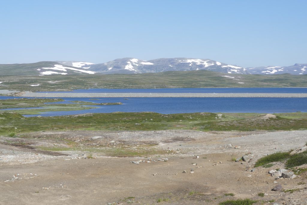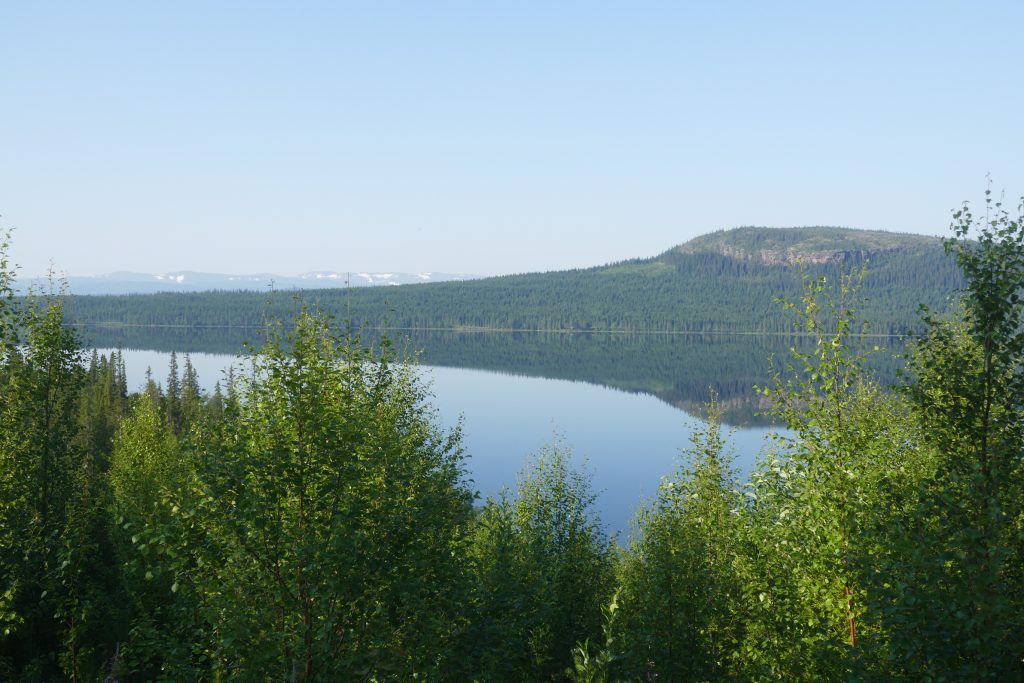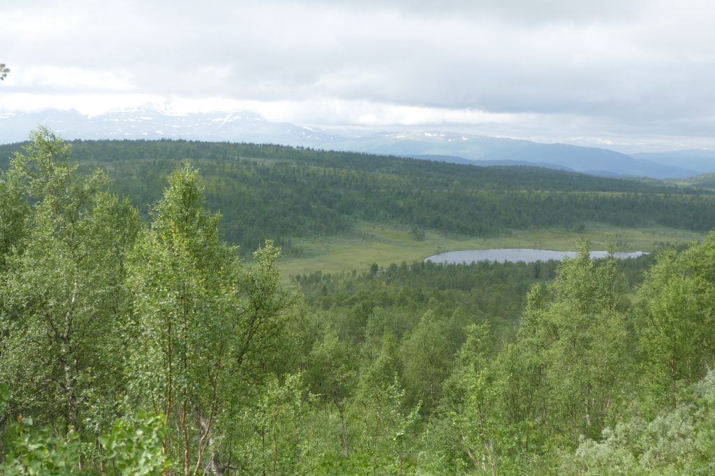 Wir verlassen unseren Stellplatz und fahren weiter Richtung Schweden, bis wir auf die E12 kommen. Hier biegen wir nach Hemavan ab. Die E12 ist hier der Blå Vägen, eine der beliebtesten Roadtrip-Routen. Die Route schlängelt sich von Norwegen durch Schweden und Finnland und ist rund 1.800 Kilometer lang, wobei 460 Kilometer durch Schweden führen. Von der norwegischen Grenze bei Högstaby bis Hemavan und weiter bis nach Holmsund ist der spektakulärste Abschnitt. Der Name der Straße leitet sich von dem langen Fluss Blaue Ume ab, der entlang der Straße fließt. In Hemavan machen wir einen Einkaufsbummel. Dabei finden wir eine Karte der Umgebung mit Wandervorschlägen. Nach kurzer Überlegung beschließen wir doch noch eine kleine Wanderung zu unternehmen, zumal das Wetter gut aussieht. Wir fahren ein Stück zurück auf den Wanderparkplatz in Laisaliden. Hier starten wir zur Wanderung auf den Gielestjåhke, der sich auf dem kahlen Berg oberhalb von Laisaliden befindet. Zuerst steigt der Weg stetig bergan und wird zunehmend steiler, bis wir auf einen Kammweg stoßen, immer mit herrlicher Aussicht auf die Berge von Norwegen. Wir folgen dem Sommerwanderweg in Richtung Gielestjåhke und kommen an zwei Seen vorbei. Mittlerweile haben wir ca. 900 Höhenmeter erreicht und der Himmel hat sich zugezogen. Zudem bläst ein eiskalter Wind. Noch weiter auf den Gipfel des 1195 m hohen Gielestjåhke zu wandern macht keinen Sinn, da wir dazu auch zu spät gestartet sind. So kehren wir um und nehmen einen Parkplatz in Hemavan am naturum Visitor Centre.