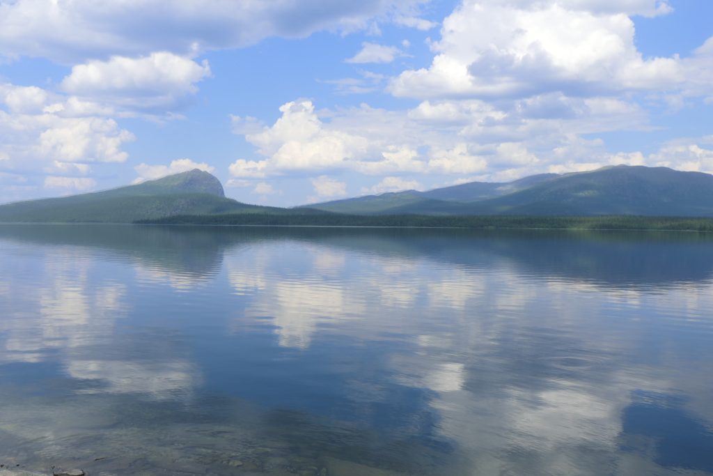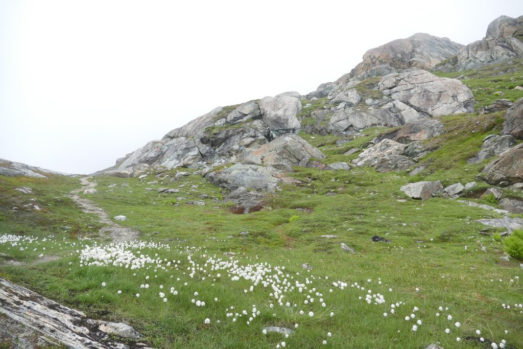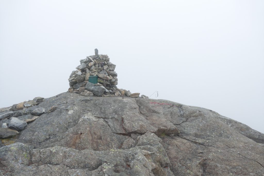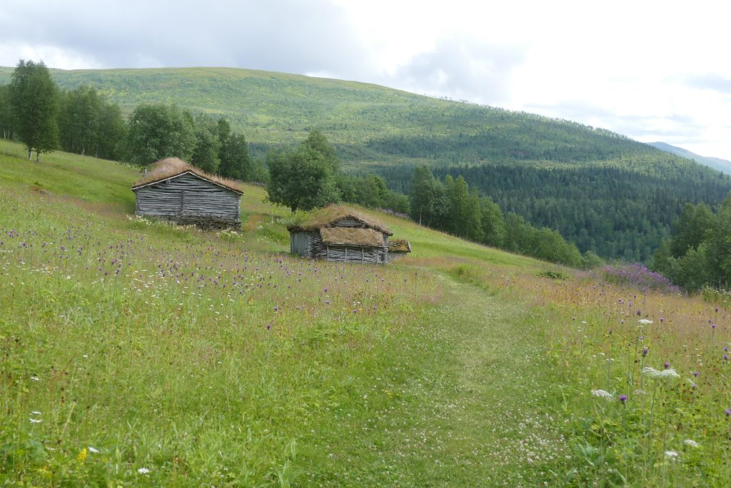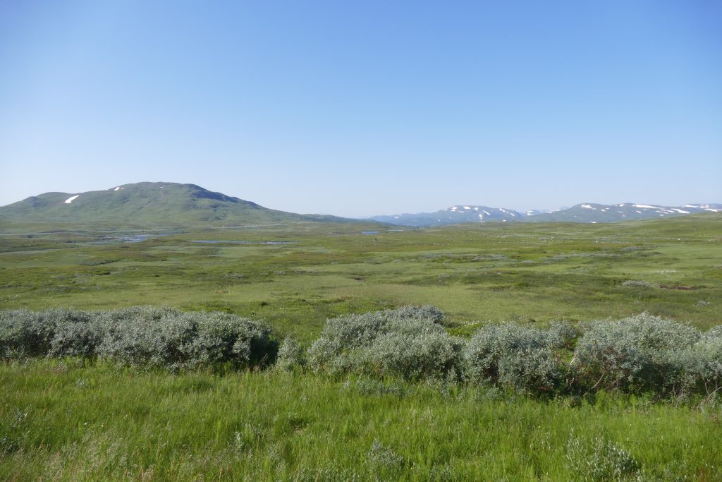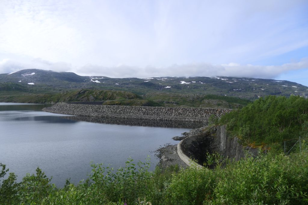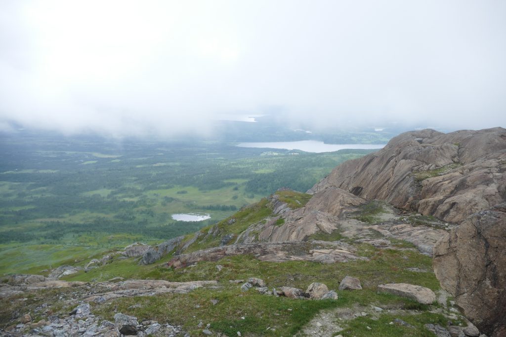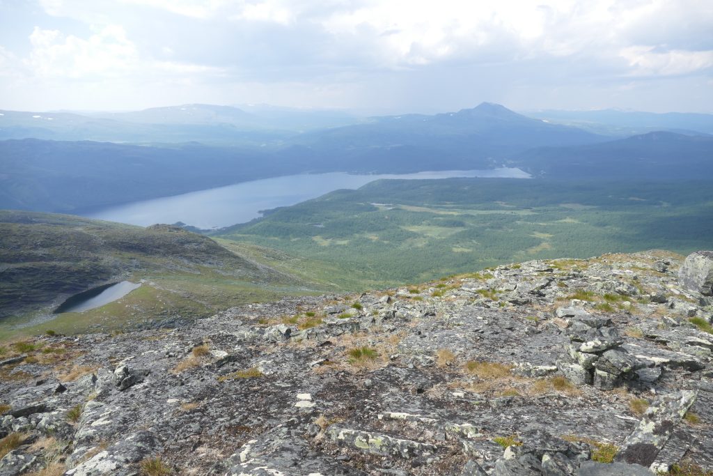 Wir passieren die Grenze zu Norwegen in Skalmodal. Hier heißt die Märchenstraße Sagaveien oder Sagavegen und führt über Hattfjelldal und Trofors nach Brønnøysund an die Küste von Helgeland. Der nächste Parkplatz ist nicht weit von Hattfjelldal entfernt. Hier wollen wir auf den 1123 m hohen Hatten wandern. Es ist heute bedeckt und die Temperaturen sind mit 19° C und einer leichten Brise ideal für eine Wanderung. Zuerst geht der Weg durch Birkenwald. Dann überqueren wir auf Stegen ein Moor. Der erste Blick auf unser Ziel wird sichtbar. Noch verhüllt sich der „Hut“ in Wolken. Es folgt der zum Teil recht steile Anstieg in der baumlosen Zone. Wir kommen an Schneefeldern vorbei und haben einen herrlichen Ausblick auf die gegenüberliegenden Berge mit letzten Schneeresten, sowie auf die Landschaft unter uns. Auf dem letzten Stück des Aufstieges müssen wir über Felsen klettern, doch der Weg ist gut markiert. Endlich ist der Steinhaufen, der den Gipfel markiert, erreicht und ein Kobold begrüßt uns. Leider sind wir von Wolken umgeben, sodass die Sicht gleich null ist. Wir halten uns nicht lange auf und beginnen auf dem gleichen Weg den Abstieg. Danach verlassen wir den Sagavegen und fahren ein Stück in Richtung Schweden, wo wir an der Straße einen schönen Parkplatz mit toller Aussicht auf den Røssvatnet, Norwegens zweitgrößten Binnensee finden.