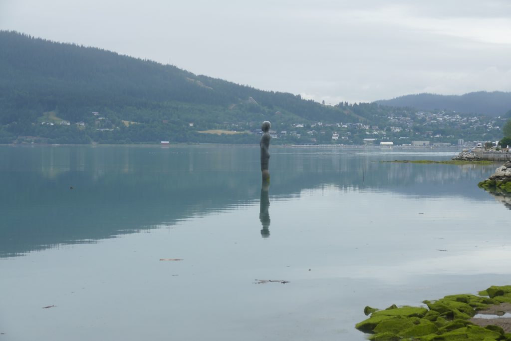 Regen am Morgen, wie es die Wettervorhersage gemeldet hat. Wir fahren zur Tankstelle und füllen Wasser auf. Um die Ecke ist die Gasfüllstation, wo wir LPG tanken. Und da alles auf einem Platz ist, gehen wir noch zu KIWI und REMA1000 einkaufen. Nun noch die Entsorgung und dann fahren wir noch zu einem Caravanhändler. Leider hat er nicht die baugleiche Lampe, die kaputtgegangen ist. Mittlerweile hat der Regen aufgehört und wir gehen zum Rangfjorden, wo die Skulptur des Oceanman im Wasser steht. Ein paar Schritte weiter sind hübsche alte Holzhäuser. Durch einen Fußgängertunnel kommen wir in die Geschäftsstraße und entdecken ein Sport-Outlet. Hier bekommen wir Schuhe, die „wasserdicht“ versprechen. Na, wir werden es schon bald testen. Ein Blick auf den Wetterbericht verspricht teilweise Sonne für morgen. So entschließen wir uns die ca. 35 km zurück auf der E12 Richtung Schweden zu fahren. Wir parken auf der Zufahrtsstraße zur Wanderung zum Okstindbreen. Wir drücken die Daumen, dass es morgen mit dem Wetter klappt.