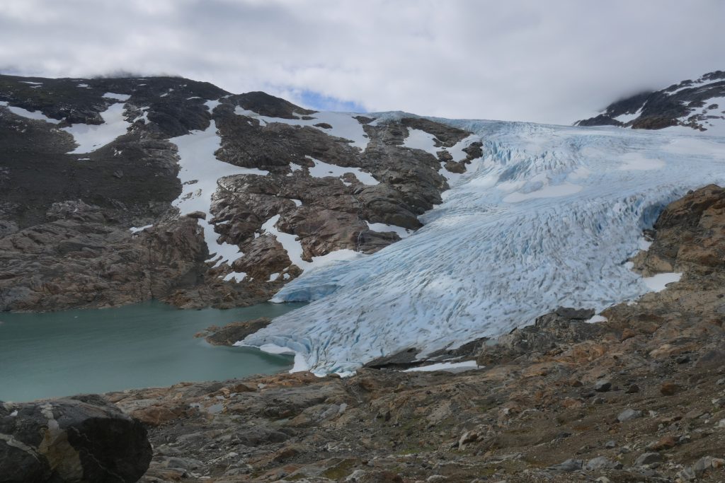 11° C und die Berge hüllen sich noch in Wolken, doch der Himmel sieht vielversprechend aus. Wir machen uns auf die beschwerlichen 45 km bis zum Ausgangspunkt unserer Wanderung zum Gletscher Okstindbreen zwischen den Gipfeln des Okstindan-Massivs, welches auch wegen seiner Höhe als das Dach Nordnorwegens gilt. Die ersten 15 km sind noch auf einer kleinen Asphaltstraße, doch dann wird es hart. Die Piste ist voller Schlaglöcher und dann folgt ein langes Stück mit groben Schotter. Wir brauchen ca. 1,5 h bis zum Parkplatz unweit der Kjensvasshytta-Hütte. Mit einer Fläche von rund 46 Quadratkilometern ist der Okstinbreen der achtgrößte Gletscher Norwegens und einer der beiden Hauptgletscher soll der älteste Gletscher Norwegens sein. Vom Parkplatz geht ein einfacher doch anstrengender, ca. 2,3 km langer Aufstieg zum Teil durch nasses Gelände aufwärts bis über die Baumgrenze. Hier beginnt ein älteres Gletscherflussbett und es wird steiniger. Wir erreichen einen Regenwasser-See und blicken über den See Kjennsvatnet und ein traumhaftes Panorama. Ein Pfad führt auf einer kurzen Distanz direkt zu einem Abhang, von dessen Rand wir auf ein spektakuläres Motiv blicken. Das blau strahlende Eis der Gletscherzunge Austre Okstindbreen mit ihrem grünlich schimmernden Abflusssee und dem darüber thronenden Gipfel des Oksskolten Gipfel. Nur an wenigen Orten in Norwegen hat man die Gelegenheit, dem Eis so nah zu kommen. Die beschwerliche Anfahrt hat sich gelohnt. Wir nehmen den gleichen Weg zurück und fahren im Anschluss zurück nach Mo i Rana.