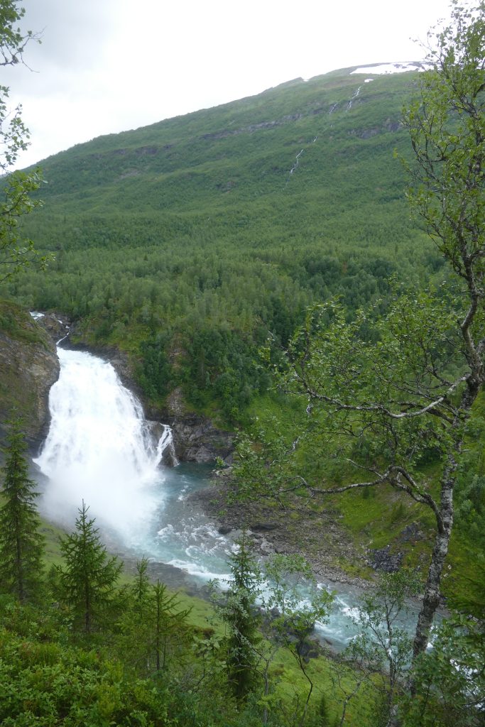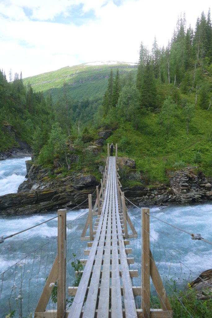 Mal wieder Regen. So erledigen wir erst einmal die üblichen Dinge und fahren anschließend auf der E6 in nördliche Richtung ca. 50 km bis wir das Schild Storvollen sehen. Hier biegen wir ab und parken am Fluss. Es hat mittlerweile aufgehört zu regnen und wir starten unsere Rundwanderung Bredekrunden im Nationalpark Saltfjellet-Svartisen, der zwischen dem Fluss Ranelva und der Europastraße 6 im Dunderlandsdalen liegt. Wir gehen über die Brücke und folgen dem allmählich den Hang hinauf windenden Pfad. Wir überwinden einige Höhenmeter bevor der steile rutschige Pfad hinunter zur ersten Hängebrücke über der türkisfarbenen Tespa führt. Nach einem weiteren Anstieg kommen wir zum Abzweig zum verlassenen Bergbauernhof Inner-Bredek. Wir folgen dem Rundwanderweg weiter zu einer zweiten, kleineren Hängebrücke und schon bald sind wir am Hof Bredek, einer ehemaligen imposanten Farm auf einer Hochebene auf 320 m Höhe. Weiter auf dem Bredekrunden überqueren wir die nächste Hängebrücke über den Stormdalsåga und schon bald hören wir das zunehmende Grollen und Tosen des Wasserfall Bredekfossen. Doch zuerst nehmen wir noch zum Abzweig zum Bauernhof, Granneset. Von hier aus kommen wir dann den perfekten Aussichtspunkt mit einem schwindelerregenden Blick auf den Bredekfossen. Die Wassermassen stürzen mit einem ohrenbetäubenden Rauschen in die ca. 40 m Schlucht. Nun beginnt der Abstieg zurück nach Storvollen und unserem Parkplatz, den wir nach einer weiteren Hängebrücke über den Fluss Ranaelva erreichen.