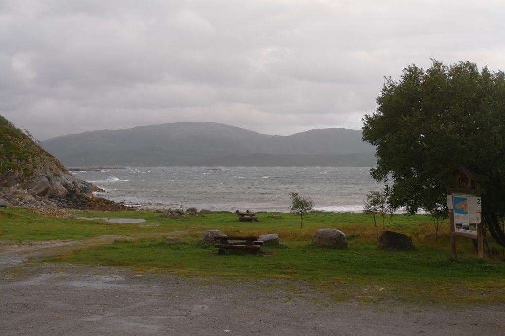 Wir verlassen unseren schönen stürmischen Platz auf der Insel Jøa und fahren zum Parkplatz an der Jøatrappa, einer Holztreppe mit 932 Stufen hinauf auf den Ramnfjellet. Hier müssen wir die Parkgebühr über eine APP bezahlen. Wir laden diese und versuchen zu bezahlen. Jedoch benötigen wir dazu ein norwegisches Konto. Schade. Also kehren wir um, fahren zur Fähre und setzen über nach Ølhammeren. Auf der 767 /769 fahren wir weiter nach Namsos, wo wir kurz unterbrechen. Dann sind wir wieder auf der Fv17 und fahren in südliche Richtung bis zum Abzweig auf die 720. Entlang des Beitstadfjorden führt die Straße durch abgelegene Orte und eine sanfte Landschaft. Warum wir eine Mautstation auf dieser schmalen und recht holprigen Straße passieren, ist unklar. Doch die Landschaft entschädigt, auch wenn durch den Regen die gegenüberliegende Seite nicht auszumachen ist. In Varrabotn nehmen wir die kleine Straße, die uns zur 755 nach Leksvik bringt. Nun fahren wir entlang des Trondheimsfjorden, bis wir direkt am Fjord einen schönen Parkplatz mit Blick auf den Fjord finden.