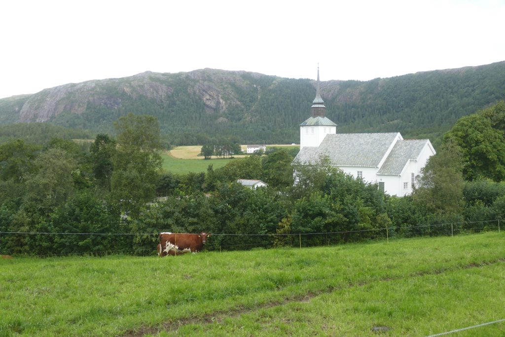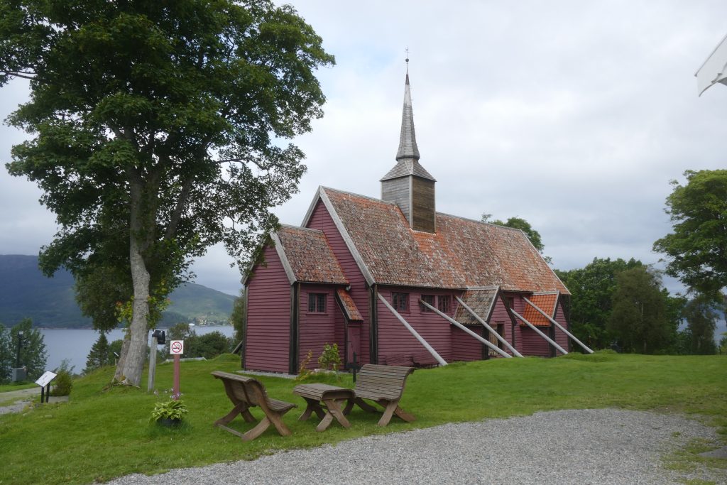 Da wir 2023 bereits in Kristiansund waren, fahren wir weiter. Zuerst durch den 5779 m langen Atlanterhavstunnelen, mit 10 % Gefälle geht es hinunter auf 250 m unter dem Meeresspiegel und wieder hinauf auf die Atlantikstraße. Wir biegen jedoch schon bald auf die südliche Straße der Insel Averøy ab. Durch ein Schild werden wir auf die Stavkirke Kvernes aus dem 13. Jahrhundert aufmerksam und legen einen kurzen Stopp ein. Dann folgen wir der Straße bis Mork. Am kleinen Schild mit der Aufschrift „Stikk UT“ biegen wir auf eine abenteuerliche, sehr steile, kleine Schotterstraße zum Wanderparkplatz Meekknoken ab.