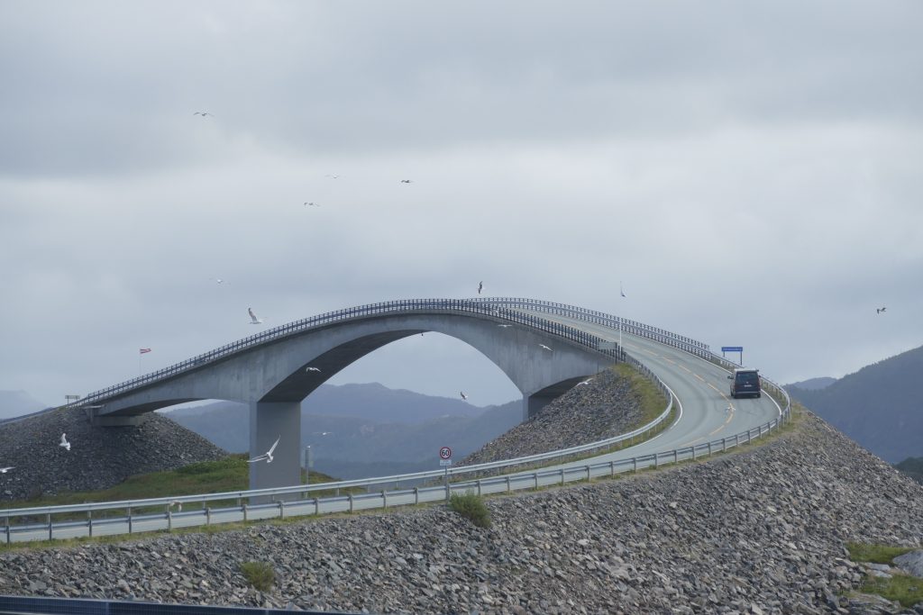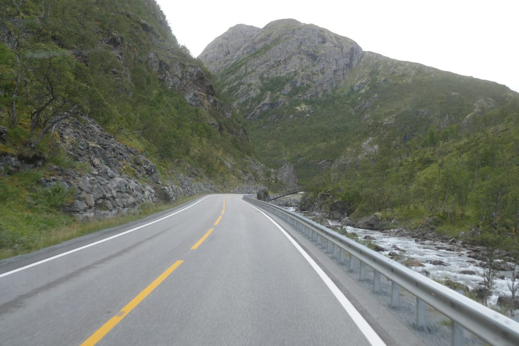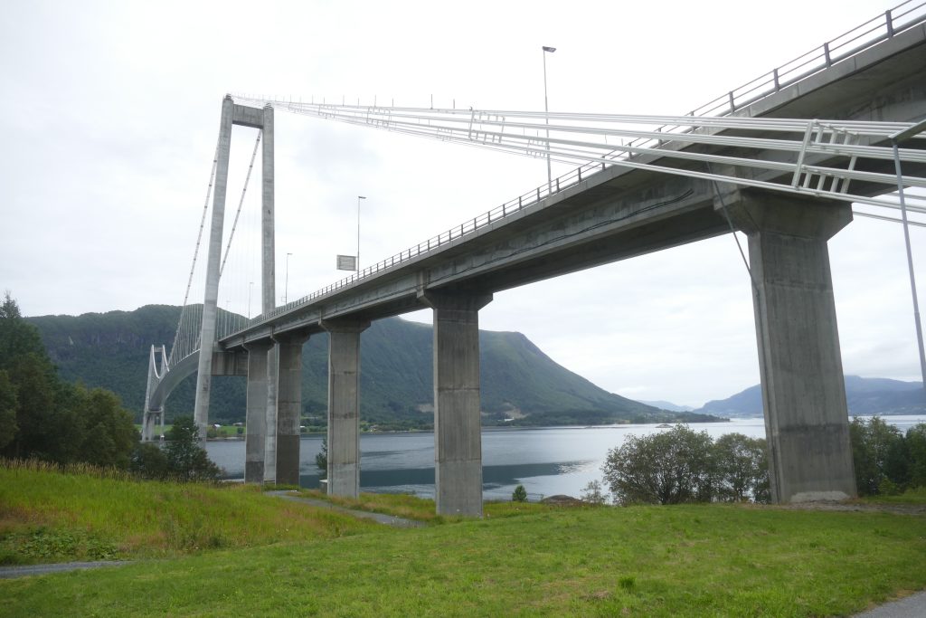 Über dem Trondheimsforden liegt Nebel und Sprühregen. Trondheim auf der gegenüberliegenden Seite ist nicht mehr zu sehen. Wir fahren zur Fähre Rørvik nach Flakk und setzten über. Wir umfahren Trondheim auf der 707 entlang von Feldern und kleinen Bauernhöfen. In Klett biegen wir auf die E39 und schon folgen jede Menge Tunnel bis Orkanger. Wir bleiben auf der E39 bis zur nächsten Fähre von Halsa nach Kanestraum. Kurz danach biegen wir auf die 70 in Richtung Kristiansund ab. Mittlerweile hat es aufgehört zu regnen. Wir fahren noch bis auf die Insel Bergsøya, wo wir direkt an der Gjemnessund-Brücke über den Gjemnessundet parken. Den Nachmittag nutzen wir für unsere weitere Planung der Reise.