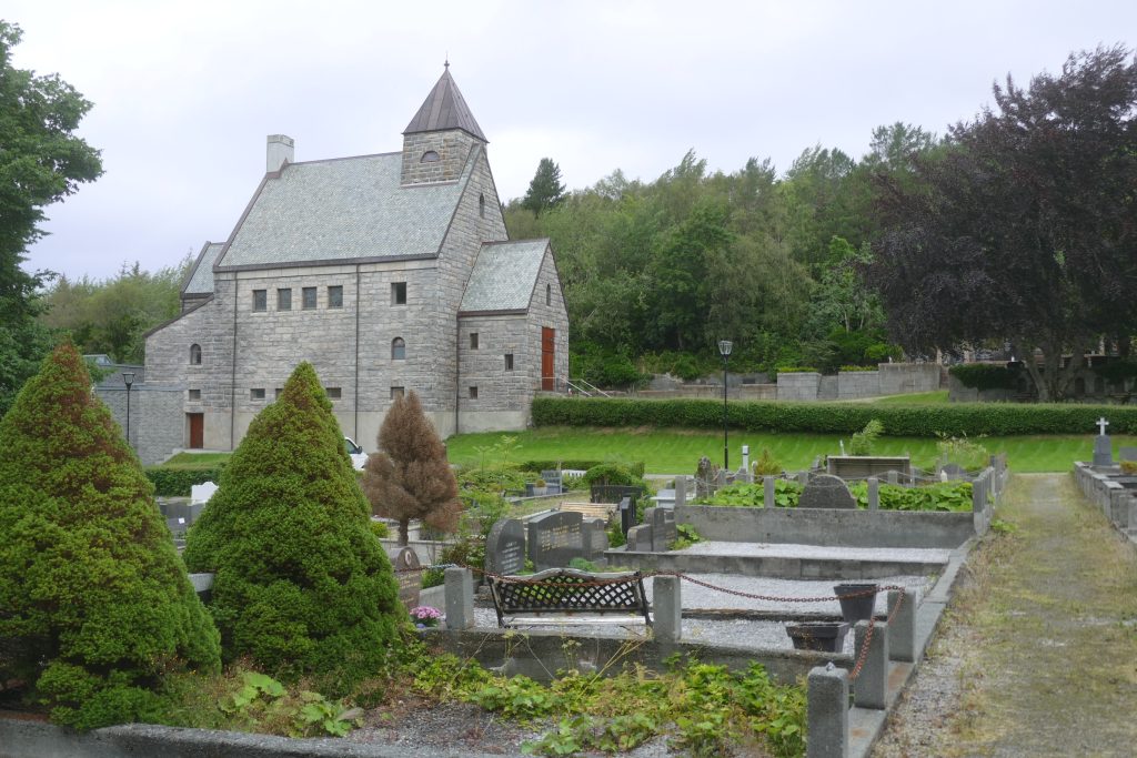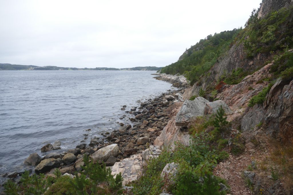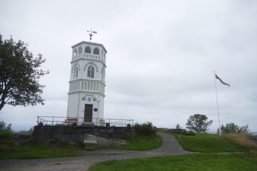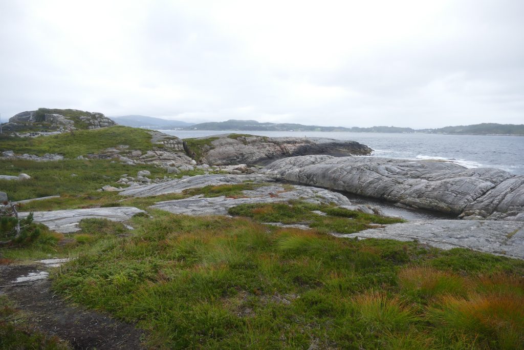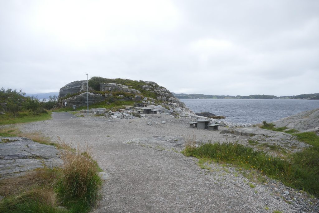 Heute fahren wir durch den 5086 m langen Freidfjordtunnelen weiter auf der 70 nach Kristiansund. Wir finden etwas außerhalb einen kleinen Parkplatz mit dem Hinweis auf eine Wanderung. Dort angekommen, schauen wir uns die Wandertafel an und sehen, dass es eine Bergwanderung an der Küste mit verschiedenen Sehenswürdigkeiten gibt. Wir beginnen auf einem befestigten Weg, der uns nach wenigen Metern zum 78 m hohen Varden, einem Aussichtsturm führt. Wir steigen hinauf und genießen den Panoramablick über Kristiansund und den Atlantik sowie auf das Fischerdorf Grip und Smøla. Es geht weiter ein Stück in Richtung Stadt und dann biegen wir auf den Wanderweg ab. Es ist ein abwechslungsreiches Wandergelände über Wurzeln und Bäume, an der felsigen Küste klettern wir über Steine. Zum Glück gibt es ab und an Seile zur Sicherung. Feuchte Stellen sind mit Holzbohlen überbrückt. An der Küste kommen wir an den deutschen Bunkern aus dem Zweiten Weltkrieg vorbei, mit herrlichem Blick auf das Meer. Dann führt der Wanderweg hinunter zum Rastplatz Klubba und die Landzunge herum nach Storhaugen. Hier wechselt die Landschaft in einen alten Wald. Wir kommen zum Friedhof Kirkelandet. Jetzt ist es nicht mehr weit bis zu unserem Parkplatz.
