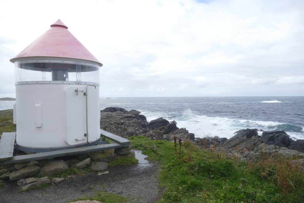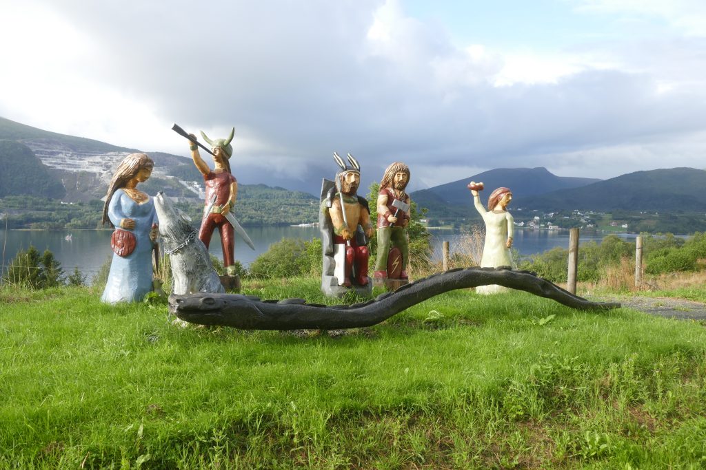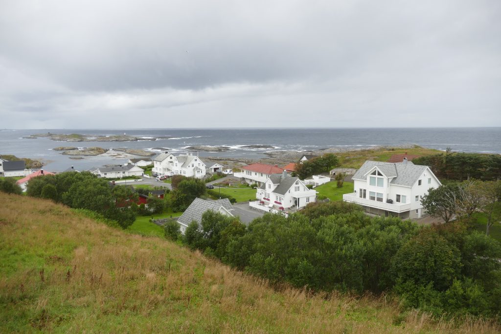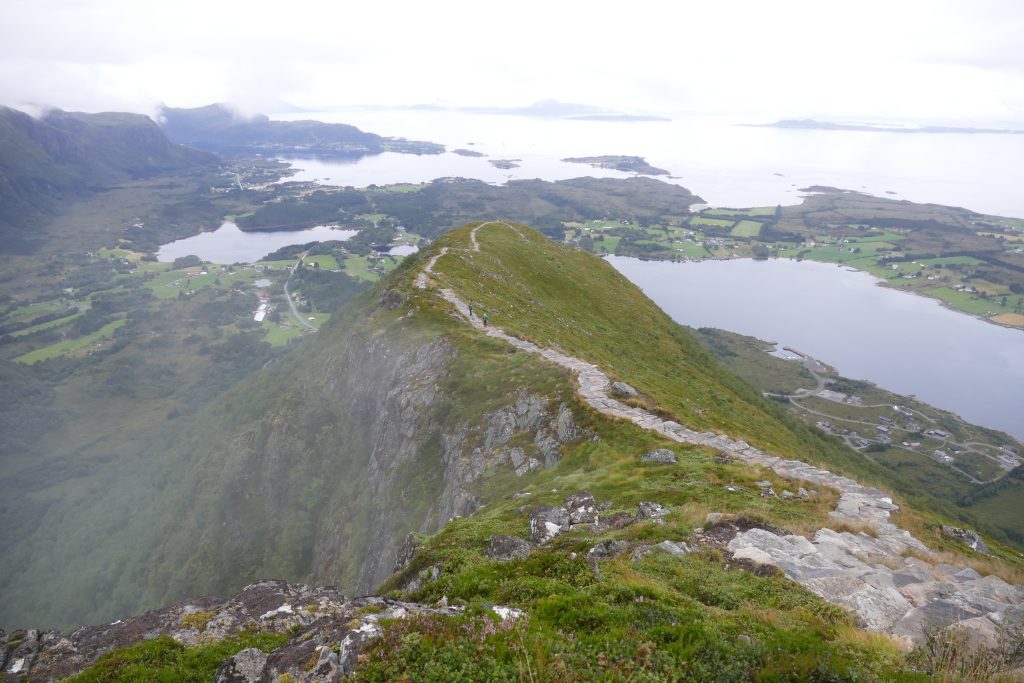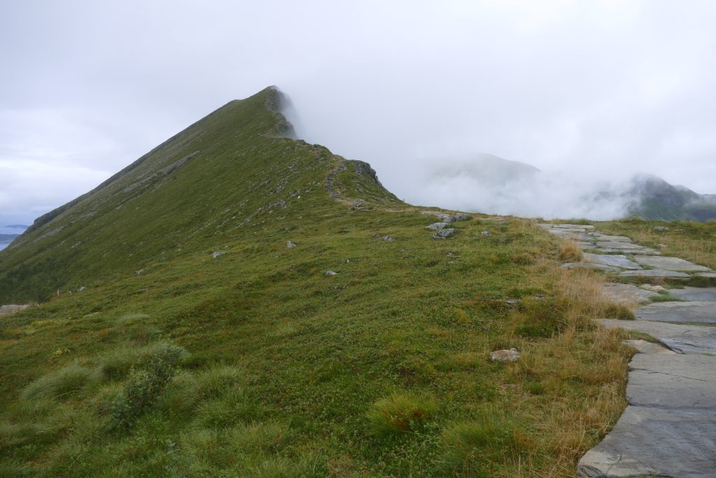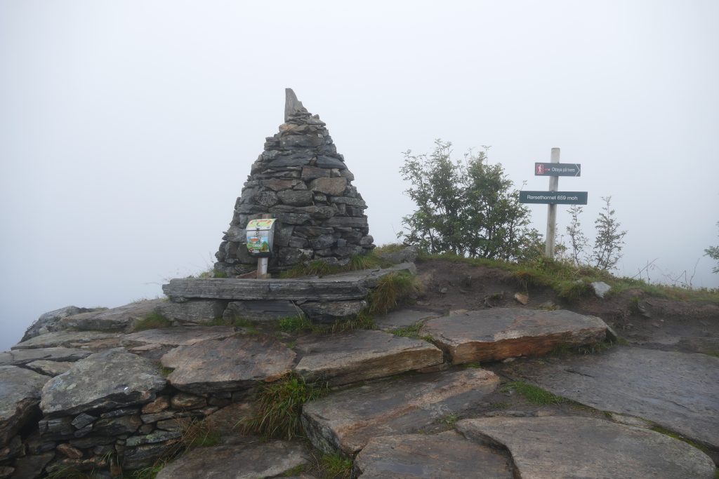Am Morgen haben wir noch die Hoffnung, die Wanderung auf den Sjurvarden zu machen. Doch dann kommt ein kräftiger Regenguss und die Berge sind weg. So fahren wir weiter auf dem Atlanterhavsvegen zum Aussichtspunkt in Askevågen am Ende einer Mole und dem Aussichtspunkt in Kjeksa in der Nähe von Bud. Vom Strand schauen wir auf das Fahrwasser und das offene Meer mit einer der berüchtigsten Meeresabschnitte Norwegens, der Hustadvika. In Bud machen wir einen kurzen Halt, um uns das Kystfort Ergan aus dem 2. Weltkrieg anzusehen. Da es immer noch trüb und mit 10° C recht kalt ist, fahren wir weiter bis zum Fähranleger Mordal nach Solholmen auf die Insel Otrøya und weiter in Richtung Midsund, bis zum Parkplatz in Rakvåg auf der Nordseite der Insel. Hier ist der Ausgangspunkt für die Midsundtrappene. 2200 Stufen, die von Sherpas aus Nepal errichtet wurden, führen auf den 659 m hohen Rørsethornet. Der Regen hat eine Pause eingelegt und so machen wir uns auf den Aufstieg. Wir erreichen den ersten Aussichtspunkt mit einer Steinpyramide und das Ziel kommt in Sicht. Oben angekommen zieht sich der Himmel rasch zu und wir können unsere Mühen nicht genießen. So hatten wir uns das nicht gedacht. Dann fängt es auch noch an zu regnen und wir beeilen uns wieder nach unten zu kommen.