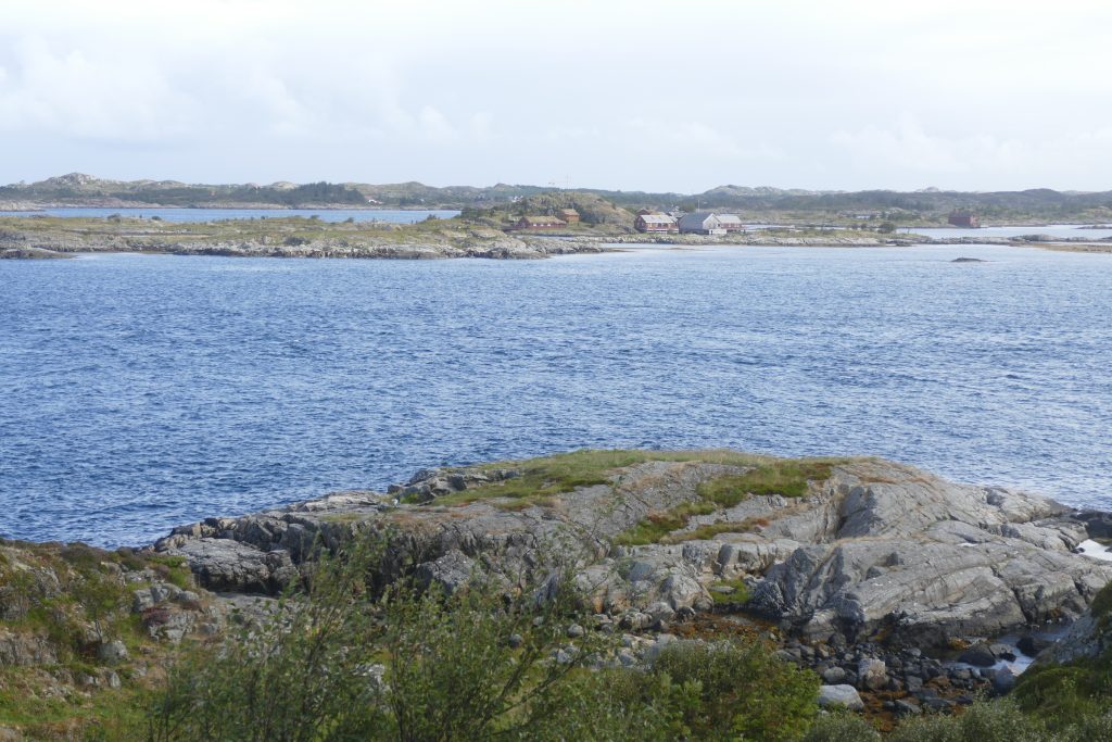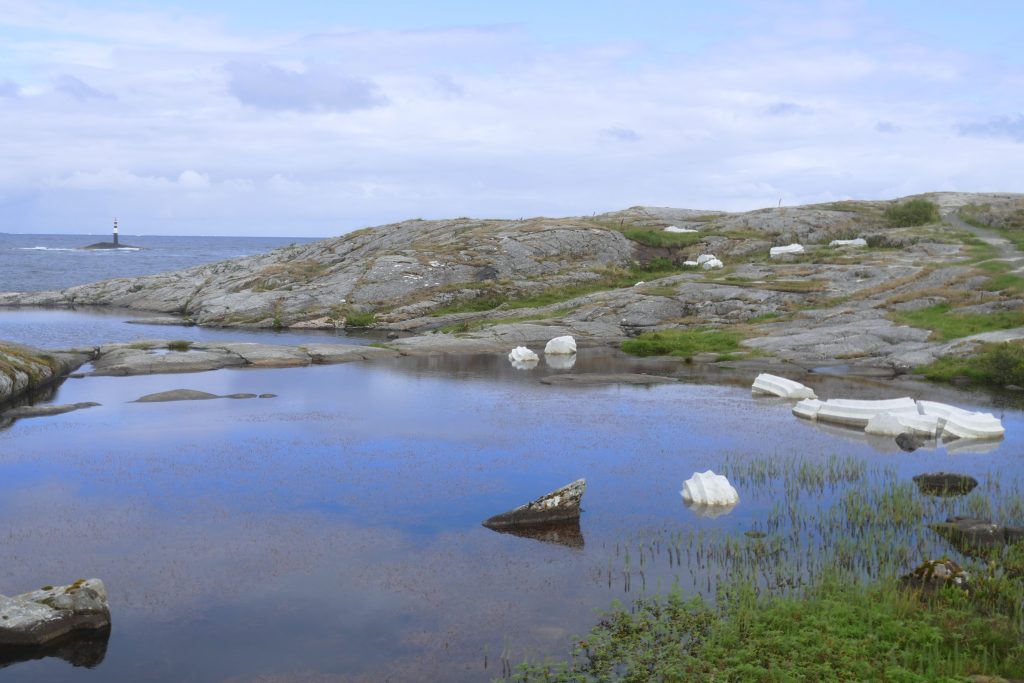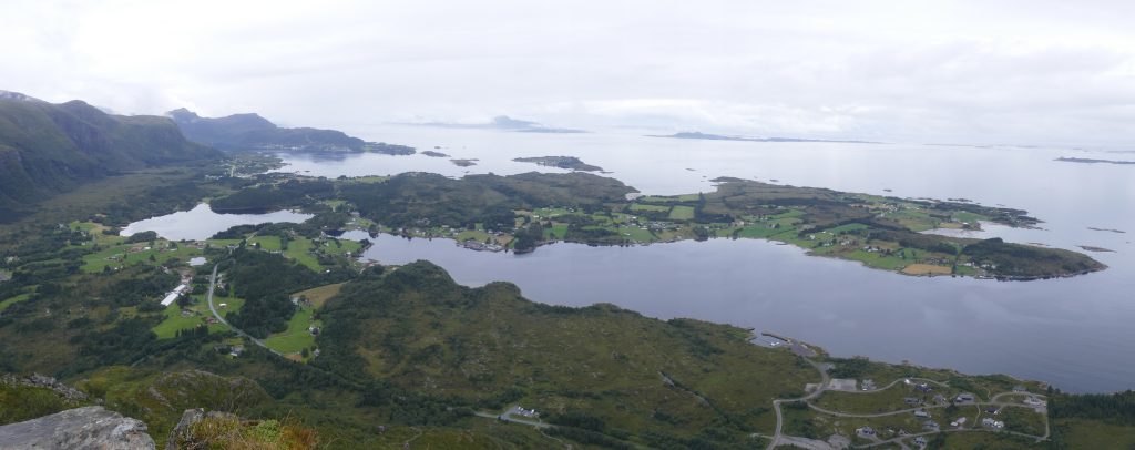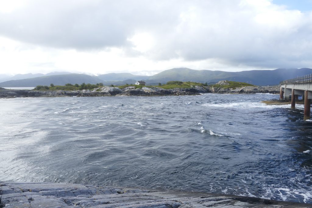 Regen, Regen und noch mehr Regen. Einen kurzen Moment haben wir am Morgen die Hoffnung, dass es sich bessert. Doch nein, wir gehen nicht auf den Meekknoken, der sich in Wolken hüllt. Die steile Abfahrt ist nun zu bewältigen. Wir fahren weiter um die Insel Averøy bis nach Kårvåg und zum ersten Rastplatz auf dem Atlanterhavsvegen, eine der atemberaubendsten Straßen der Welt. An der Geitøy-Brücke haben wir einen schönen Panoramablick auf den Schärengarten. Ein Angelsteg führt unter die Brücke, wo gerade das Wasser mit mächtigen Strudeln in den Atlantik zurückfließt. Sonne und Regen wechseln sich heute ständig ab. Ein Höhepunkt des Atlanterhavsvegen ist die Storseisundrua die größte und beeindruckendste der 8 Brücken auf der Landschaftsroute, die sich wie verdreht zwischen die Inseln zwängt. Auf der Insel Eldhusøya nehmen wir den Aussichtsweg, der entlang der Küste führt. Zu beiden Seiten der Myrbærholmbrua wurden Angelerstege eingerichtet. Wir gehen hinunter zu den Klippen und sehen den Anglern zu, wie sie im starken Gezeitenstrom Dorsch, Pollack, Makrele und Seelachs aus dem Meerwasser holen. Hier muss auch ein altes Schiffswrack liegen, doch finden wir den Parkplatz mit der Aussicht darauf nicht. Wir fahren noch ein Stück weiter zum nächsten Rastplatz, Hågå in Vevang, wo wir den Küstenwanderweg mit den Teilen von weißen Säule laufen. Wie zufällig angespült liegen die Teile der griechischen Säulen zwischen den Klippen. Die Landschaftsroute verläuft weiter entlang von Küstenkulturlandschaften und hügeligen Heidelandschaften bis zu den kahlen Bergkuppen am rauen, offenen Küstenabschnitt Hustadvika. Hier befindet sich der Rastplatz Farstadsanden mit den nördlichsten Dünen der Welt und einer geschützten Sanddünenlandschaft. Wir nehmen den Weg am Strand entlang und folgen der Küstenlinie bis zum Leuchtturm Nordneset. Im Anschluss fahren wir ca. 6 km zurück zu einem kleinen Parkplatz mit schöner Aussicht auf die Schären in der Nähe unseres morgigen Wanderziels.