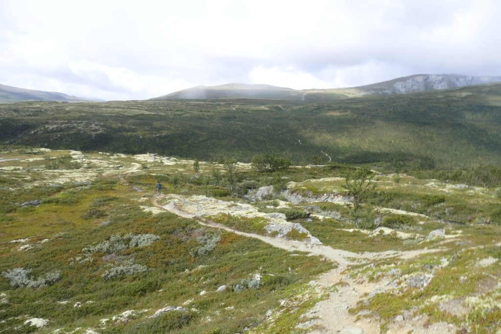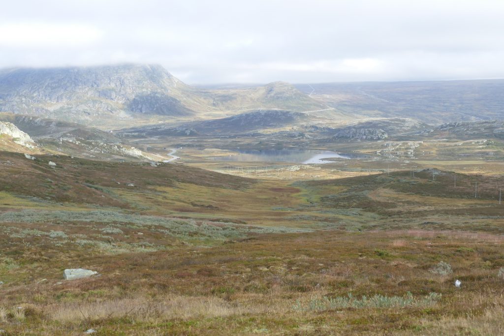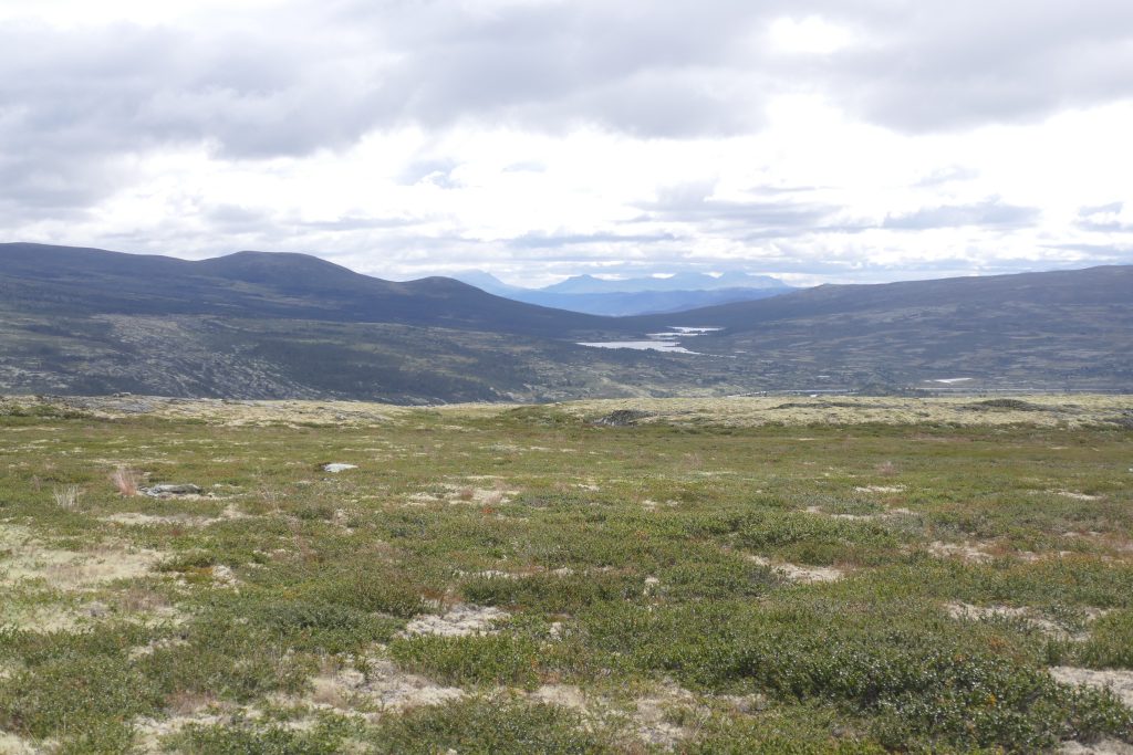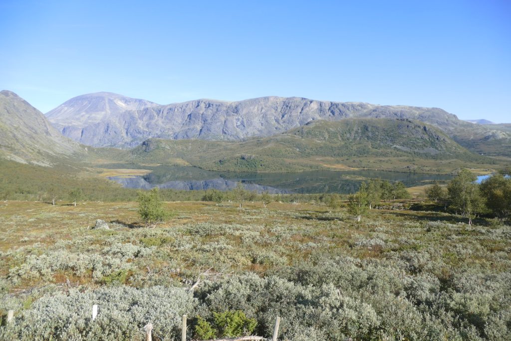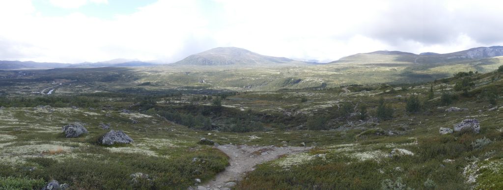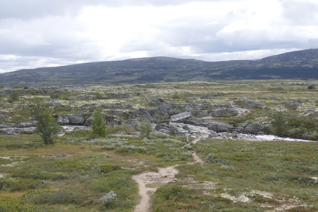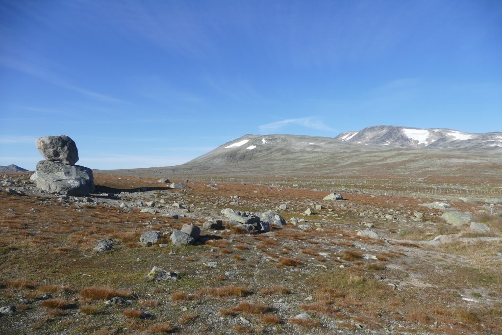 Am Morgen haben wir unglaubliche 4° C. Die letzte Nacht hat es geregnet und die Gipfel der Berge sind weiß eingezuckert. Von Oppdal fahren wir auf der E6 weiter in Richtung Süden. Hier kommen wir durch das Tal Åmotsdalen. Dann erreichen wir den Dovrefjell-Sunndalsfjella-Nasjonalpark. Am gebührenpflichtigen Parkplatz Kongsvold Fjeldstue, den wir per Internet bezahlen können, parken wir und starten zur Wanderung auf dem Moskusstien – Moschusochsenweg. Es ist ein angelegtes Wegenetz, mit verschieden langen Wanderwegen, auf denen die Chance besteht, die gewaltigen Tiere zu Gesicht zu bekommen. Wir überqueren die Straße und schon geht es bergauf, erst durch lichten Birkenwald, dann durch eine baumlose Landschaft auf dem Plateau. Eigentlich die perfekte Rundumsicht mit den Bergen im Hintergrund. Immer wieder halten wir Ausschau nach den Moschusochsen – vergeblich. Auch andere Wanderer haben keine Sichtungen. Wir erreichen die Straße bei Grønbakken und gehen auf der gegenüberliegenden Seite hinter den Schneezäunen entlang bis zum Parkplatz Jøroskloppa. Hier folgen wir dem Kongevegen Pilgerweg, der bergauf ins Hinterland führt. Der Kongevegen ist ein 100 km langer Pilgerweg über das Dovrefjell von der Dovre-Kirche bis zur Oppdal-Kirche. Mittlerweile müssen wir uns beeilen, da unsere angegebene Parkdauer abläuft. Am Wohnmobil angekommen, fahren wir zum Parkplatz Jøroskloppa, wo wir die Nacht bleiben.