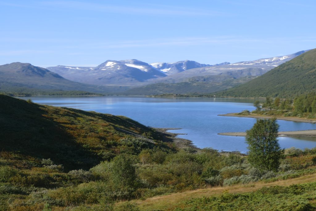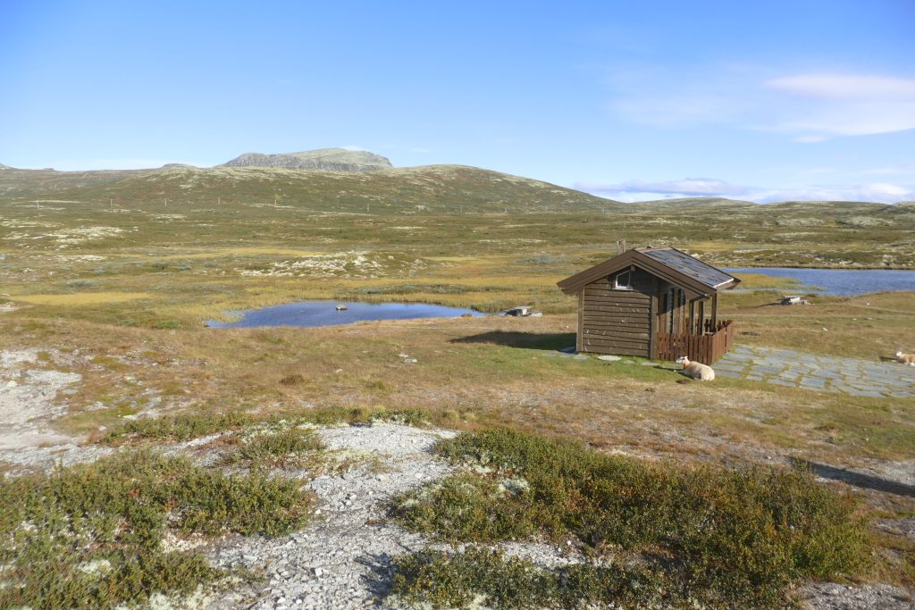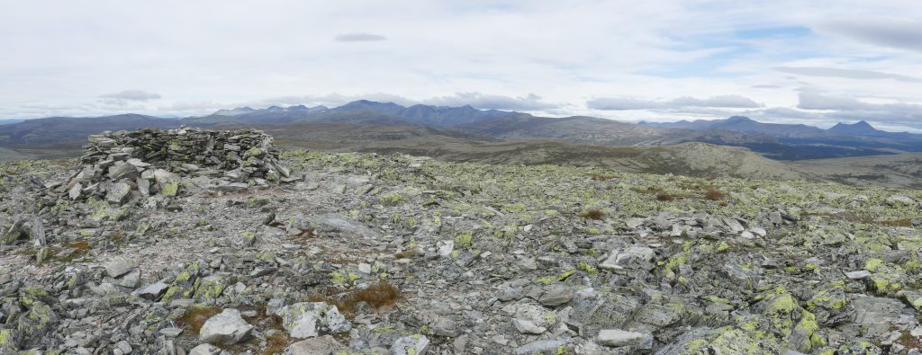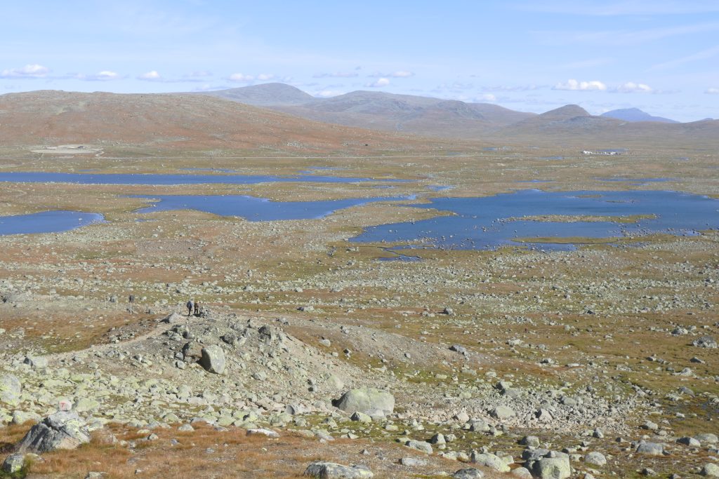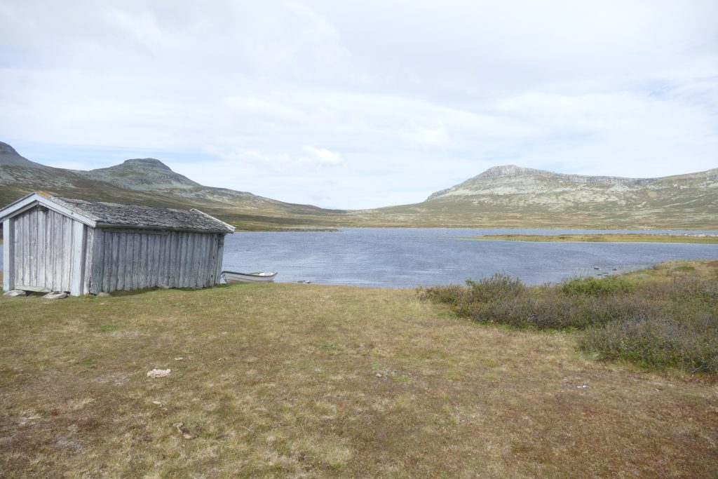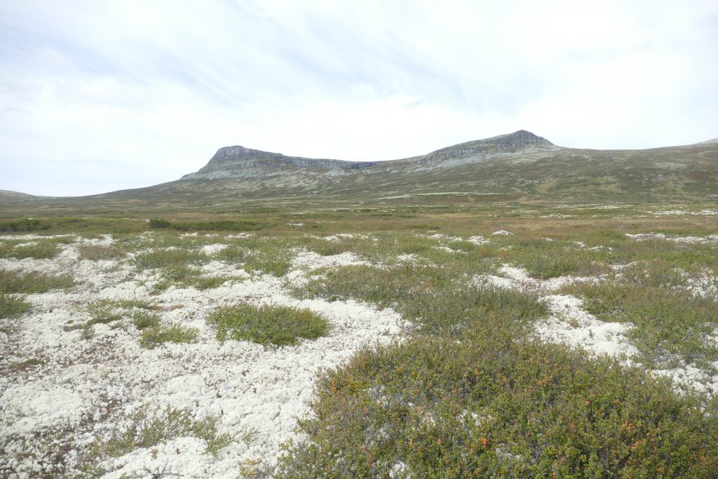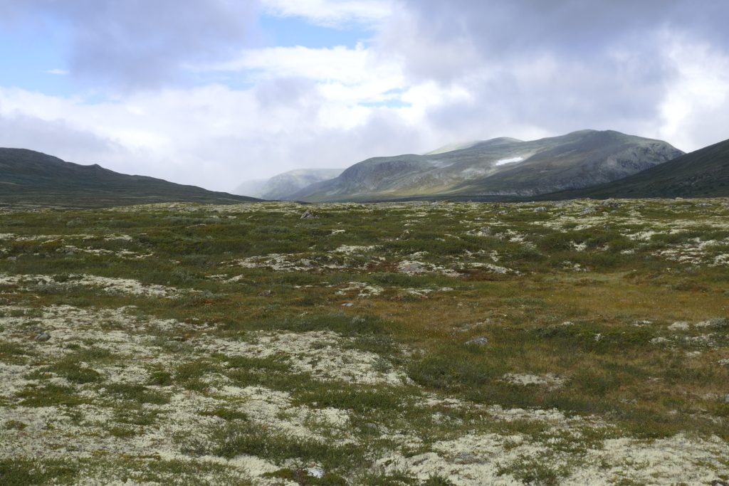 Am Morgen haben wir unglaubliche 4° C. Die letzte Nacht hat es geregnet und die Gipfel der Berge sind weiß eingezuckert. Von Oppdal fahren wir auf der E6 weiter in Richtung Süden. Hier kommen wir durch das Tal Åmotsdalen. Dann erreichen wir den Dovrefjell-Sunndalsfjella-Nasjonalpark. Am gebührenpflichtigen Parkplatz Kongsvold Fjeldstue, den wir per Internet bezahlen können, parken wir und starten zur Wanderung auf dem Moskusstien – Moschusochsenweg. Es ist ein angelegtes Wegenetz, mit verschieden langen Wanderwegen, auf denen die Chance besteht, die gewaltigen Tiere zu Gesicht zu bekommen. Wir überqueren die Straße und schon geht es bergauf, erst durch lichten Birkenwald, dann durch eine baumlose Landschaft auf dem Plateau. Eigentlich die perfekte Rundumsicht mit den Bergen im Hintergrund. Immer wieder halten wir Ausschau nach den Moschusochsen – vergeblich. Auch andere Wanderer haben keine Sichtungen. Wir erreichen die Straße bei Grønbakken und gehen auf der gegenüberliegenden Seite hinter den Schneezäunen entlang bis zum Parkplatz Jøroskloppa. Hier folgen wir dem Kongevegen Pilgerweg, der bergauf ins Hinterland führt. Der Kongevegen ist ein 100 km langer Pilgerweg über das Dovrefjell von der Dovre-Kirche bis zur Oppdal-Kirche. Mittlerweile müssen wir uns beeilen, da unsere angegebene Parkdauer abläuft. Am Wohnmobil angekommen, fahren wir zum Parkplatz Jøroskloppa, wo wir die Nacht bleiben.