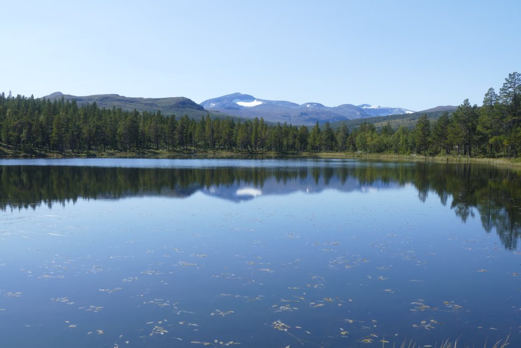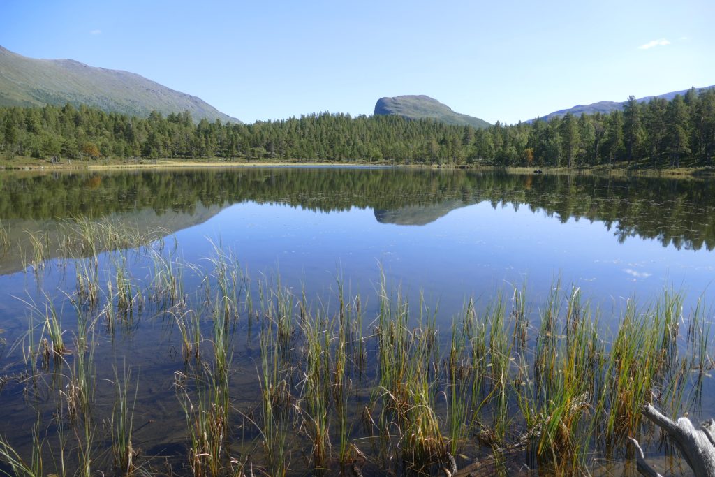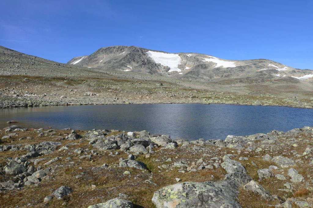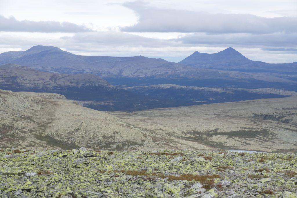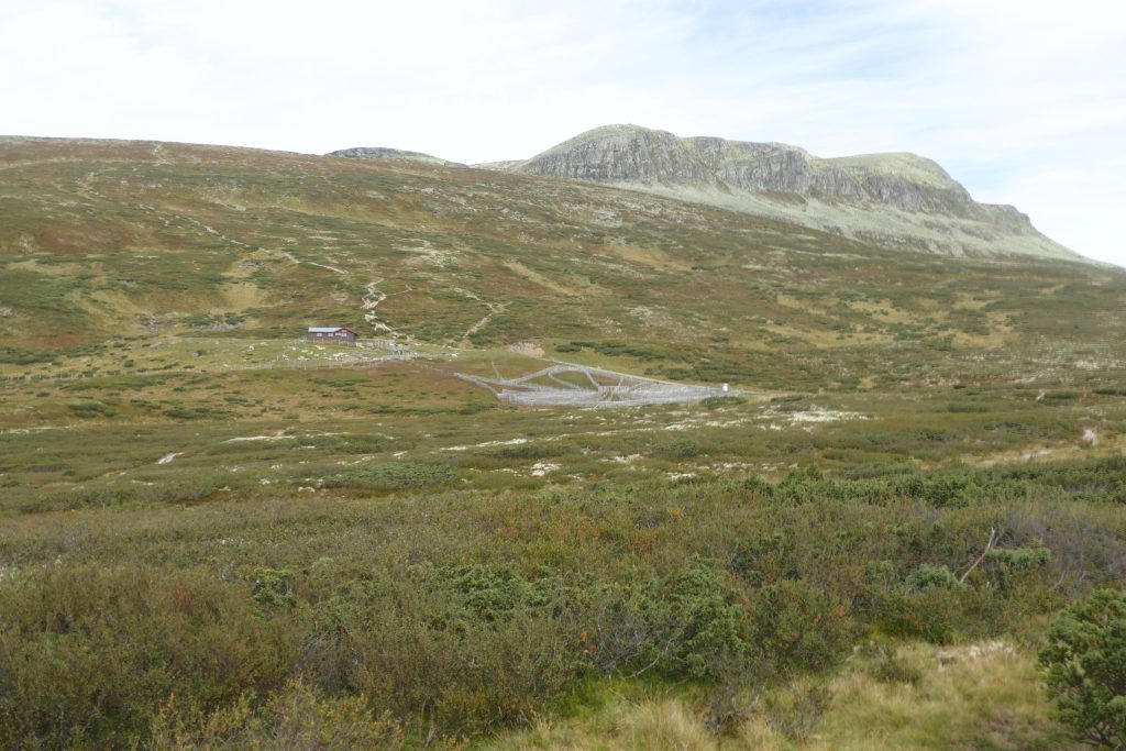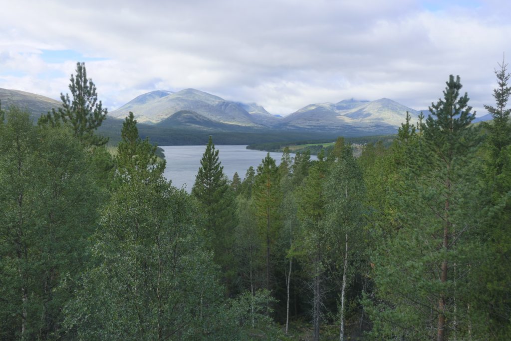 Am Morgen haben wir unglaubliche 4° C. Die letzte Nacht hat es geregnet und die Gipfel der Berge sind weiß eingezuckert. Von Oppdal fahren wir auf der E6 weiter in Richtung Süden. Hier kommen wir durch das Tal Åmotsdalen. Dann erreichen wir den Dovrefjell-Sunndalsfjella-Nasjonalpark. Am gebührenpflichtigen Parkplatz Kongsvold Fjeldstue, den wir per Internet bezahlen können, parken wir und starten zur Wanderung auf dem Moskusstien – Moschusochsenweg. Es ist ein angelegtes Wegenetz, mit verschieden langen Wanderwegen, auf denen die Chance besteht, die gewaltigen Tiere zu Gesicht zu bekommen. Wir überqueren die Straße und schon geht es bergauf, erst durch lichten Birkenwald, dann durch eine baumlose Landschaft auf dem Plateau. Eigentlich die perfekte Rundumsicht mit den Bergen im Hintergrund. Immer wieder halten wir Ausschau nach den Moschusochsen – vergeblich. Auch andere Wanderer haben keine Sichtungen. Wir erreichen die Straße bei Grønbakken und gehen auf der gegenüberliegenden Seite hinter den Schneezäunen entlang bis zum Parkplatz Jøroskloppa. Hier folgen wir dem Kongevegen Pilgerweg, der bergauf ins Hinterland führt. Der Kongevegen ist ein 100 km langer Pilgerweg über das Dovrefjell von der Dovre-Kirche bis zur Oppdal-Kirche. Mittlerweile müssen wir uns beeilen, da unsere angegebene Parkdauer abläuft. Am Wohnmobil angekommen, fahren wir zum Parkplatz Jøroskloppa, wo wir die Nacht bleiben.