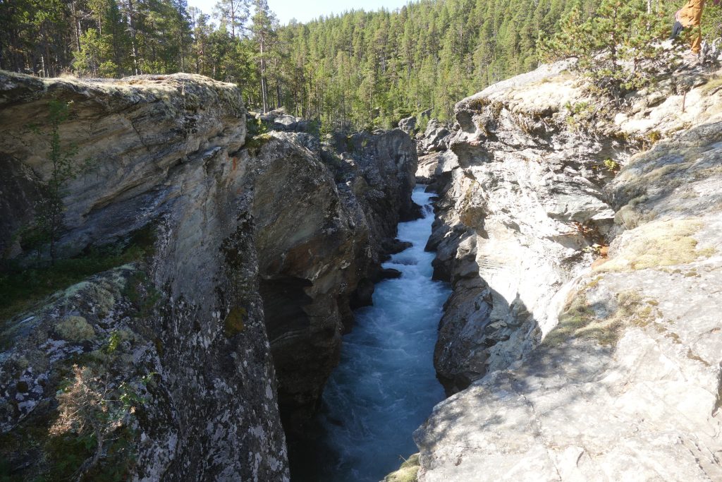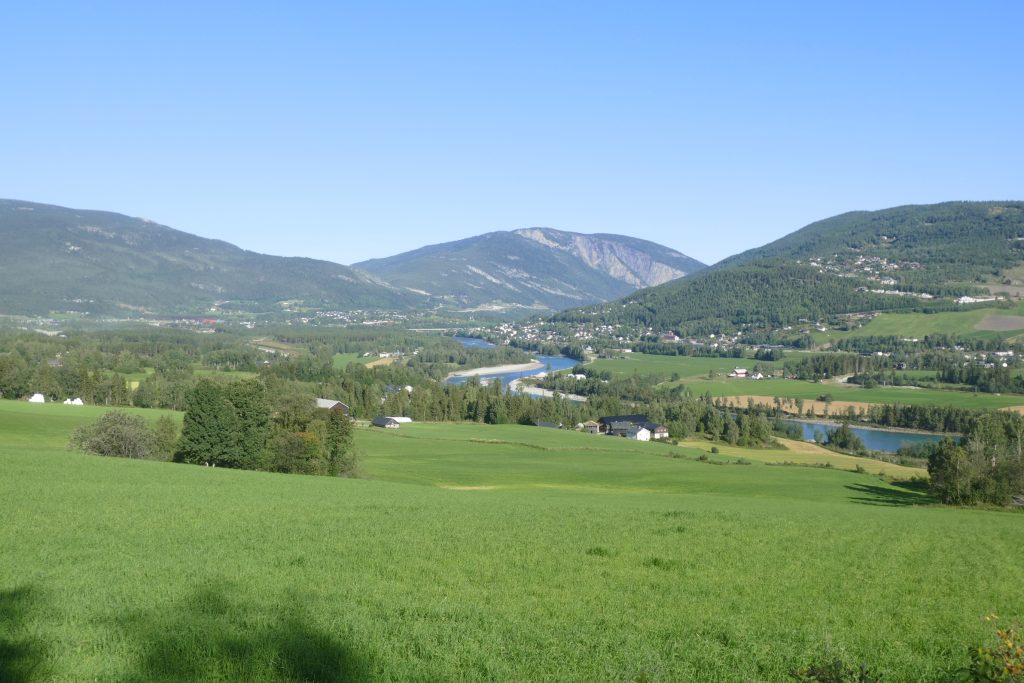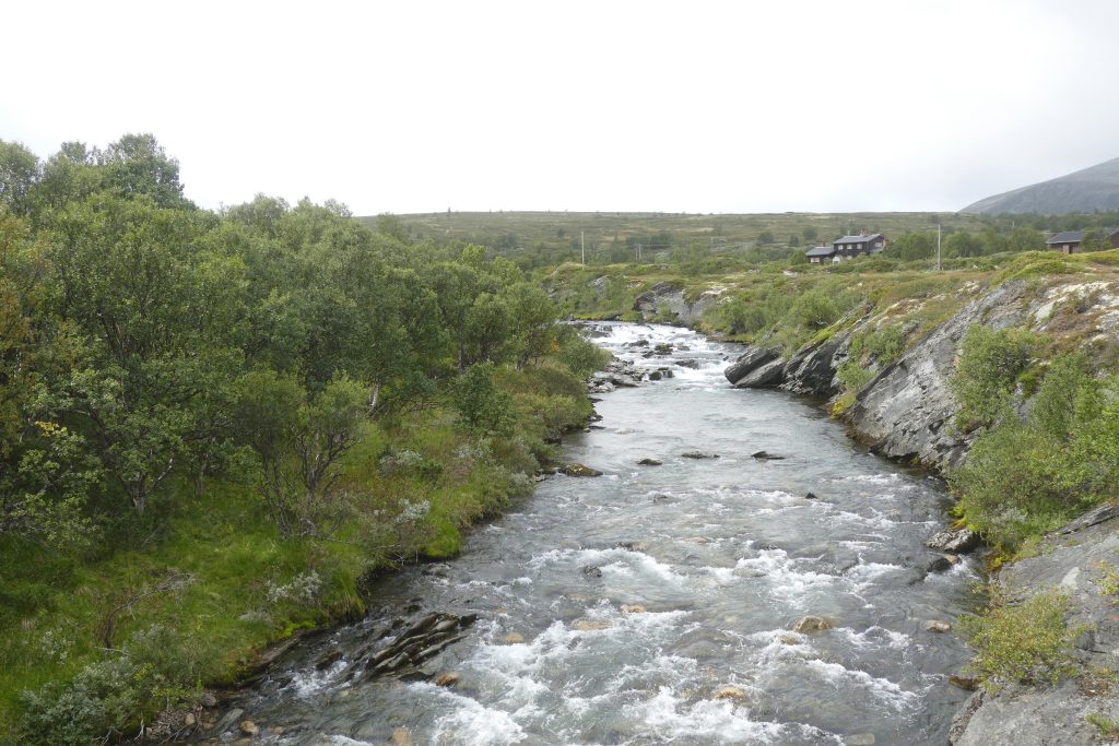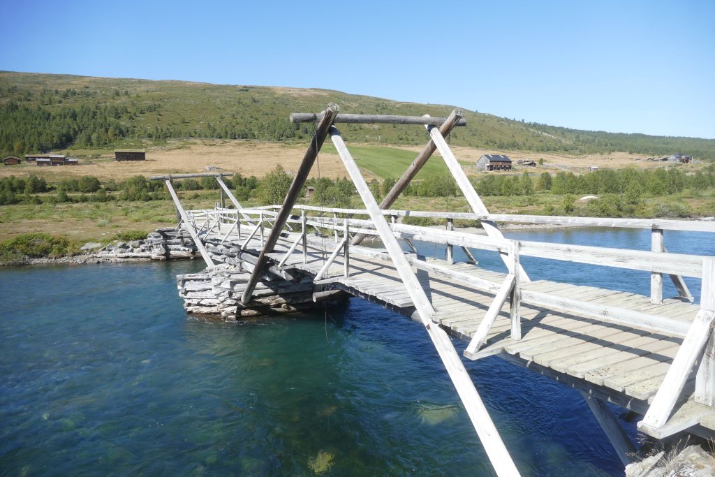 Die Nacht war laut zwischen Hauptstraße und Bahngleisen. Heute ist ein Bilderbuchwetter mit blauem Himmel, wie man ihn sich wünscht. Wir fahren in westliche Richtung bewusst auf einer kleinen Straße und kommen durch eine traumhafte Landschaft mit Bauernhöfen und sanften Hügeln, immer entlang des unwirklich türkisfarbenen Flusses. Vor Otta biegen wir auf die 257 ab bis Randsverk. Unterwegs halten wir an der 1941 geweihten Heidal Kirke. Dann folgen wir der Fv15 und sind nach wenigen Kilometern bei Hindsæter auf der Hochebene am Einfallstor in den Jotunheimen-Nationalpark auf der Landschaftsroute Valdresflye. Am Schild Ridderspranget parken wir an der Schlucht. Der Fluss Sjøa hat hier eine tiefe Schlucht durch Sjødalen gegraben, über die, so die Legende, ein mittelalterlicher Ritter sprang, um seine Geliebte zu retten. Noch vor dem ersten Rastplatz der Landschaftsroute kommen wir zu einem Wanderparkplatz. Wir sehen uns die Wanderung Hulderstigen an und machen uns auf den ca. 5,5 km langen einfachen Weg, auf dem sich 16 Hinweisschilder, auch in Deutsch, mit interessanten Informationen über lokale Themen befinden. Einen schönen Blick haben wir bei unserer Wanderung auf den 2258 m hohen Besshø. Da wir hier nicht über Nacht bleiben können, fahren wir noch 2 km weiter zu einem kleinen Parkplatz direkt am Fluss.