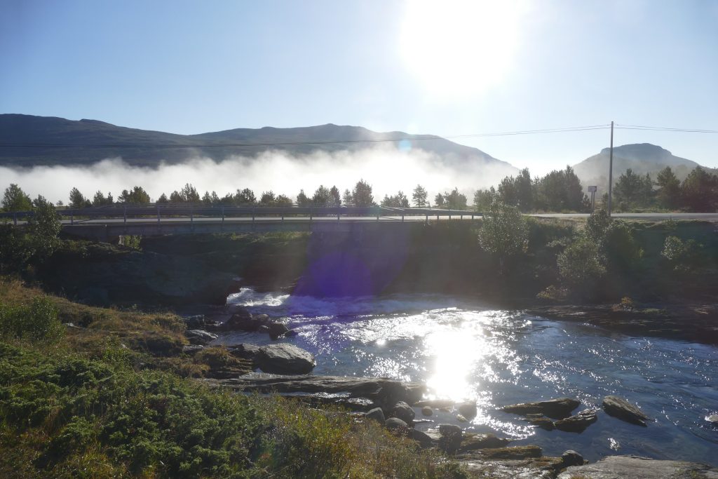 Dichter Nebel liegt über der Landschaft. Wir fahren weiter in Richtung Süden, immer entlang des Randsfjorden und erreichen nach ca. 100 km Hønefossen. Der Wasserfall Hønefossen, an dem wir vorbeikommen, hat seit 1337, als der erste industrielle Betrieb in Form einer Mühle entstand, große Bedeutung für die Entwicklung der Stadt und für ihre Einwohner.