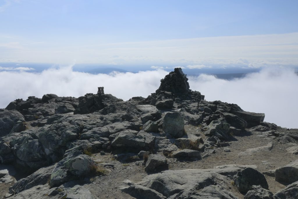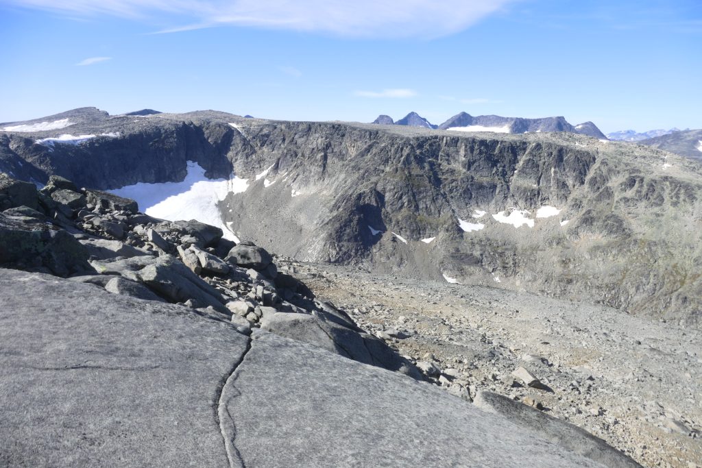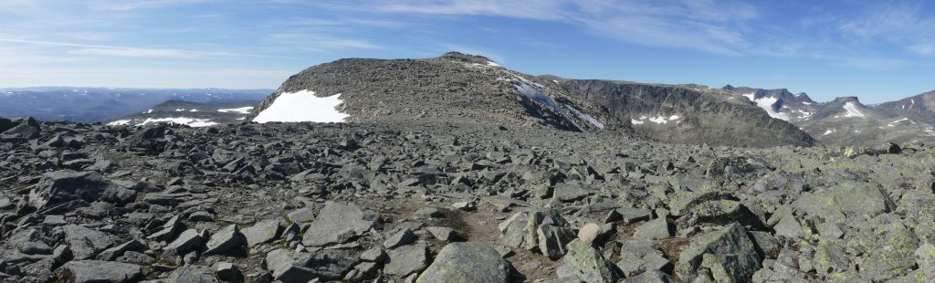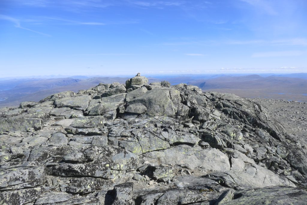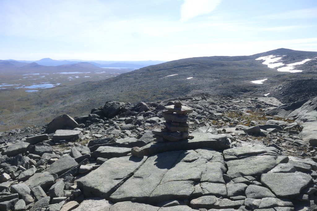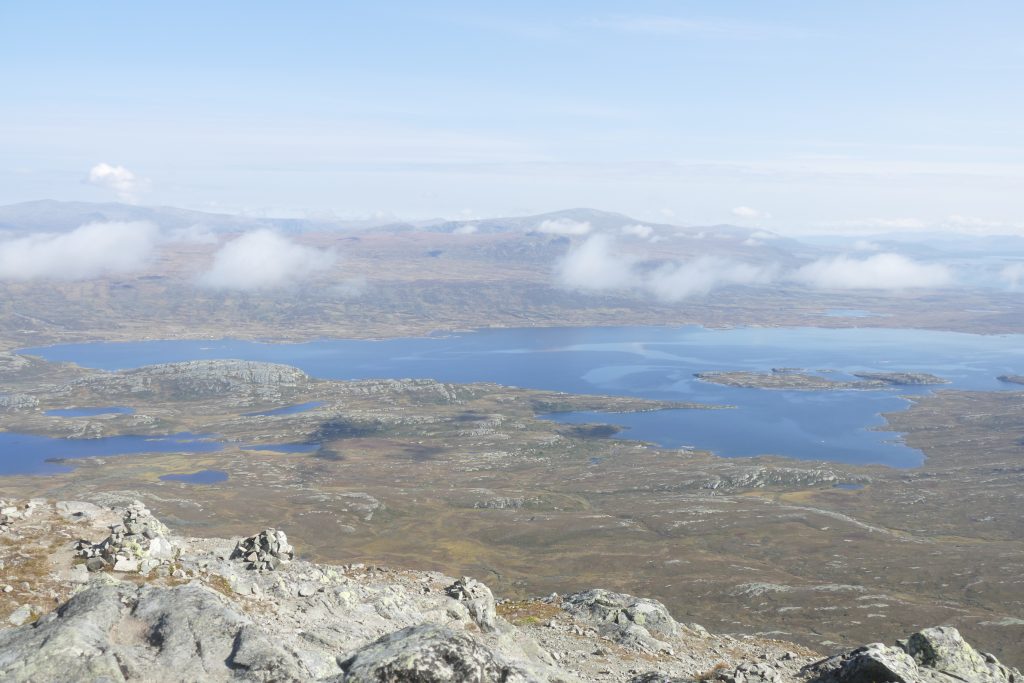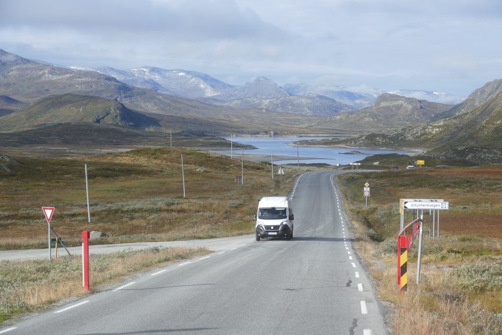 Am Morgen liegt Raureif über der Landschaft und Nebelschwaden hängen in den Bergen. Es war die Nacht – 0,5° C. Die Sonne schickt schon ihre wärmenden Strahlen als wir auf der Landschaftsroute Valdresflye mit weitläufigem Blick auf die Berge weiterfahren. Am ansteigenden Abschnitt der Straße am Gebirgspass zwischen Valdres und Gudbrandsdalen befindet sich der Rastplatz Vargebakkane. Wir machen kurz Fotostopp, da kein freier Parkplatz vorhanden ist. Die beiden Steinblöcke „Rock on Top of Another Rock“ symbolisieren die typischen Steinpyramiden, die als Wegmarkierung dienen. Der höchste Punkt der Valdresflye ist der Flye 1389 mit einem grandiosen 360° Rundumblick. Wir sehen die Wanderschilder und entscheiden uns für den Aufstieg auf den Rasletinden. Es ist zwar eine rote Tour, doch da sie linear ist, kann man ja jederzeit abbrechen. Der Rasletinden ist der einfachste 2000er-Gipfel in Norwegen. Das Bilderbuchwetter passt. Zunächst überqueren wir die karge und steinige Fjell Landschaft, teilweise über Holzstege bis zu einer Anhöhe mit einem Bergsee, in dem sich die Schneefelder des Rasletinden spiegeln. Dann müssen wir über ein grün schimmerndes Geröllfeld, bevor der eigentliche Anstieg über Felsbrocken mit kurzer Kraxelei beginnt. Das Bergpanorama der Riesen von Jotunheimen ist imposant, sodass wir immer wieder Fotostopps einlegen. Wir springen von Felsen zu Felsen und suchen die Markierungen. Der Weg will kein Ende nehmen. Als wir ein Stück flaches Gelände überqueren, sehen wir den Gipfel in noch ca. 1 km vor uns liegen. Dann ist es geschafft und wir genießen den berauschenden 360° Panoramablick über die Berge mit Schnee- und Eisfeldern. Welch Glück wir heute auch mit dem Wetter haben. Dann treten wir den Rückweg auf demselben Weg an uns kommen nach ca. 6 Stunden und fast 18 km wieder zum Parkplatz. Da hier campen verboten ist, fahren wir ca. 2 km zurück und parken mit Blick auf Rock on Top of Another Rock.