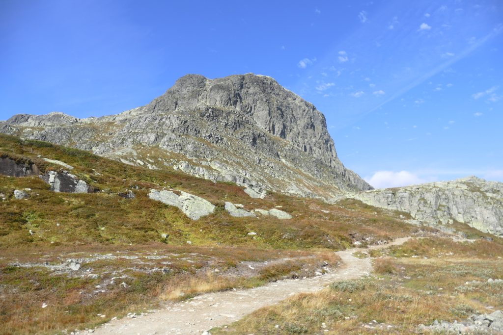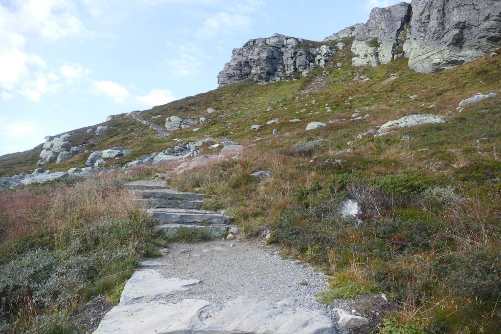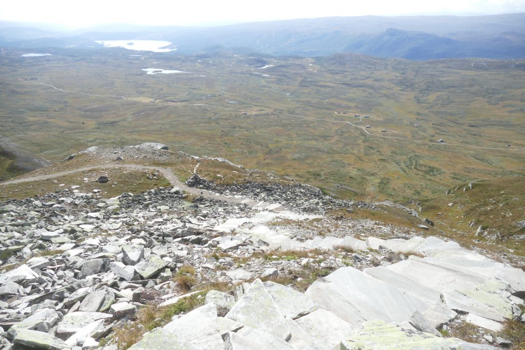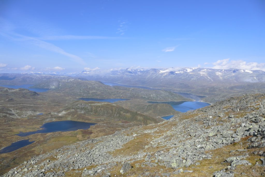 Am Morgen sind wir in den Wolken, als wir weiter in Richtung Süden fahren. Schon bald lichten sich die Wolken und geben den Blick auf die grandiose Landschaft frei. Wir wollen heute auf den 1607 m hohen Bitihorn wandern. Doch es gibt keinen geeigneten Parkplatz am Ausgangspunkt der Wanderung und der Berggipfel versteckt sich noch. So fahren wir ein Stück weiter und sehen ein Schild mit der Aufschrift Bitihødntrøppe. Einen ca. 1,8 km langen Aufstieg über 460 Höhenmeter auf den Bitihorn über Sherpatreppen. Kurz entschlossen machen wir uns auf den Weg. Es ist nicht ganz einfach den richtigen Weg zu finden, da das Gelände zum Teil stark erodiert ist. Doch schließlich sind wir auf dem Gipfel mit grandioser Aussicht auf die Zweitausender des Jotunheimen Nationalpark. Unter uns die blauen Seen und die Sonne hat alle Wolken weggefegt. Dann fahren wir ein Stück weiter nach Breitostølen, wo wir einkaufen und nach der nächsten Apotheke fragen. 40 km in südliche Richtung, 200 km zum nächsten Krankenhaus – erfahren wir. Wir sehen uns unterwegs die Hegge Stavkirke an und fahren nach Fragenes. Hier kann uns nicht geholfen werden, wir sollen bis Hønefoss fahren. Unterwegs biegen wir von der E16 ab auf die 33, die als landschaftlich schöne Straße ausgewiesen ist und parken bei Bjørgo.