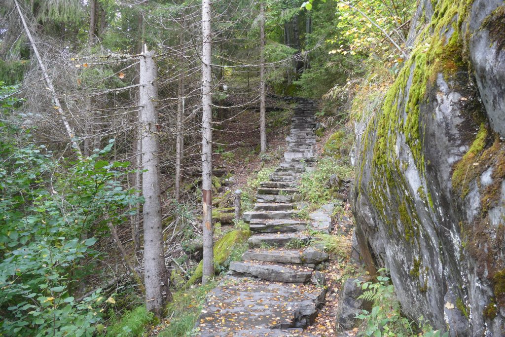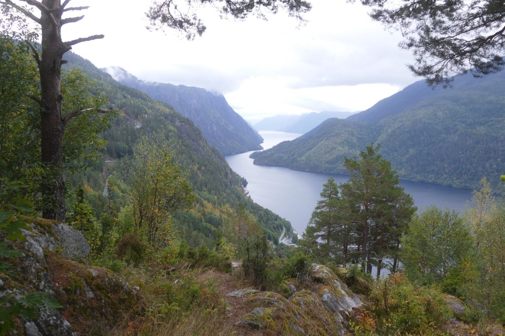 Der Wald trieft vor Nässe, als wir weiter fahren. Die Landschaft verändert sich und immer mehr Berge kommen hinter den Wolken zum Vorschein. Der Telemarkkanal endet in Dalen und wird von Passagierschiffen angefahren. Bevor wir den Ort erreichen, machen wir Halt an der Eidsborg Stavkyrkje. In Dalen starten wir zur Wanderung Rui Plassen, einer 1 km langen Wanderung. Über eine Treppe mit 810 Stufen, die Sherpas aus Nepal erbaut haben, überwinden wir 200 Höhenmeter bis zu den Spuren der Rui-Mädchen aus Dalen. Wir erreichen den ehemaligen Bauernhof und nehmen den steil ansteigenden Weg in Richtung Eidsborg. Am Aussichtspunkt Hamaren haben wir einen schönen Blick auf Dalen. Kurz darauf brechen wir jedoch die Wanderung ab, da der Weg zu rutschig wird. Nach der Wanderung suchen wir noch einen Platz für die Übernachtung, was sich etwas schwierig gestaltet. Doch dann finden wir einen Platz direkt am Fluss.
