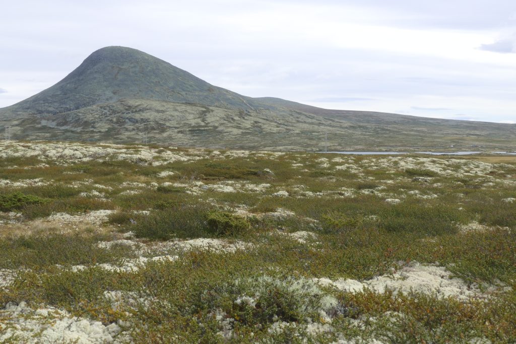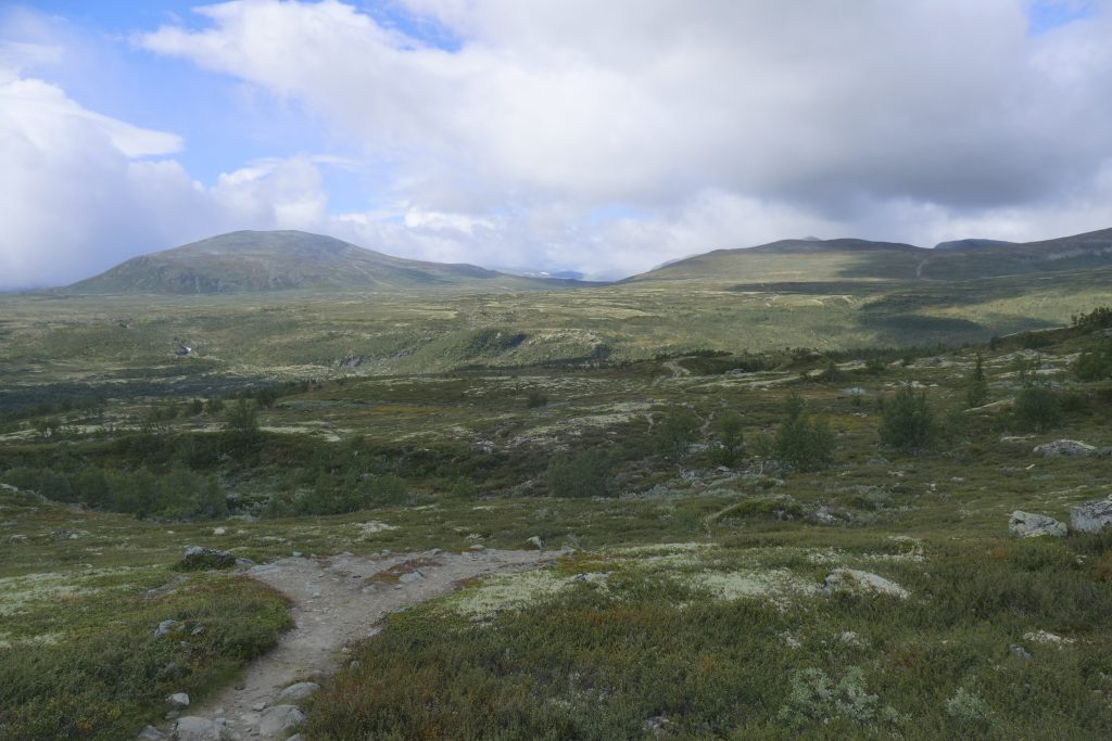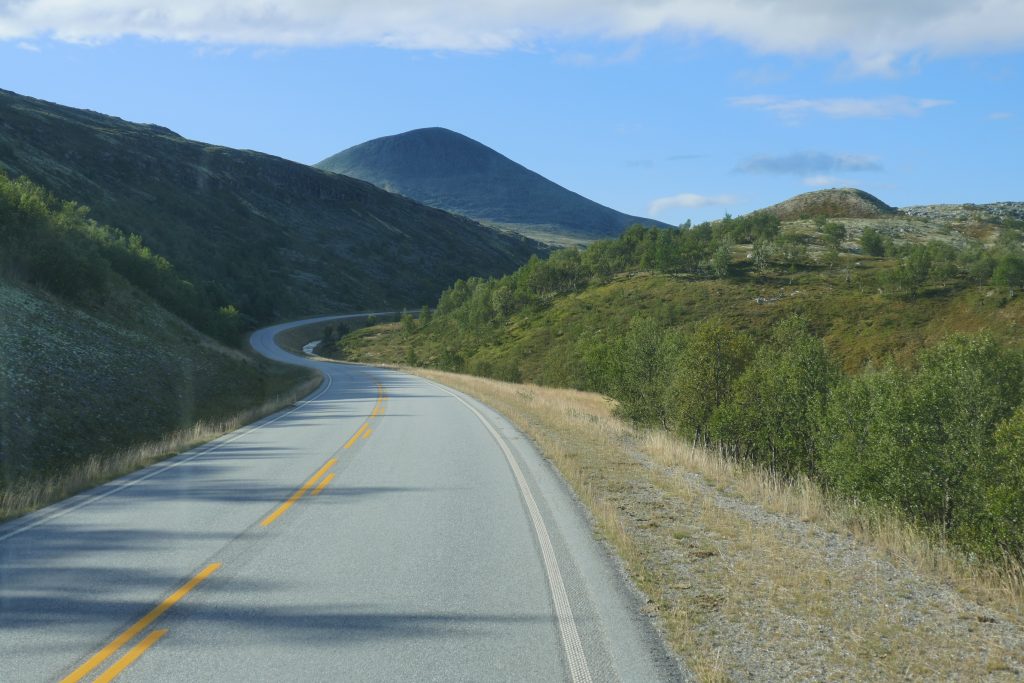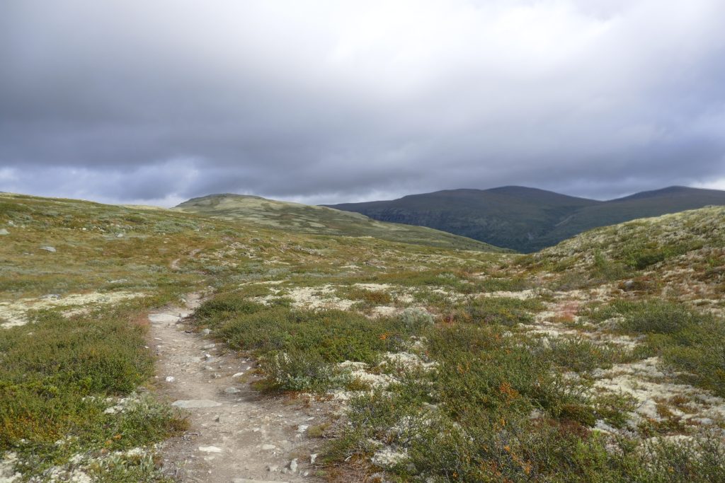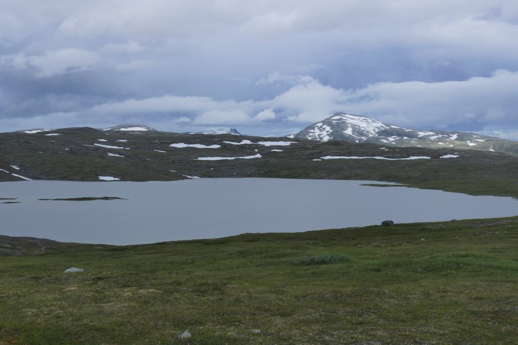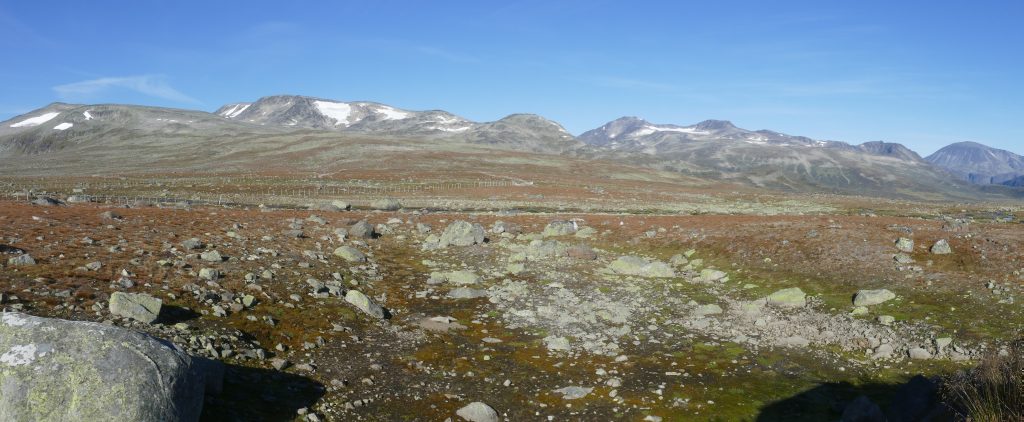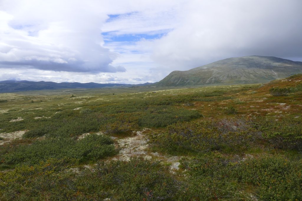 Am Morgen haben wir unglaubliche 4° C. Die letzte Nacht hat es geregnet und die Gipfel der Berge sind weiß eingezuckert. Von Oppdal fahren wir auf der E6 weiter in Richtung Süden. Hier kommen wir durch das Tal Åmotsdalen. Dann erreichen wir den Dovrefjell-Sunndalsfjella-Nasjonalpark. Am gebührenpflichtigen Parkplatz Kongsvold Fjeldstue, den wir per Internet bezahlen können, parken wir und starten zur Wanderung auf dem Moskusstien – Moschusochsenweg. Es ist ein angelegtes Wegenetz, mit verschieden langen Wanderwegen, auf denen die Chance besteht, die gewaltigen Tiere zu Gesicht zu bekommen. Wir überqueren die Straße und schon geht es bergauf, erst durch lichten Birkenwald, dann durch eine baumlose Landschaft auf dem Plateau. Eigentlich die perfekte Rundumsicht mit den Bergen im Hintergrund. Immer wieder halten wir Ausschau nach den Moschusochsen – vergeblich. Auch andere Wanderer haben keine Sichtungen. Wir erreichen die Straße bei Grønbakken und gehen auf der gegenüberliegenden Seite hinter den Schneezäunen entlang bis zum Parkplatz Jøroskloppa. Hier folgen wir dem Kongevegen Pilgerweg, der bergauf ins Hinterland führt. Der Kongevegen ist ein 100 km langer Pilgerweg über das Dovrefjell von der Dovre-Kirche bis zur Oppdal-Kirche. Mittlerweile müssen wir uns beeilen, da unsere angegebene Parkdauer abläuft. Am Wohnmobil angekommen, fahren wir zum Parkplatz Jøroskloppa, wo wir die Nacht bleiben.