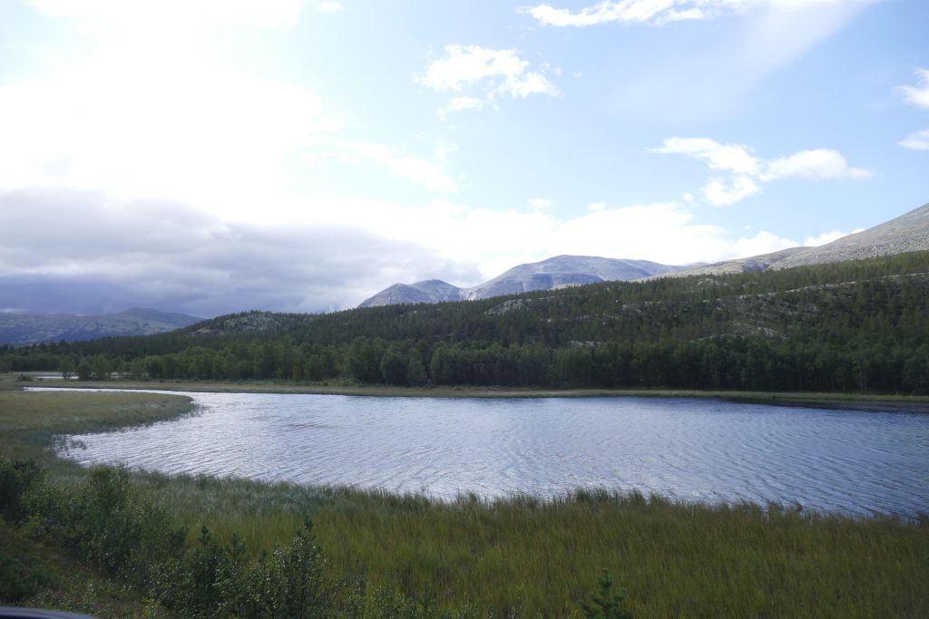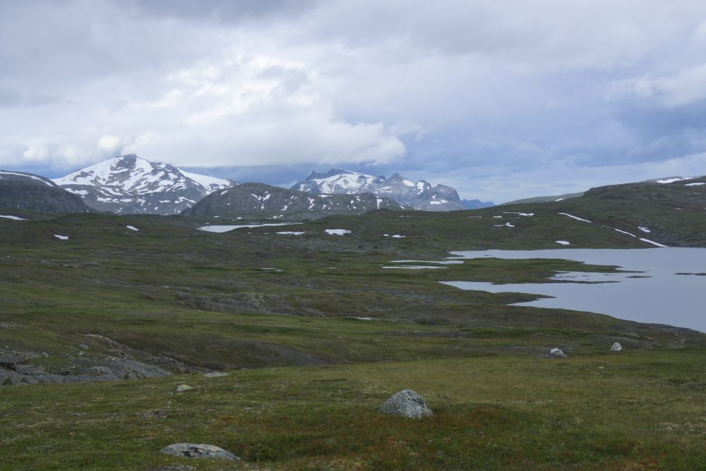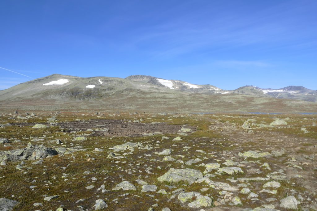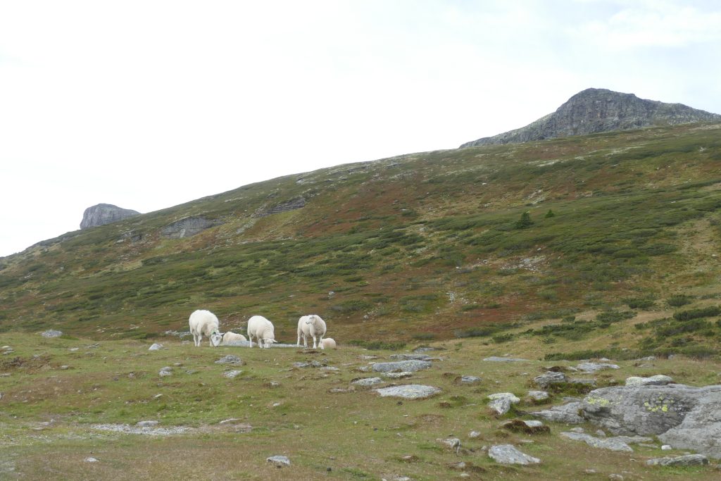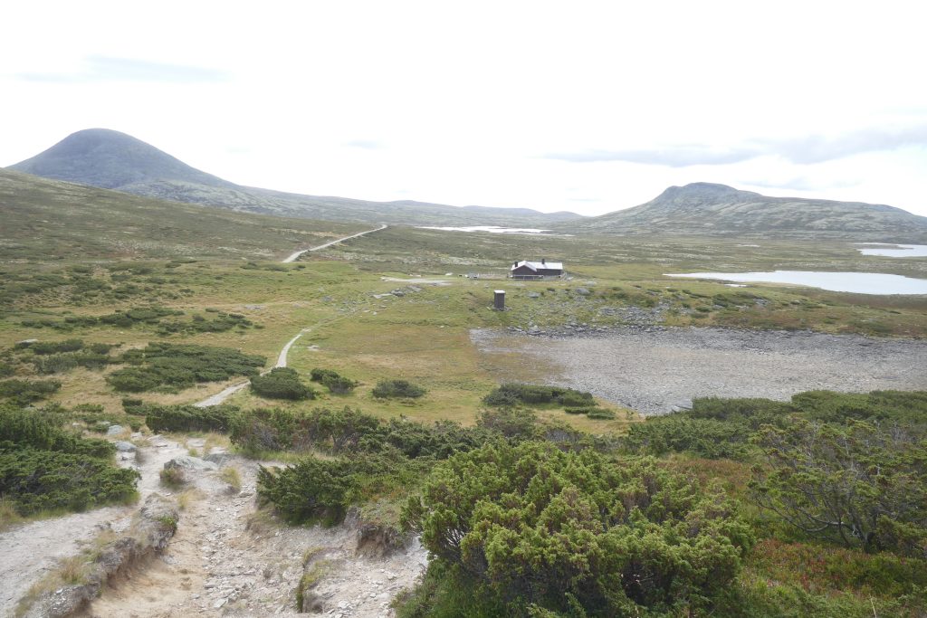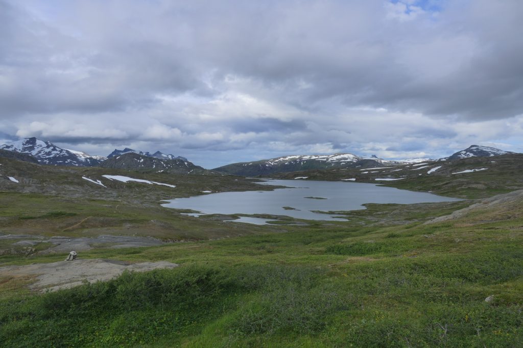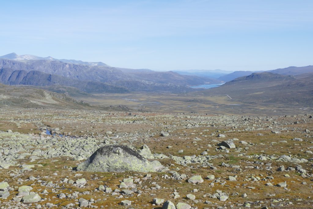 Am Morgen haben wir unglaubliche 4° C. Die letzte Nacht hat es geregnet und die Gipfel der Berge sind weiß eingezuckert. Von Oppdal fahren wir auf der E6 weiter in Richtung Süden. Hier kommen wir durch das Tal Åmotsdalen. Dann erreichen wir den Dovrefjell-Sunndalsfjella-Nasjonalpark. Am gebührenpflichtigen Parkplatz Kongsvold Fjeldstue, den wir per Internet bezahlen können, parken wir und starten zur Wanderung auf dem Moskusstien – Moschusochsenweg. Es ist ein angelegtes Wegenetz, mit verschieden langen Wanderwegen, auf denen die Chance besteht, die gewaltigen Tiere zu Gesicht zu bekommen. Wir überqueren die Straße und schon geht es bergauf, erst durch lichten Birkenwald, dann durch eine baumlose Landschaft auf dem Plateau. Eigentlich die perfekte Rundumsicht mit den Bergen im Hintergrund. Immer wieder halten wir Ausschau nach den Moschusochsen – vergeblich. Auch andere Wanderer haben keine Sichtungen. Wir erreichen die Straße bei Grønbakken und gehen auf der gegenüberliegenden Seite hinter den Schneezäunen entlang bis zum Parkplatz Jøroskloppa. Hier folgen wir dem Kongevegen Pilgerweg, der bergauf ins Hinterland führt. Der Kongevegen ist ein 100 km langer Pilgerweg über das Dovrefjell von der Dovre-Kirche bis zur Oppdal-Kirche. Mittlerweile müssen wir uns beeilen, da unsere angegebene Parkdauer abläuft. Am Wohnmobil angekommen, fahren wir zum Parkplatz Jøroskloppa, wo wir die Nacht bleiben.