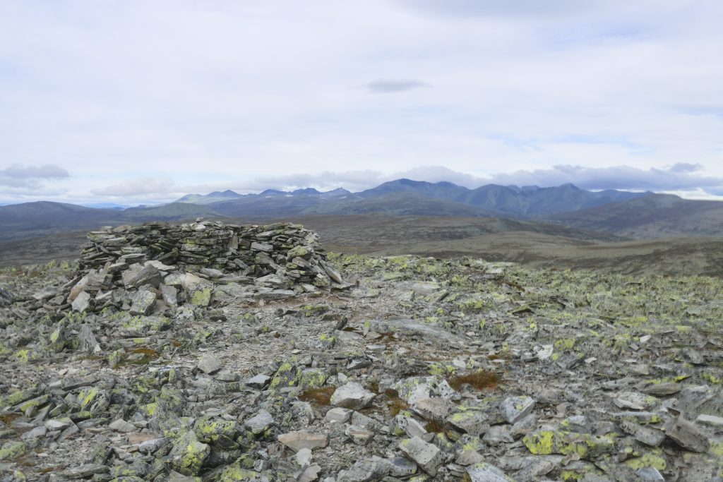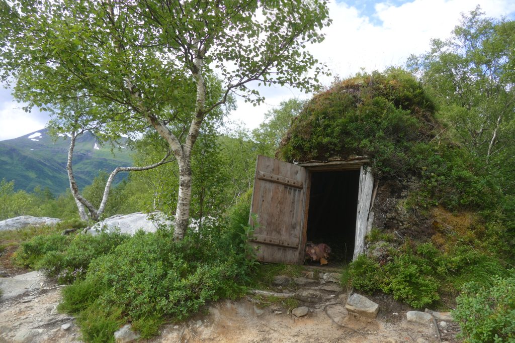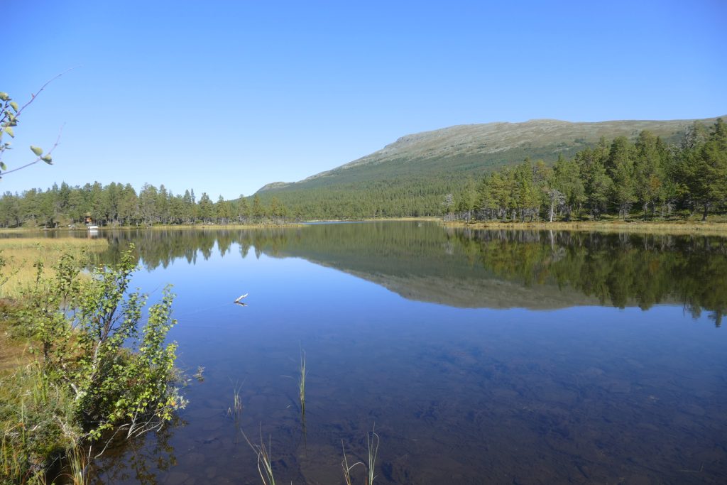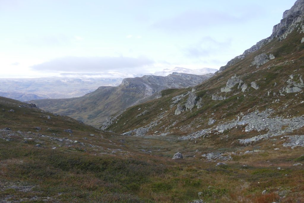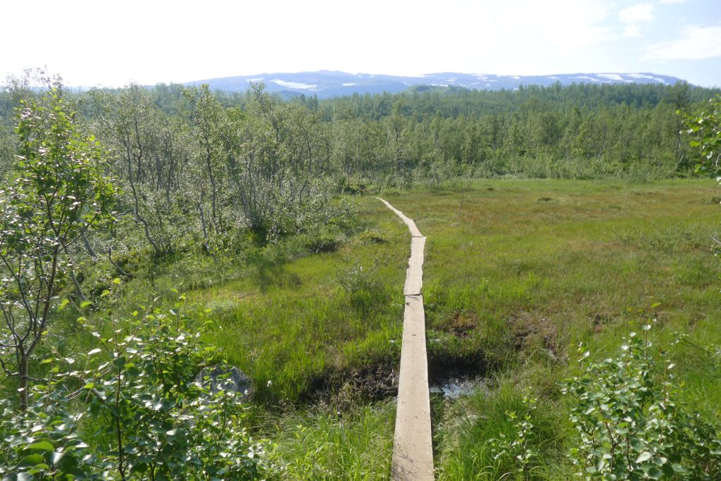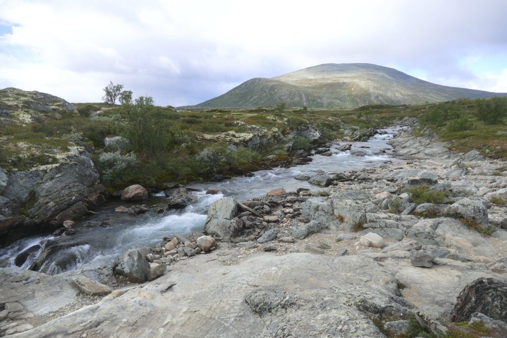 Am Morgen haben wir unglaubliche 4° C. Die letzte Nacht hat es geregnet und die Gipfel der Berge sind weiß eingezuckert. Von Oppdal fahren wir auf der E6 weiter in Richtung Süden. Hier kommen wir durch das Tal Åmotsdalen. Dann erreichen wir den Dovrefjell-Sunndalsfjella-Nasjonalpark. Am gebührenpflichtigen Parkplatz Kongsvold Fjeldstue, den wir per Internet bezahlen können, parken wir und starten zur Wanderung auf dem Moskusstien – Moschusochsenweg. Es ist ein angelegtes Wegenetz, mit verschieden langen Wanderwegen, auf denen die Chance besteht, die gewaltigen Tiere zu Gesicht zu bekommen. Wir überqueren die Straße und schon geht es bergauf, erst durch lichten Birkenwald, dann durch eine baumlose Landschaft auf dem Plateau. Eigentlich die perfekte Rundumsicht mit den Bergen im Hintergrund. Immer wieder halten wir Ausschau nach den Moschusochsen – vergeblich. Auch andere Wanderer haben keine Sichtungen. Wir erreichen die Straße bei Grønbakken und gehen auf der gegenüberliegenden Seite hinter den Schneezäunen entlang bis zum Parkplatz Jøroskloppa. Hier folgen wir dem Kongevegen Pilgerweg, der bergauf ins Hinterland führt. Der Kongevegen ist ein 100 km langer Pilgerweg über das Dovrefjell von der Dovre-Kirche bis zur Oppdal-Kirche. Mittlerweile müssen wir uns beeilen, da unsere angegebene Parkdauer abläuft. Am Wohnmobil angekommen, fahren wir zum Parkplatz Jøroskloppa, wo wir die Nacht bleiben.