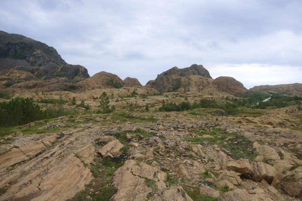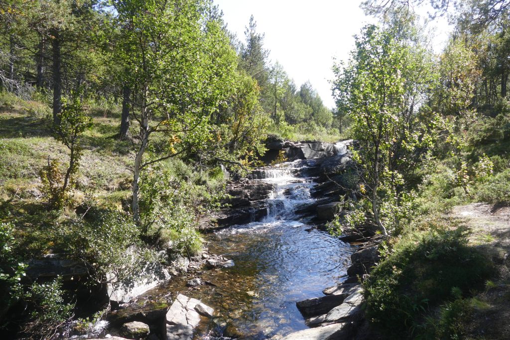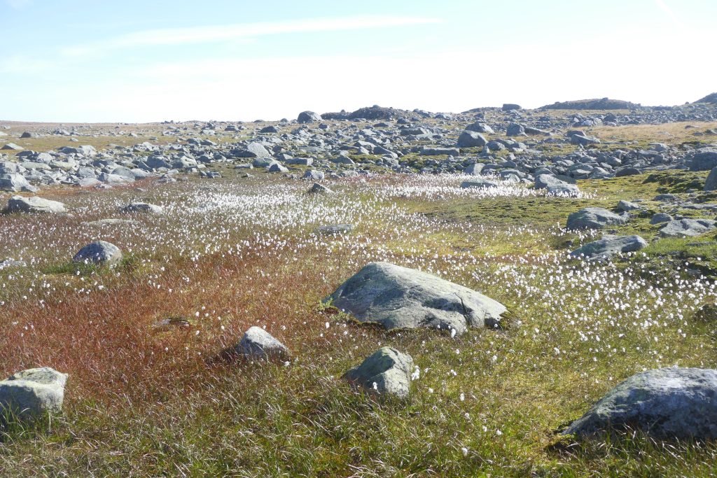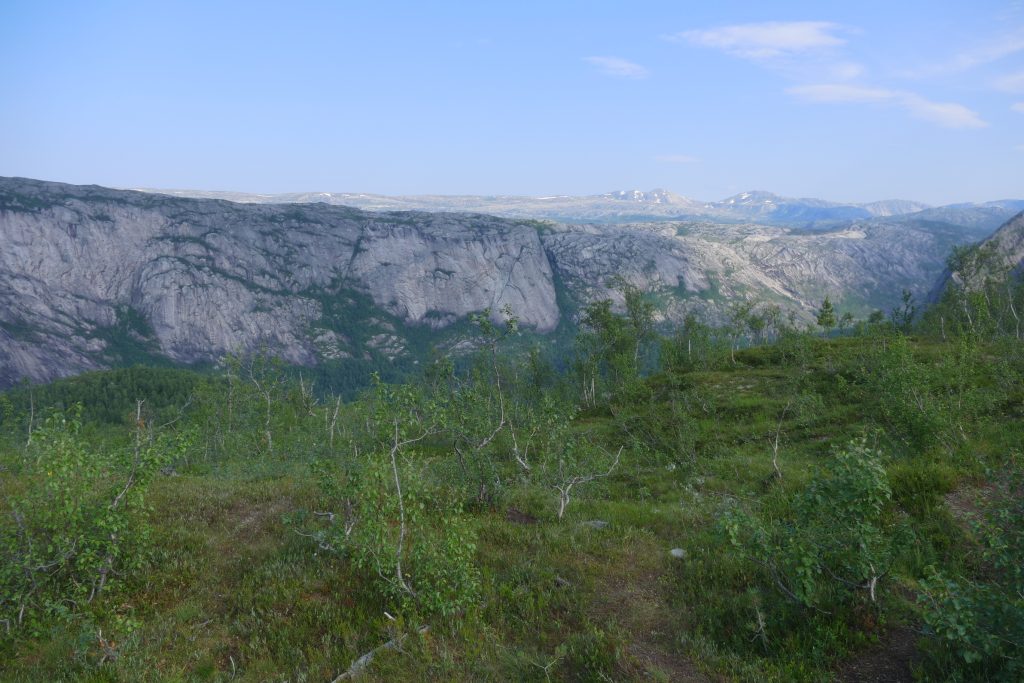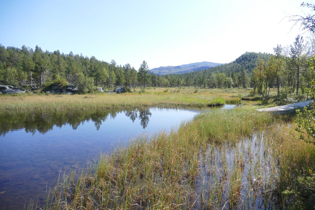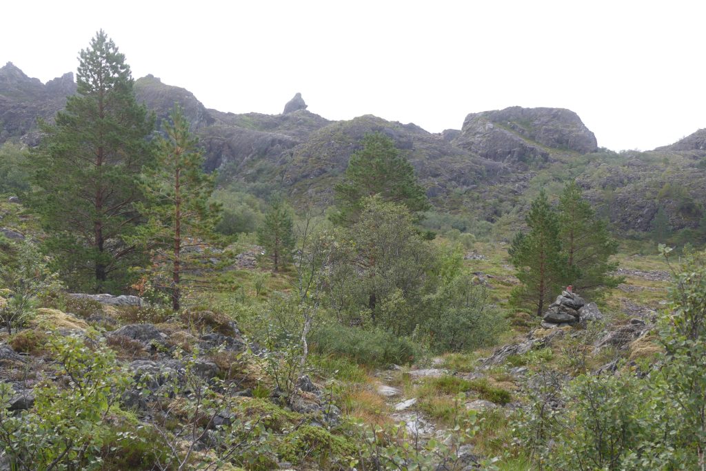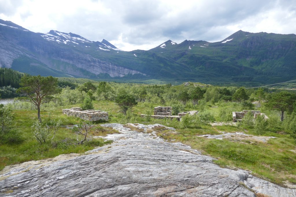 Am Morgen haben wir unglaubliche 4° C. Die letzte Nacht hat es geregnet und die Gipfel der Berge sind weiß eingezuckert. Von Oppdal fahren wir auf der E6 weiter in Richtung Süden. Hier kommen wir durch das Tal Åmotsdalen. Dann erreichen wir den Dovrefjell-Sunndalsfjella-Nasjonalpark. Am gebührenpflichtigen Parkplatz Kongsvold Fjeldstue, den wir per Internet bezahlen können, parken wir und starten zur Wanderung auf dem Moskusstien – Moschusochsenweg. Es ist ein angelegtes Wegenetz, mit verschieden langen Wanderwegen, auf denen die Chance besteht, die gewaltigen Tiere zu Gesicht zu bekommen. Wir überqueren die Straße und schon geht es bergauf, erst durch lichten Birkenwald, dann durch eine baumlose Landschaft auf dem Plateau. Eigentlich die perfekte Rundumsicht mit den Bergen im Hintergrund. Immer wieder halten wir Ausschau nach den Moschusochsen – vergeblich. Auch andere Wanderer haben keine Sichtungen. Wir erreichen die Straße bei Grønbakken und gehen auf der gegenüberliegenden Seite hinter den Schneezäunen entlang bis zum Parkplatz Jøroskloppa. Hier folgen wir dem Kongevegen Pilgerweg, der bergauf ins Hinterland führt. Der Kongevegen ist ein 100 km langer Pilgerweg über das Dovrefjell von der Dovre-Kirche bis zur Oppdal-Kirche. Mittlerweile müssen wir uns beeilen, da unsere angegebene Parkdauer abläuft. Am Wohnmobil angekommen, fahren wir zum Parkplatz Jøroskloppa, wo wir die Nacht bleiben.
